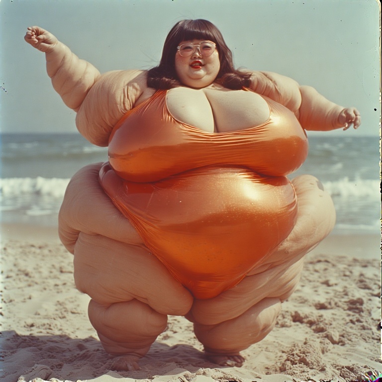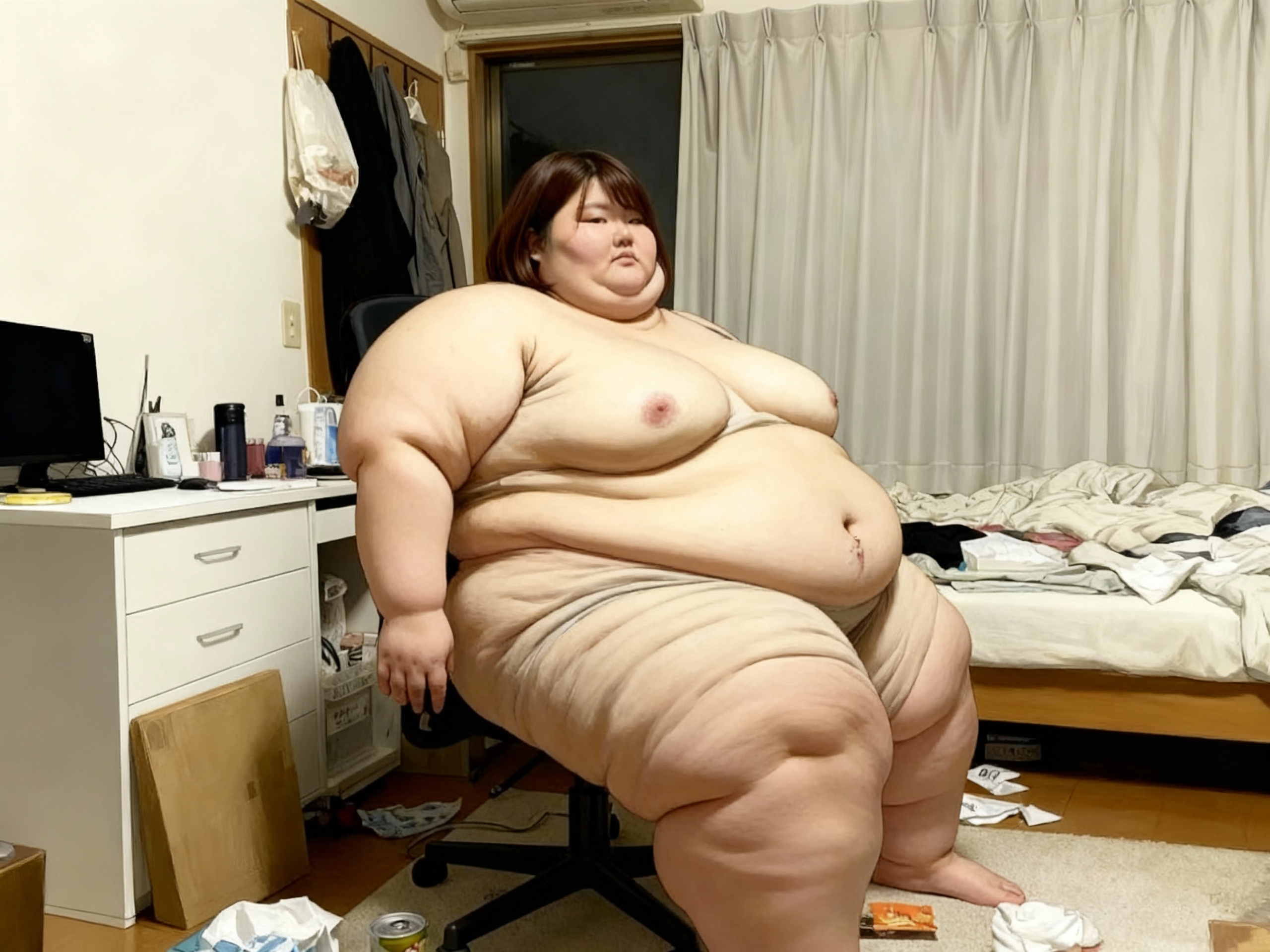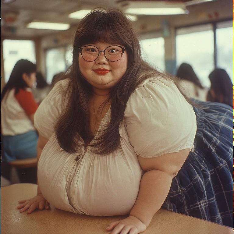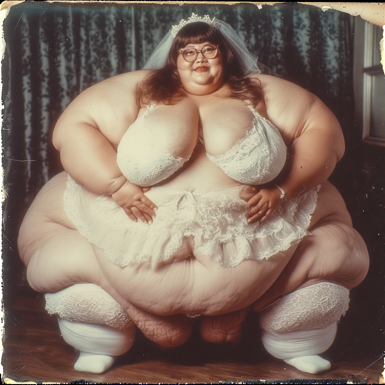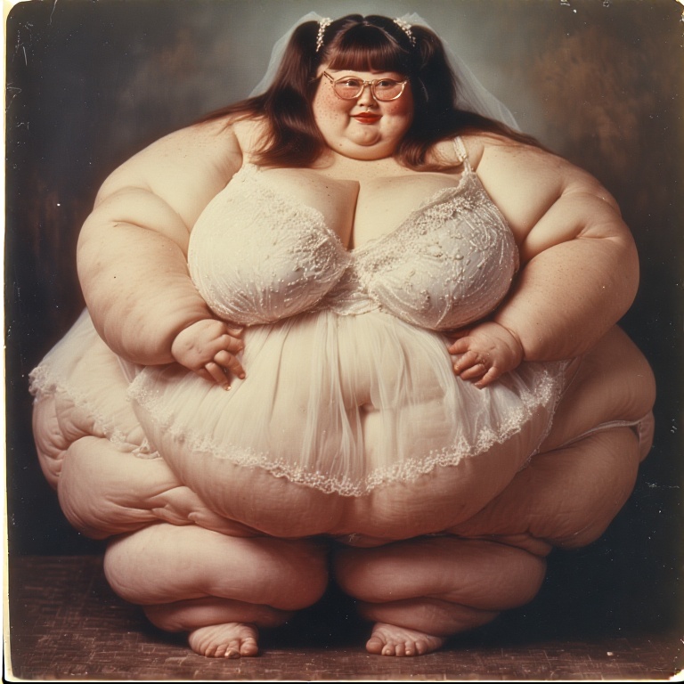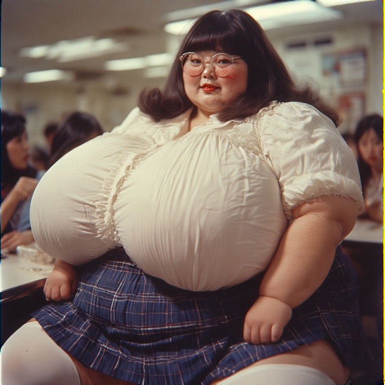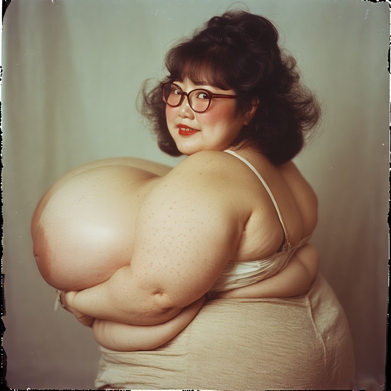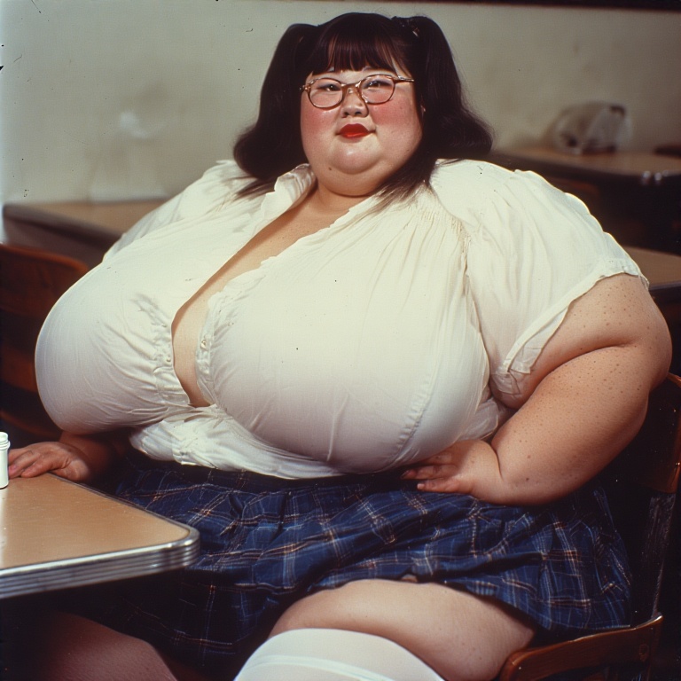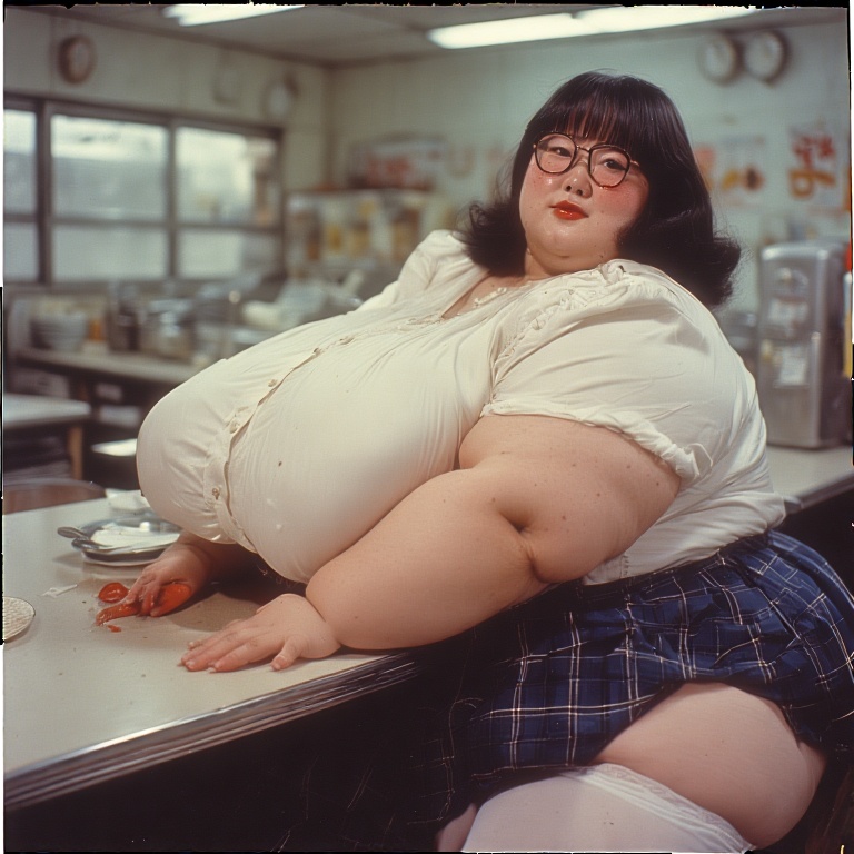 Subject & Features: PHOTOREALISTIC 35MM PHOTO. A candid full-body shot of an extremely obese young Korean woman, weighing 650 lbs. Her face is cute and nerdy with a happy expression, and she has black hair styled in two enormous, fluffy pigtails. Her enormous, soft belly hangs low, cascading in thick, pillowy rolls over her hips, with deep folds and creases defining her midsection, her skin featuring subtle, natural lines that add to its softness and a hint of natural texture with faint cellulite dimpling. Her arms are massively fat, resembling huge soft pillows with flesh spilling over her elbows in distinct, heavy layers, the skin exhibiting a gentle, uneven pattern with noticeable cellulite, marked by small, irregular dimples and a slightly puckered surface. Her thighs, hips, and calves are enormously large, defined by deep rolls, a soft, wavy texture with vivid cellulite displaying prominent, deep-set dimples, a pebbled texture with a honeycomb-like pattern, and squishy qualities that jiggle with every movement. Her cankles are preposterously pudgy, merging into her feet, with a smooth yet slightly varied skin texture accented by pronounced cellulite dimples and a rippled appearance, and her tree-trunk legs appear both heavy and tender.