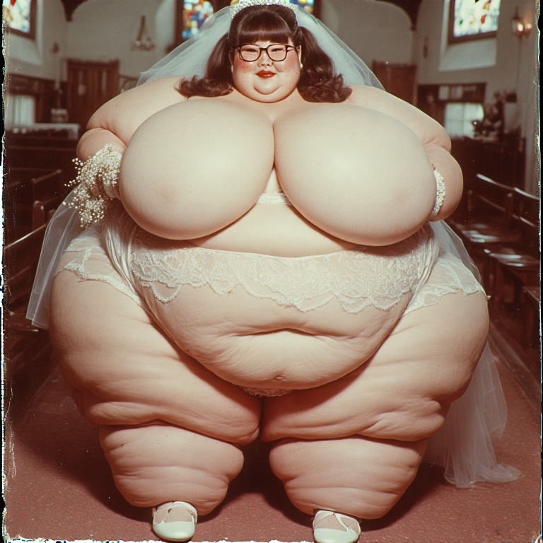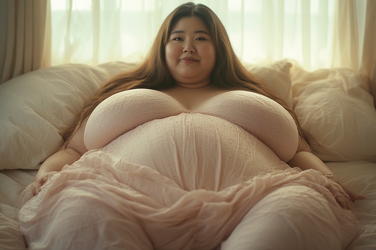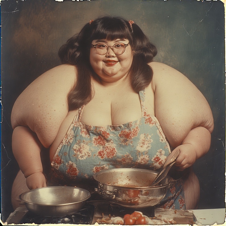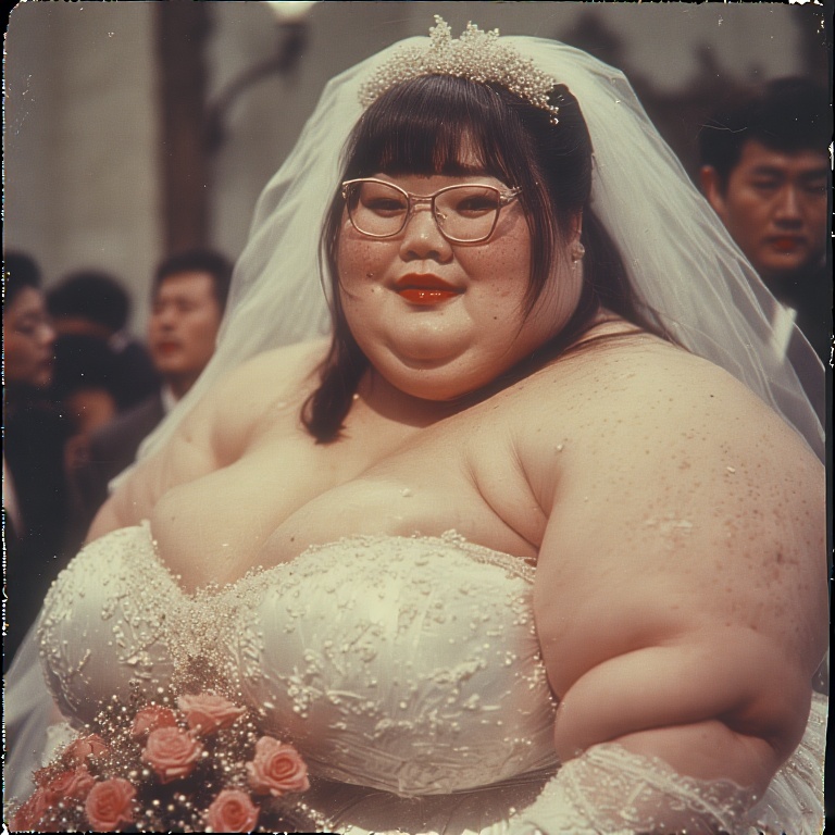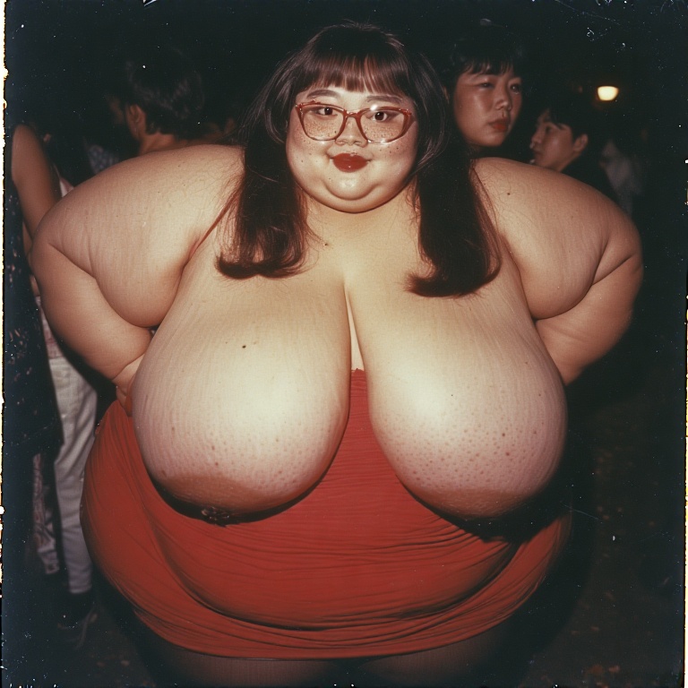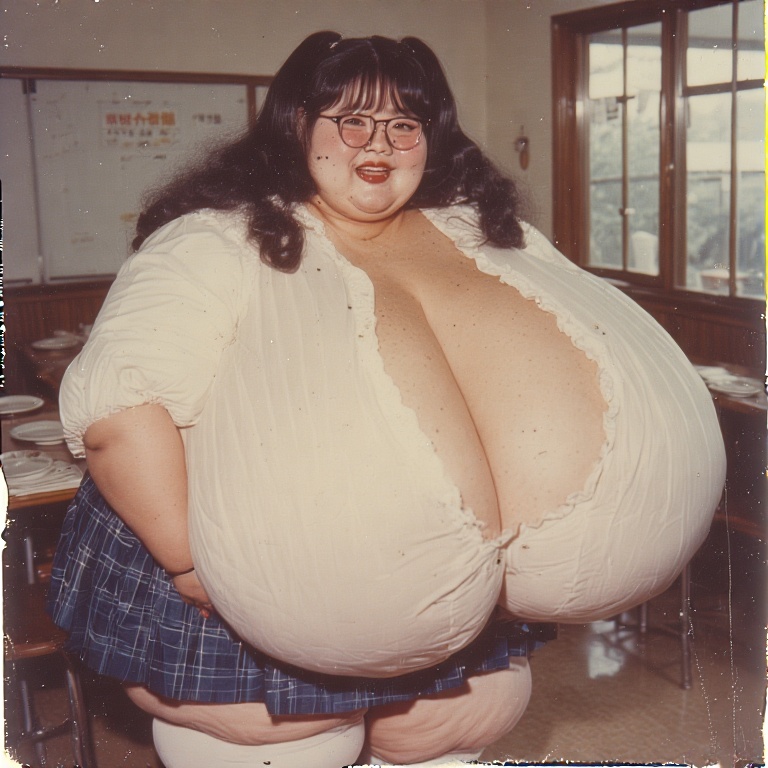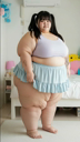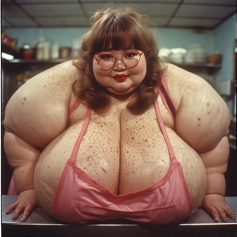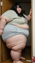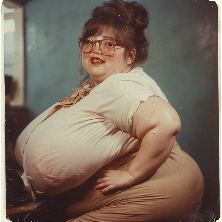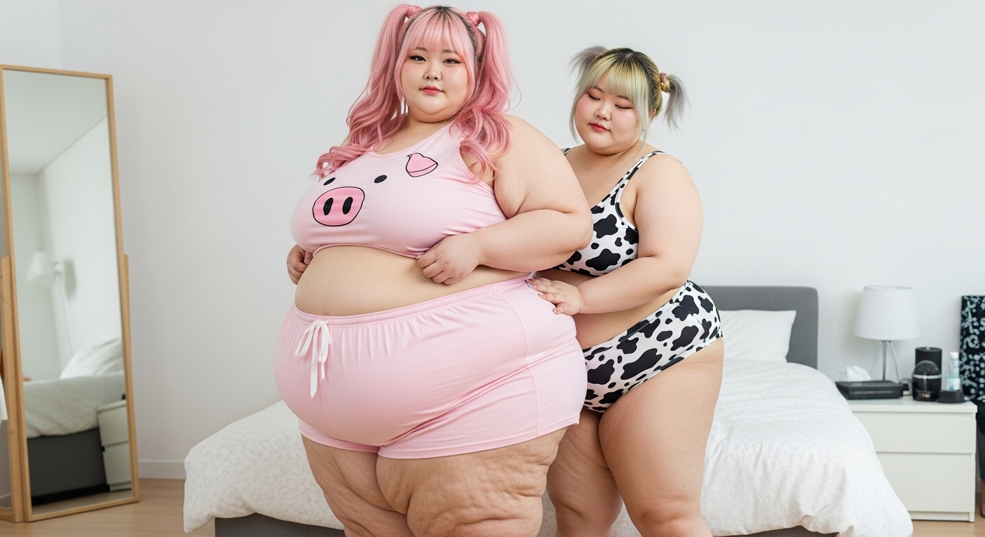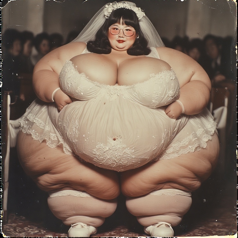 Subject & Features: PHOTOREALISTIC 35MM PHOTO. A candid full-body shot of an extremely obese young Korean woman, weighing 650 lbs. Her face is cute and nerdy with a happy expression, and she has black hair styled in two enormous, fluffy pigtails. Her enormous, soft belly hangs low, cascading in thick, pillowy rolls over her hips, with deep folds and creases defining her midsection, her skin featuring subtle, natural lines that add to its softness and a hint of natural texture with faint cellulite dimpling. Her arms are massively fat, resembling huge soft pillows with flesh spilling over her elbows in distinct, heavy layers, the skin exhibiting a gentle, uneven pattern with noticeable cellulite, marked by small, irregular dimples and a slightly puckered surface. Her thighs, hips, and calves are enormously large, defined by deep rolls, a soft, wavy texture with vivid cellulite displaying prominent, deep-set dimples, a pebbled texture with a honeycomb-like pattern, and squishy qualities that jiggle with every movement. Her cankles are preposterously pudgy, merging into her feet, with a smooth yet slightly varied skin texture accented by pronounced cellulite dimples and a rippled appearance, and her tree-trunk legs appear both heavy and tender.