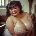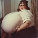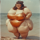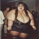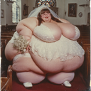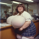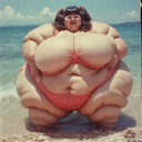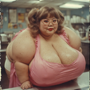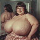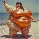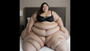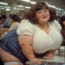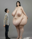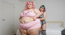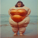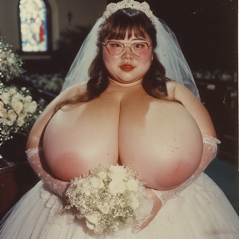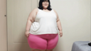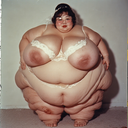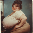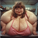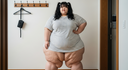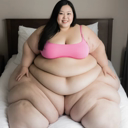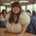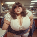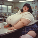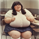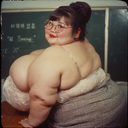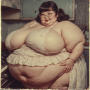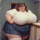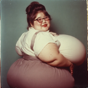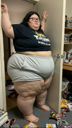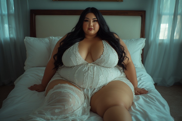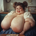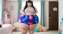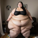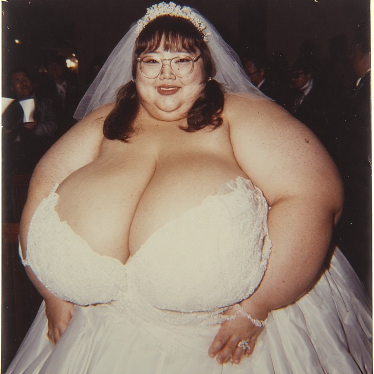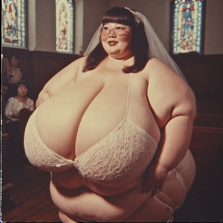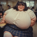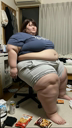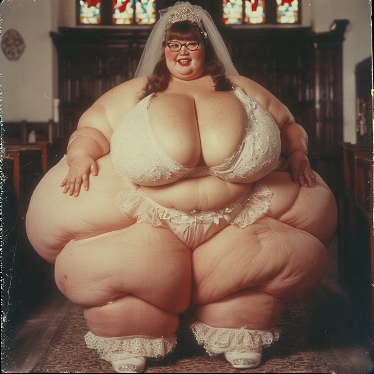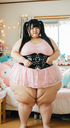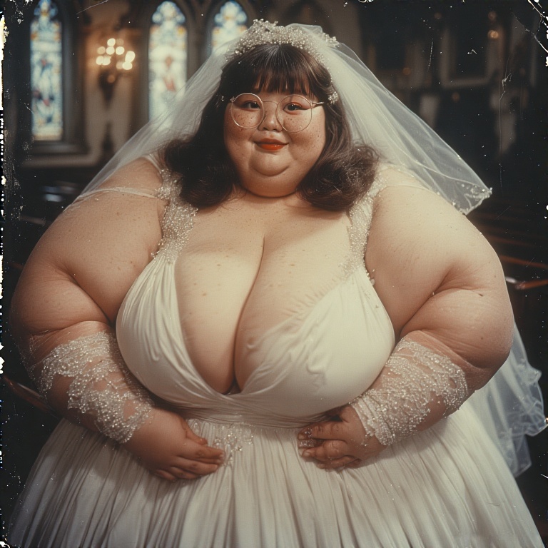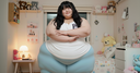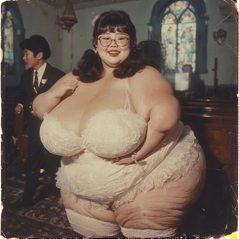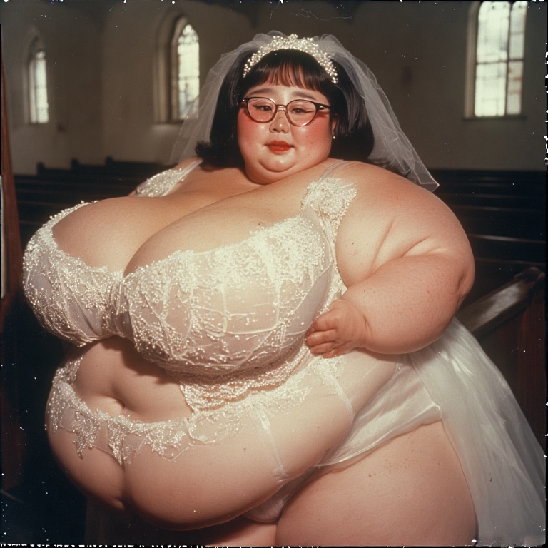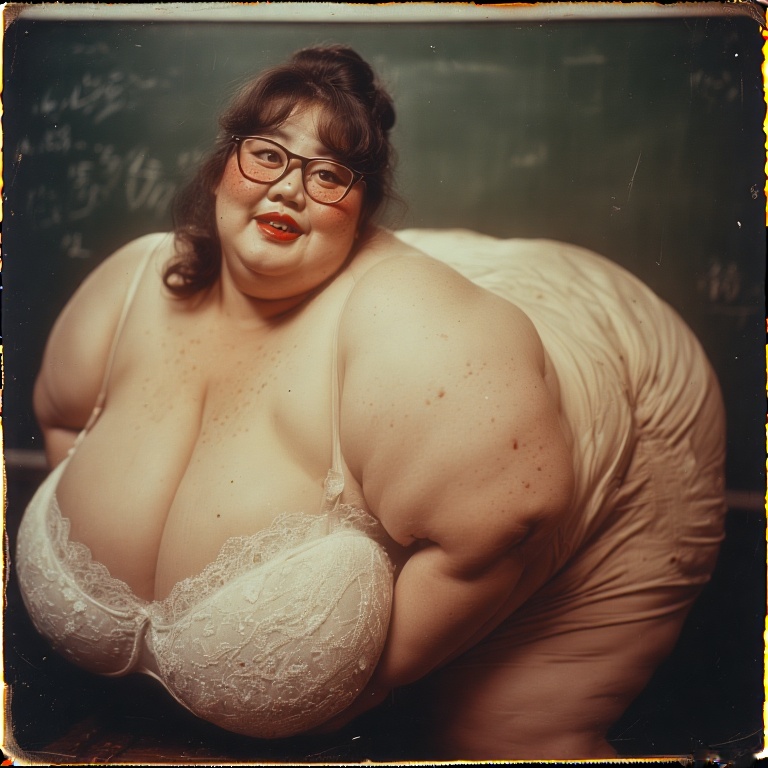 Subject & Features: PHOTOREALISTIC 35MM PHOTO. A candid full-body shot of an extremely obese young Korean woman, weighing 650 lbs. Her face is cute and nerdy with a happy expression, and she has black hair styled in two enormous, fluffy pigtails. Her enormous, soft belly hangs low, cascading in thick, pillowy rolls over her hips, with deep folds and creases defining her midsection, her skin featuring subtle, natural lines that add to its softness and a hint of natural texture with faint cellulite dimpling. Her arms are massively fat, resembling huge soft pillows with flesh spilling over her elbows in distinct, heavy layers, the skin exhibiting a gentle, uneven pattern with noticeable cellulite, marked by small, irregular dimples and a slightly puckered surface. Her thighs, hips, and calves are enormously large, defined by deep rolls, a soft, wavy texture with vivid cellulite displaying prominent, deep-set dimples, a pebbled texture with a honeycomb-like pattern, and squishy qualities that jiggle with every movement. Her cankles are preposterously pudgy, merging into her feet, with a smooth yet slightly varied skin texture accented by pronounced cellulite dimples and a rippled appearance, and her tree-trunk legs appear both heavy and tender.