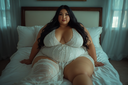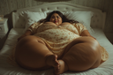 Setting & Style: The scene unfolds in her vibrant otaku bedroom, a haven of anime posters and figurines lining the walls, with warm, natural lighting casting a cozy glow. The mattress on the floor is framed at a low angle, surrounded by shelves of manga and a colorful array of collectibles, creating a lively yet personal atmosphere. The overall aesthetic is a photorealistic 35mm look, focusing on rich textures, natural lighting, and the emotional resonance of her happy indulgence in her own personal, cozy space.