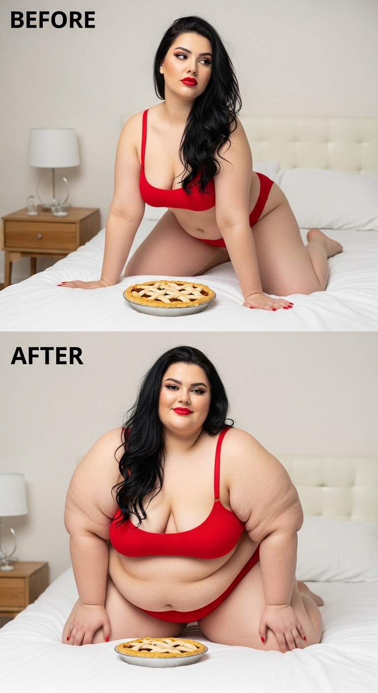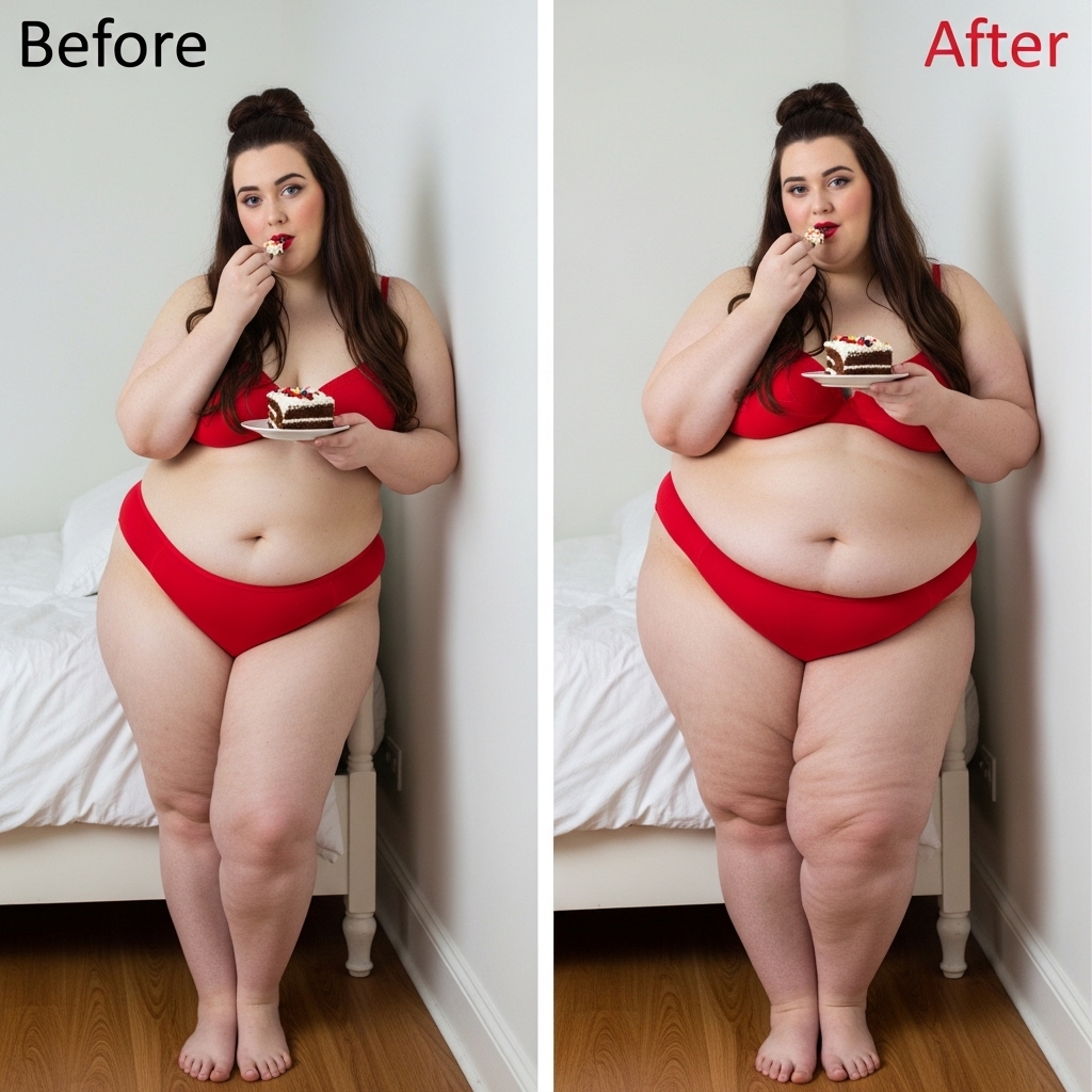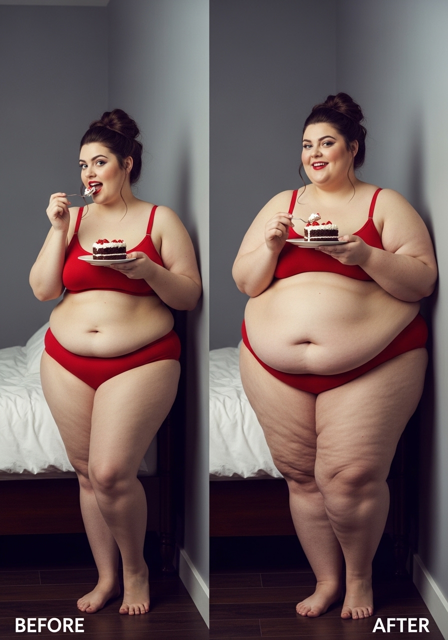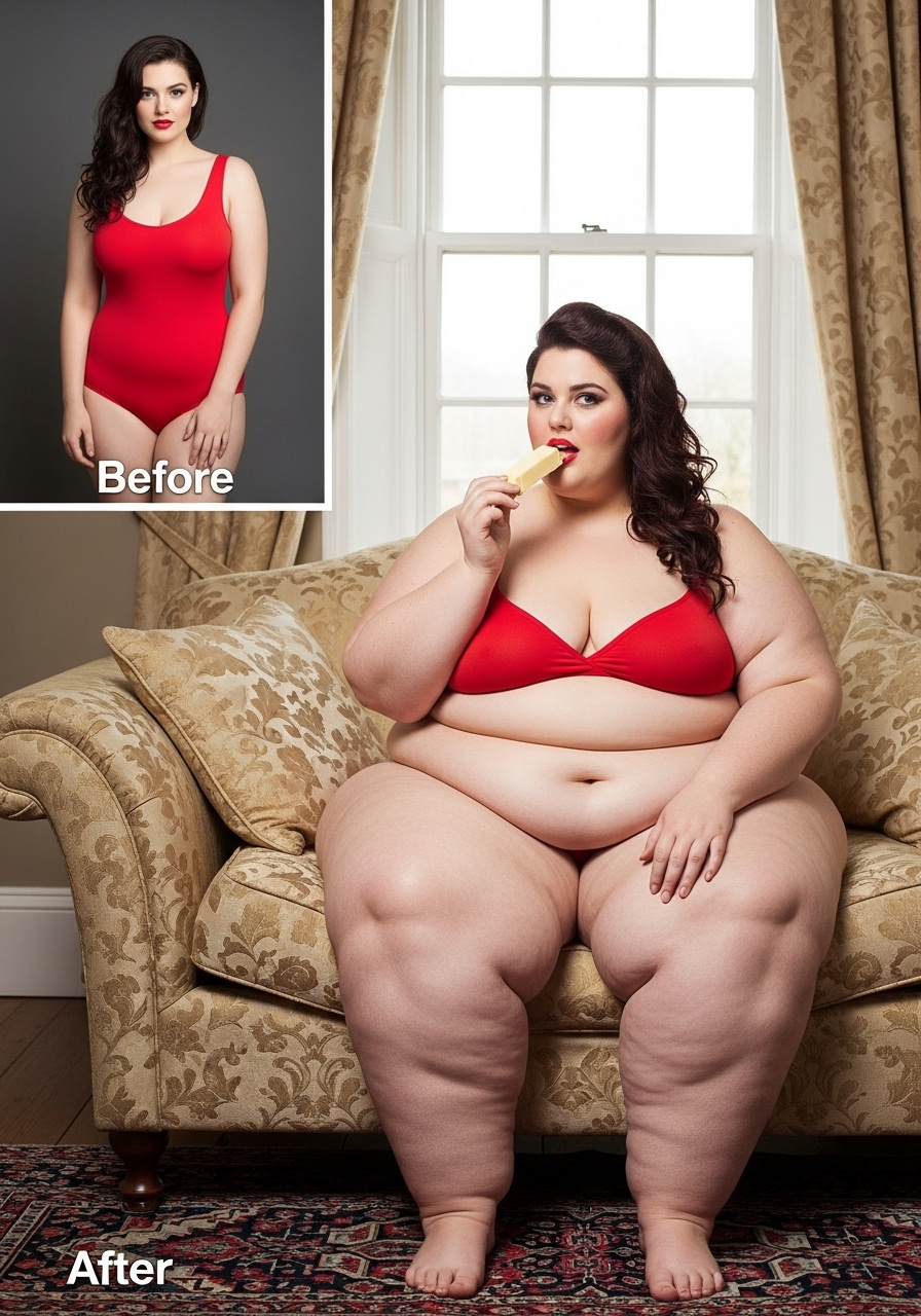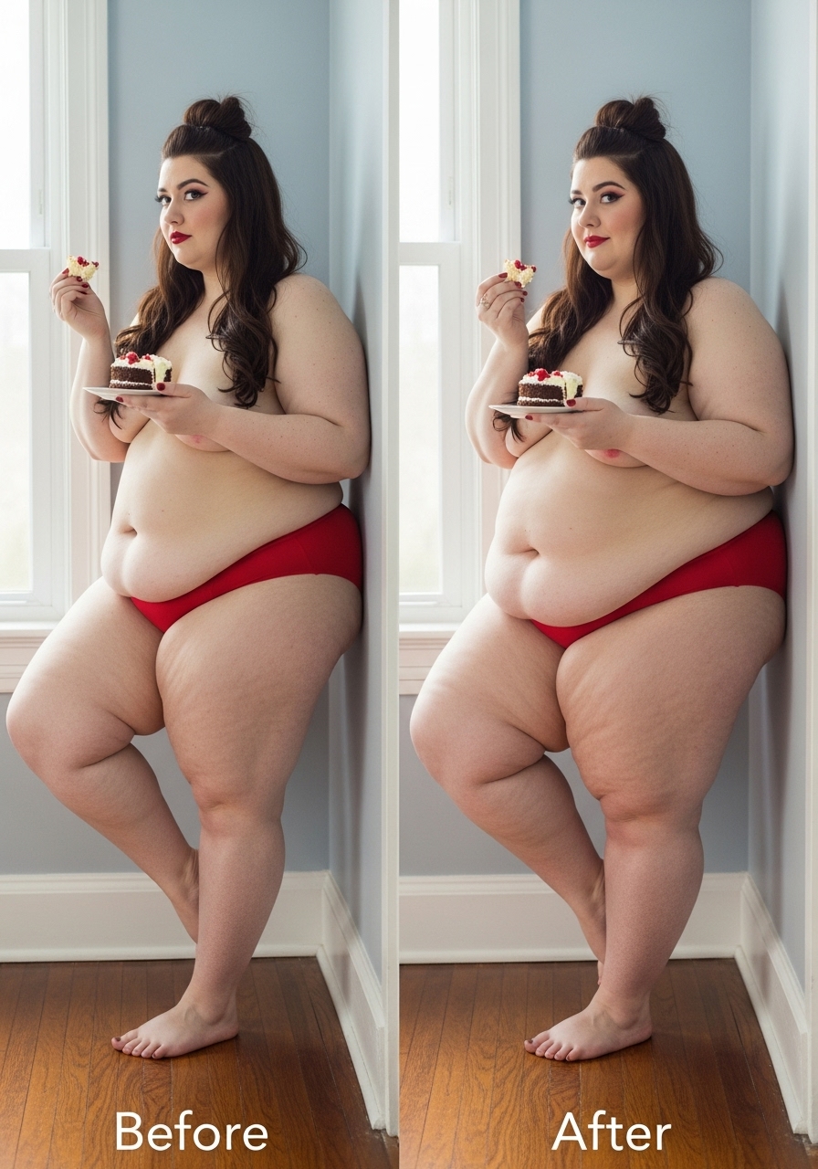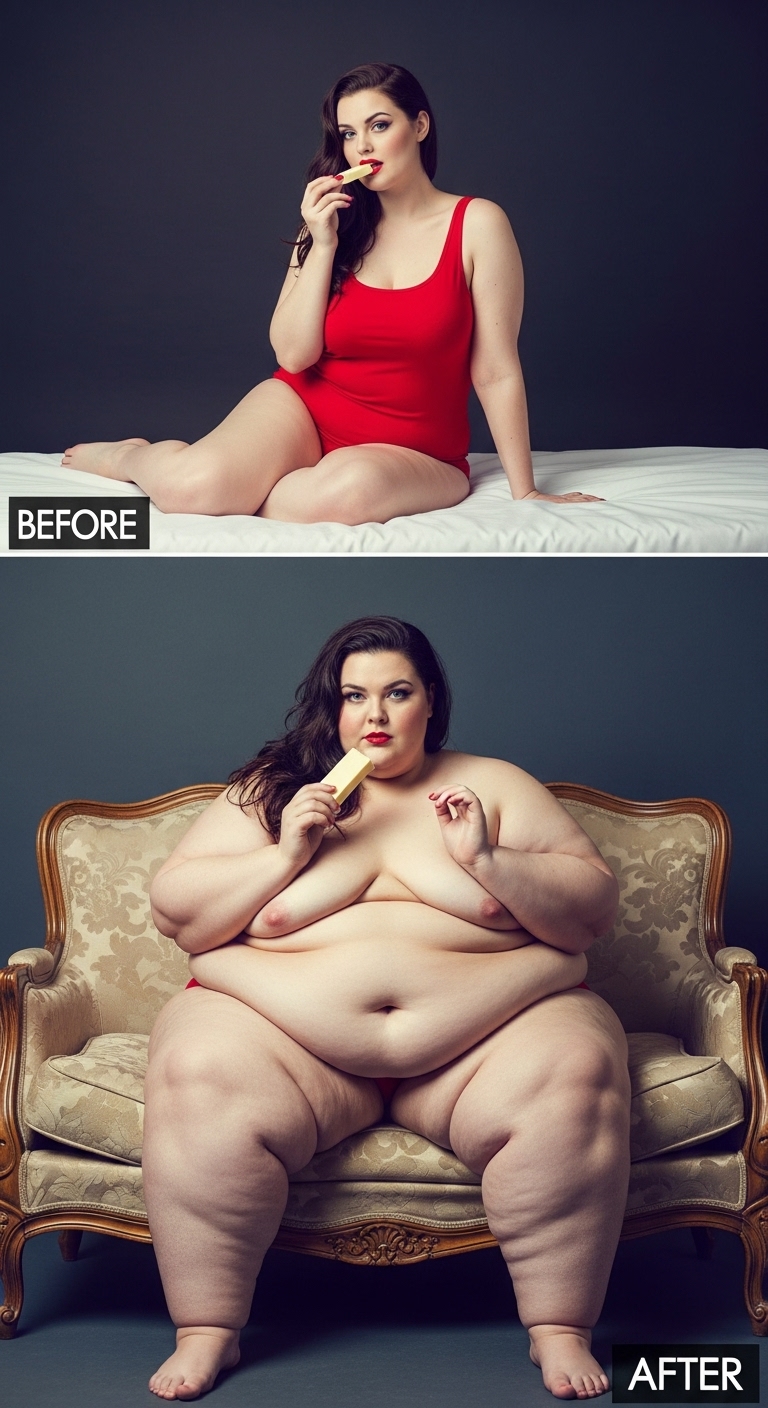 New prompt - works well in all orientations. Before and after of a beautiful long-haired dark brown engliah woman with classic english rose beauty in a bright bedroom that very makes thin people obese and naked. Her hair is in space buns and the same before and after. Before she is slim and very skinny. After she is obese. She is young, in her early twenties and so obese she is a blob, leaning against a wall with a leg in the air, eating a cake. She wears red lipstick and intricate eyeliner and is nakd wearing nothig. She has a chubby face, but the rest of her is very ovese. Her arms are swollen with lymphodemia, covered in heavy cellulite and rolls. Her wrists are swollen and wide with a fat crease between her forearm and hand. Swollen fat hands with inflated large fingers. Her lower half is obese with huge swollen lymphodemic female legs covered in heavy cellulite and rolls. Swollen, wide ankles with a fat rolls across the divide bweteen the calf and foot. Swollen fat feet, with inflated toes.she has an incredibly obese shapeless blob body. She is smirking, and has one swollen foot raised up. young looking, stunning with beautiful makeup and hair. She is incredibly obese with fat spilling everywhere making her blobby. Shes does have a deep double chin hiding her neck. A prominant roll of fat cuts across her swollen forearms and inflated hands. Her swolen ankles are wide and round, with fat covering them as wide as her calves. she has expanded into a gigantically wide mountain of fat spill outward in all directions folding over. Her skin has large stretch marks and blemishes and cellulite all overm damaged by the gain. Her upper arm farm is rolling over her forearms, with multiple rolls and creases at the elbow. Her fupa is out and shaved. Her thighs are marks with cellulite; lard rolling over her knees which are hidden under fat. Her calves are round and large, and are touching one another. Her ankles are round, and split in two by a large fat roll. Her hands and feet are fat, with round plump fingers and toes with fat splaying out. Her feet are obscenely fat.