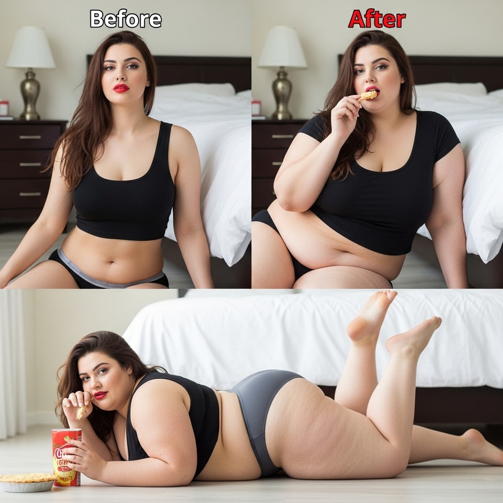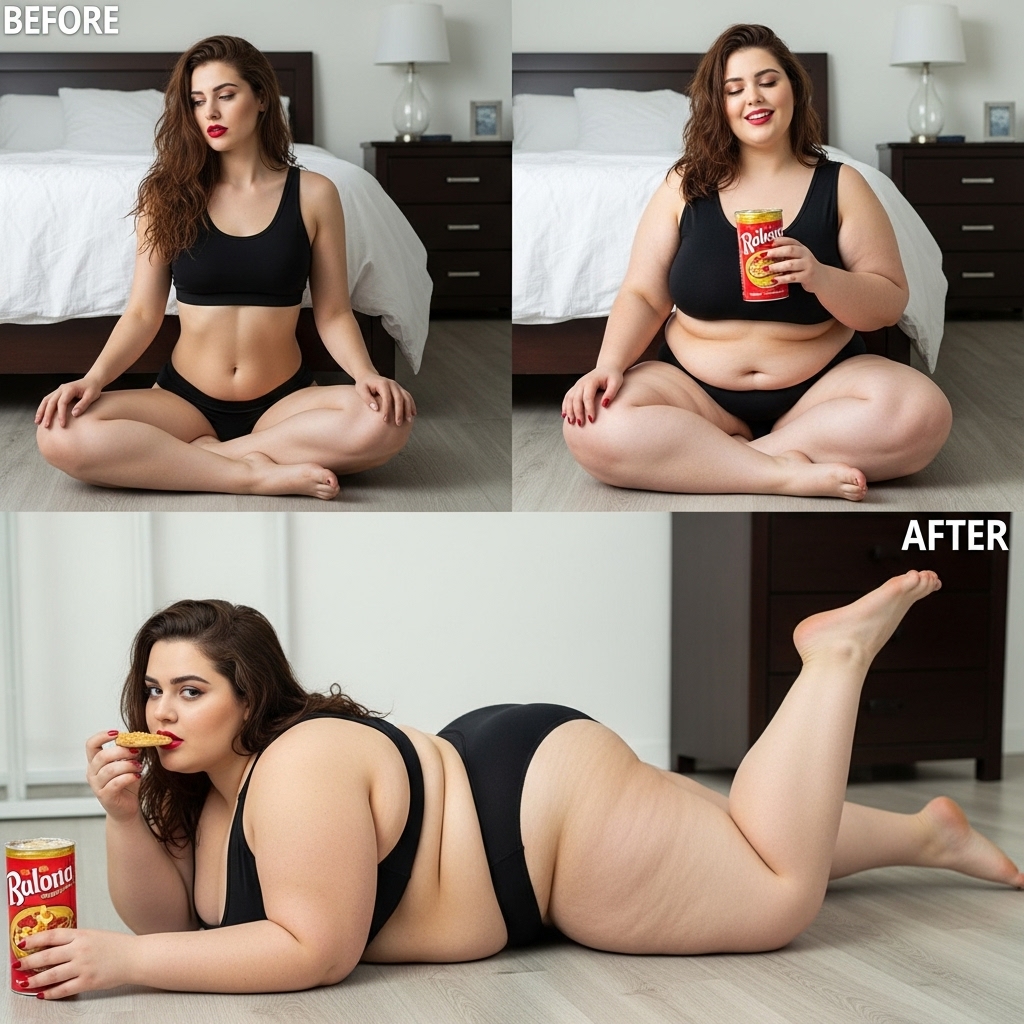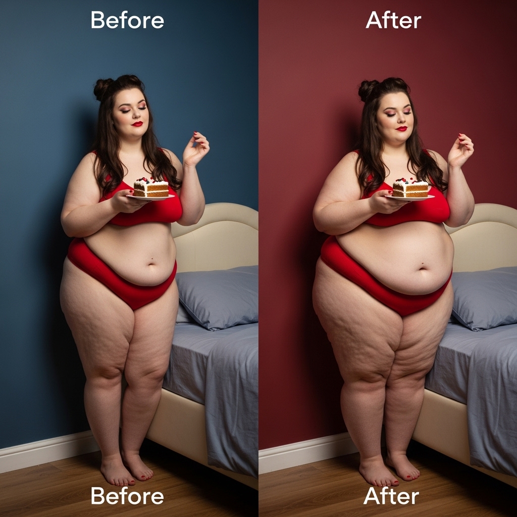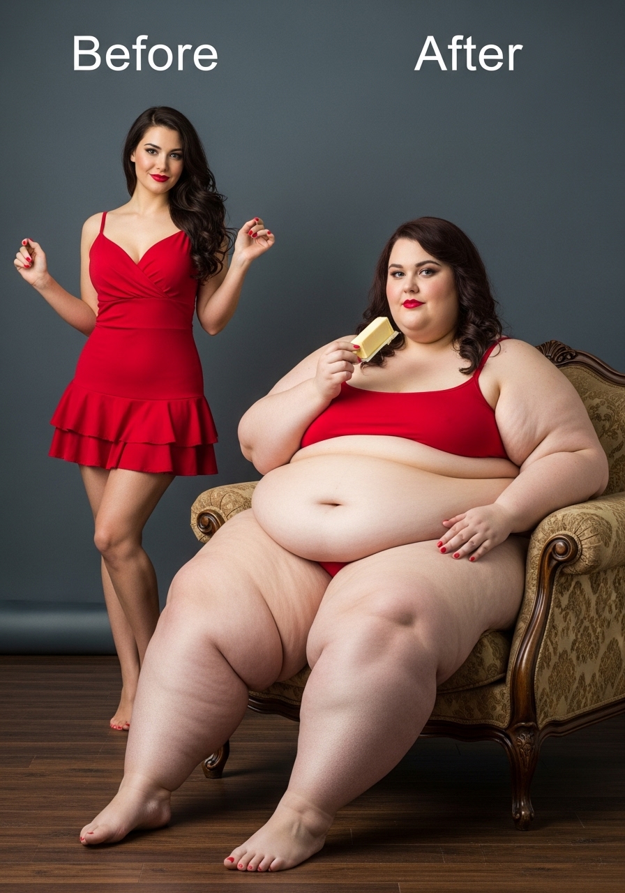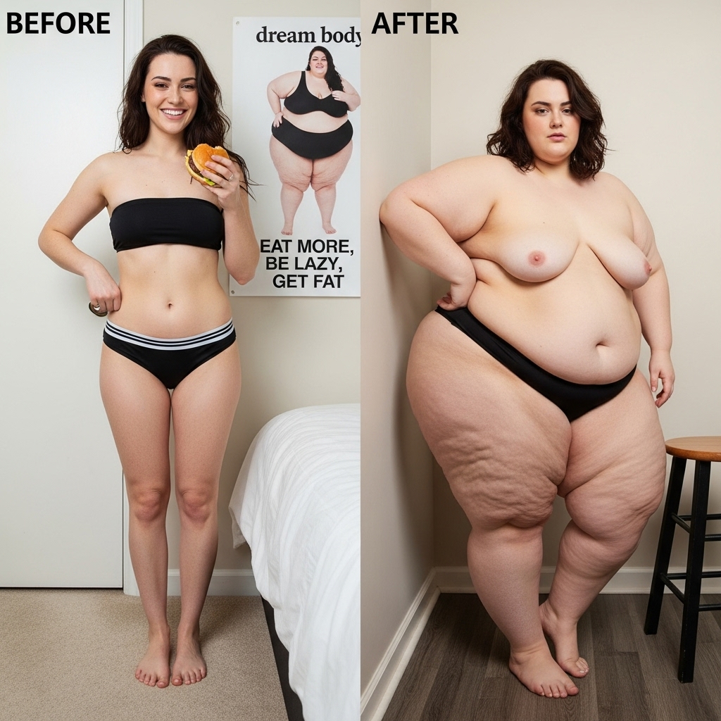 New prompt - works well in all orientations. Before and after of a beautiful long-haired dark brown engliah woman with classic english rose beauty in a bright bedroom that very makes thin people obese and naked. Her hair is in space buns and the same before and after. Before she is slim and very skinny. After she is obese. She is young, in her early twenties and so obese she is a blob, leaning against a wall with a leg in the air, eating a cake. She wears red lipstick and intricate eyeliner and is nakd wearing nothig. She has a chubby face, but the rest of her is very ovese. Her arms are swollen with lymphodemia, covered in heavy cellulite and rolls. Her wrists are swollen and wide with a fat crease between her forearm and hand. Swollen fat hands with inflated large fingers. Her lower half is obese with huge swollen lymphodemic female legs covered in heavy cellulite and rolls. Swollen, wide ankles with a fat rolls across the divide bweteen the calf and foot. Swollen fat feet, with inflated toes.she has an incredibly obese shapeless blob body. She is smirking, and has one swollen foot raised up. young looking, stunning with beautiful makeup and hair. She is incredibly obese with fat spilling everywhere making her blobby. Shes does have a deep double chin hiding her neck. A prominant roll of fat cuts across her swollen forearms and inflated hands. Her swolen ankles are wide and round, with fat covering them as wide as her calves. she has expanded into a gigantically wide mountain of fat spill outward in all directions folding over. Her skin has large stretch marks and blemishes and cellulite all overm damaged by the gain. Her upper arm farm is rolling over her forearms, with multiple rolls and creases at the elbow. Her fupa is out and shaved. Her thighs are marks with cellulite; lard rolling over her knees which are hidden under fat. Her calves are round and large, and are touching one another. Her ankles are round, and split in two by a large fat roll. Her hands and feet are fat, with round plump fingers and toes with fat splaying out. Her feet are obscenely fat.