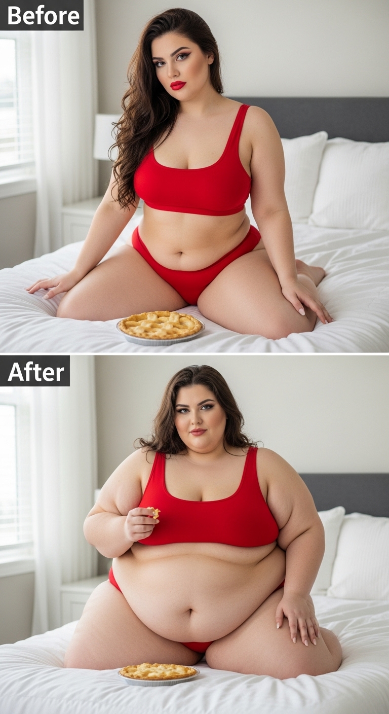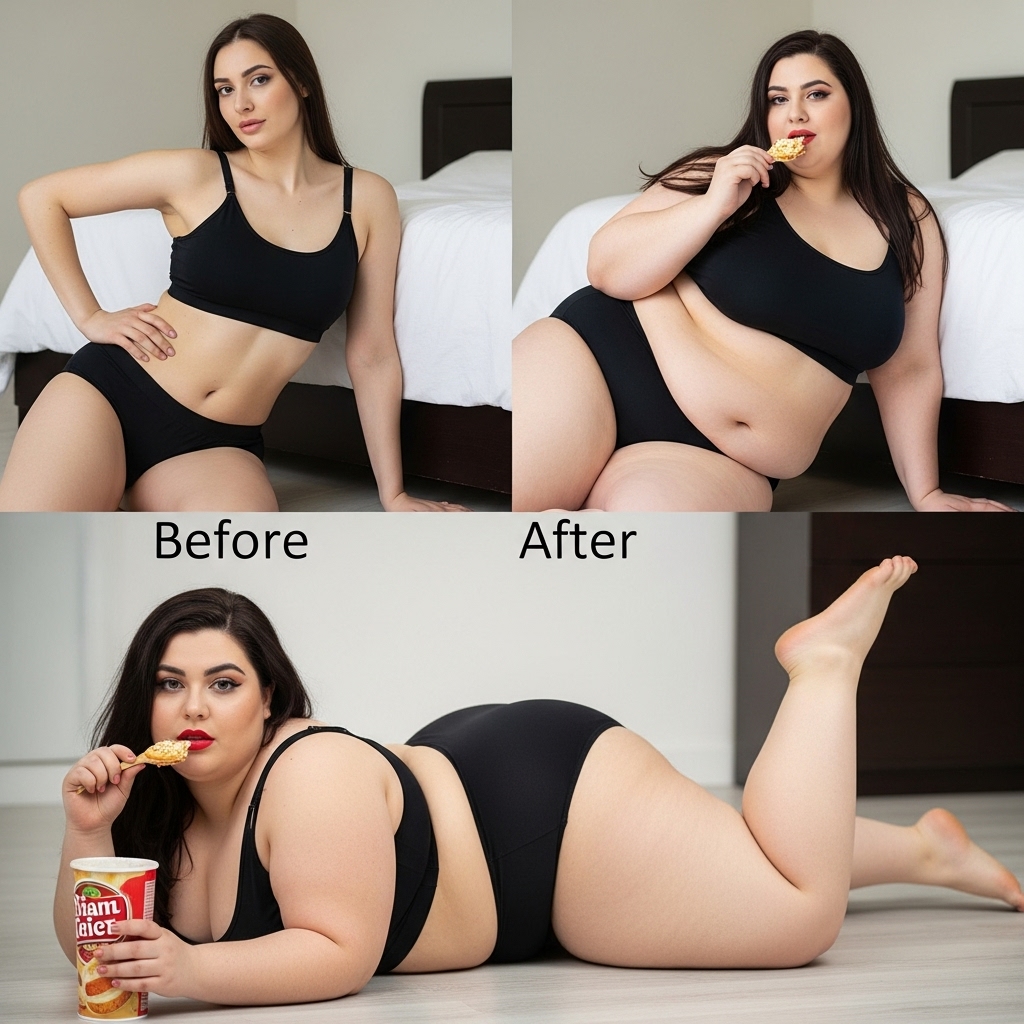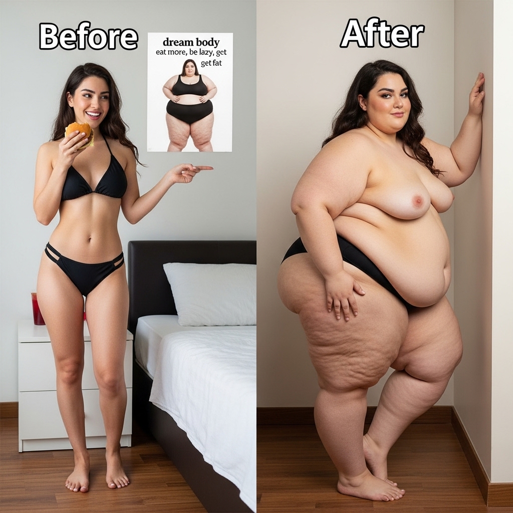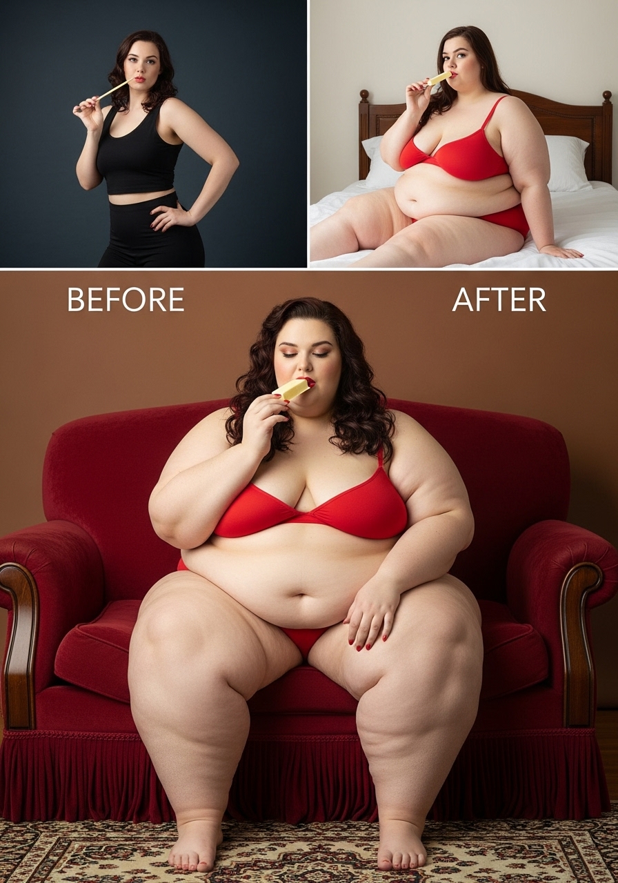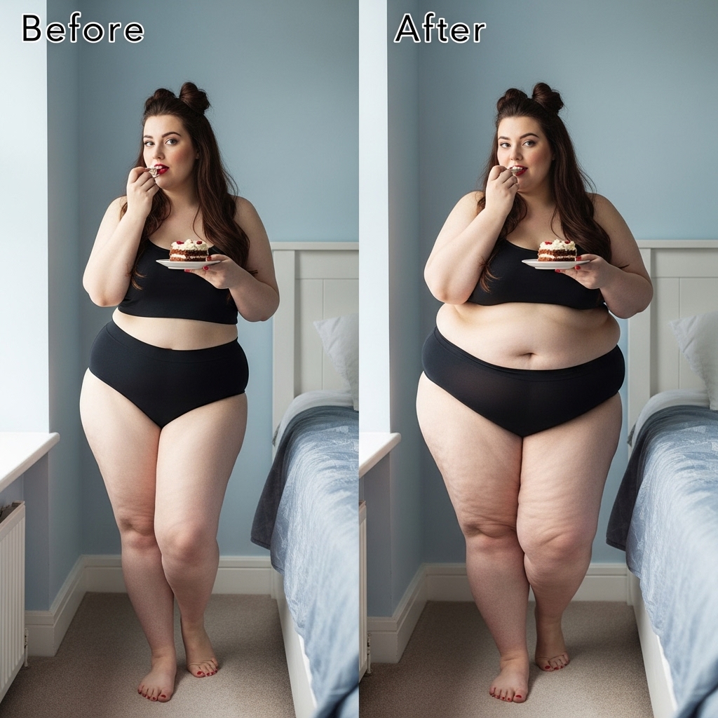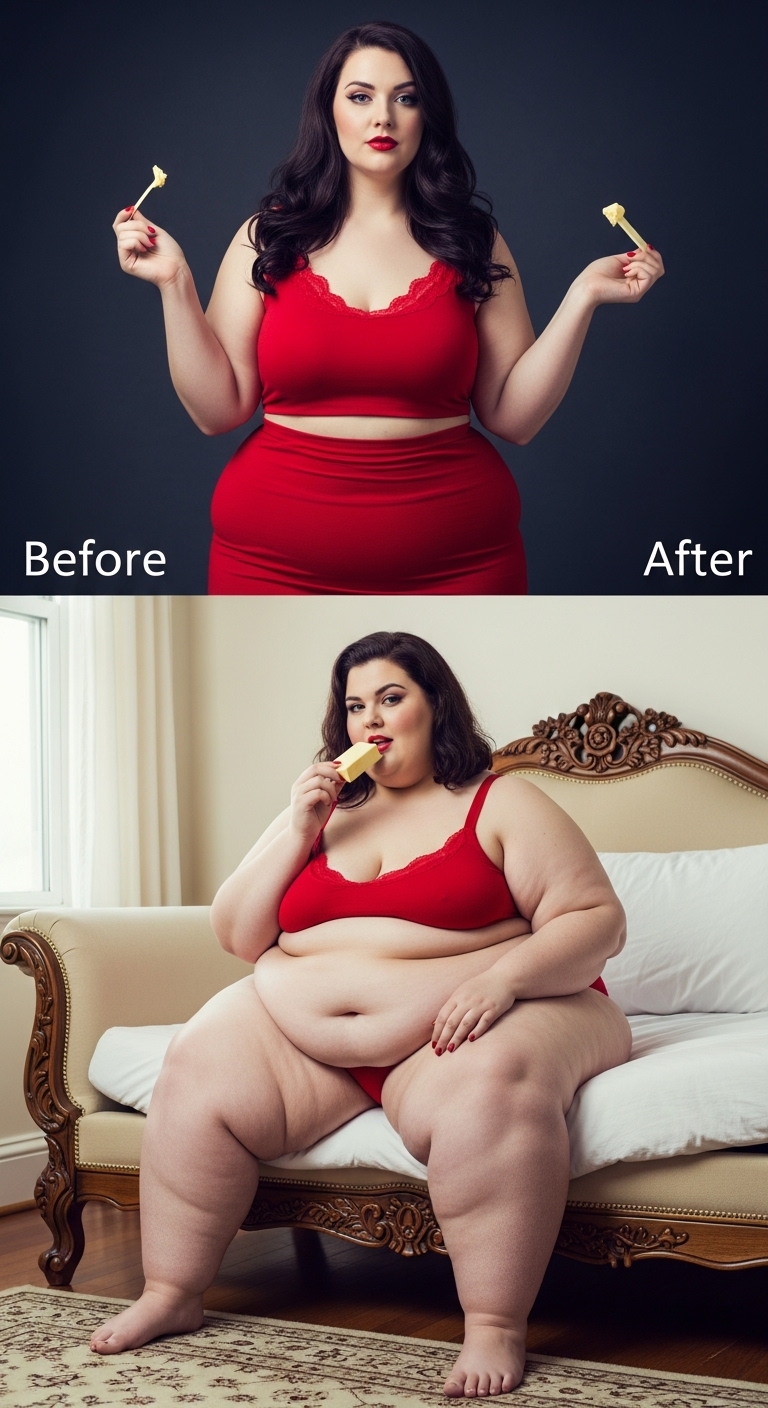 New prompt - works well in all orientations. Before and after of a beautiful long-haired dark brown engliah woman with classic english rose beauty in a bright bedroom that very makes thin people obese and naked. Her hair is in space buns and the same before and after. Before she is slim and very skinny. After she is obese. She is young, in her early twenties and so obese she is a blob, leaning against a wall with a leg in the air, eating a cake. She wears red lipstick and intricate eyeliner and is nakd wearing nothig. She has a chubby face, but the rest of her is very ovese. Her arms are swollen with lymphodemia, covered in heavy cellulite and rolls. Her wrists are swollen and wide with a fat crease between her forearm and hand. Swollen fat hands with inflated large fingers. Her lower half is obese with huge swollen lymphodemic female legs covered in heavy cellulite and rolls. Swollen, wide ankles with a fat rolls across the divide bweteen the calf and foot. Swollen fat feet, with inflated toes.she has an incredibly obese shapeless blob body. She is smirking, and has one swollen foot raised up. young looking, stunning with beautiful makeup and hair. She is incredibly obese with fat spilling everywhere making her blobby. Shes does have a deep double chin hiding her neck. A prominant roll of fat cuts across her swollen forearms and inflated hands. Her swolen ankles are wide and round, with fat covering them as wide as her calves. she has expanded into a gigantically wide mountain of fat spill outward in all directions folding over. Her skin has large stretch marks and blemishes and cellulite all overm damaged by the gain. Her upper arm farm is rolling over her forearms, with multiple rolls and creases at the elbow. Her fupa is out and shaved. Her thighs are marks with cellulite; lard rolling over her knees which are hidden under fat. Her calves are round and large, and are touching one another. Her ankles are round, and split in two by a large fat roll. Her hands and feet are fat, with round plump fingers and toes with fat splaying out. Her feet are obscenely fat.