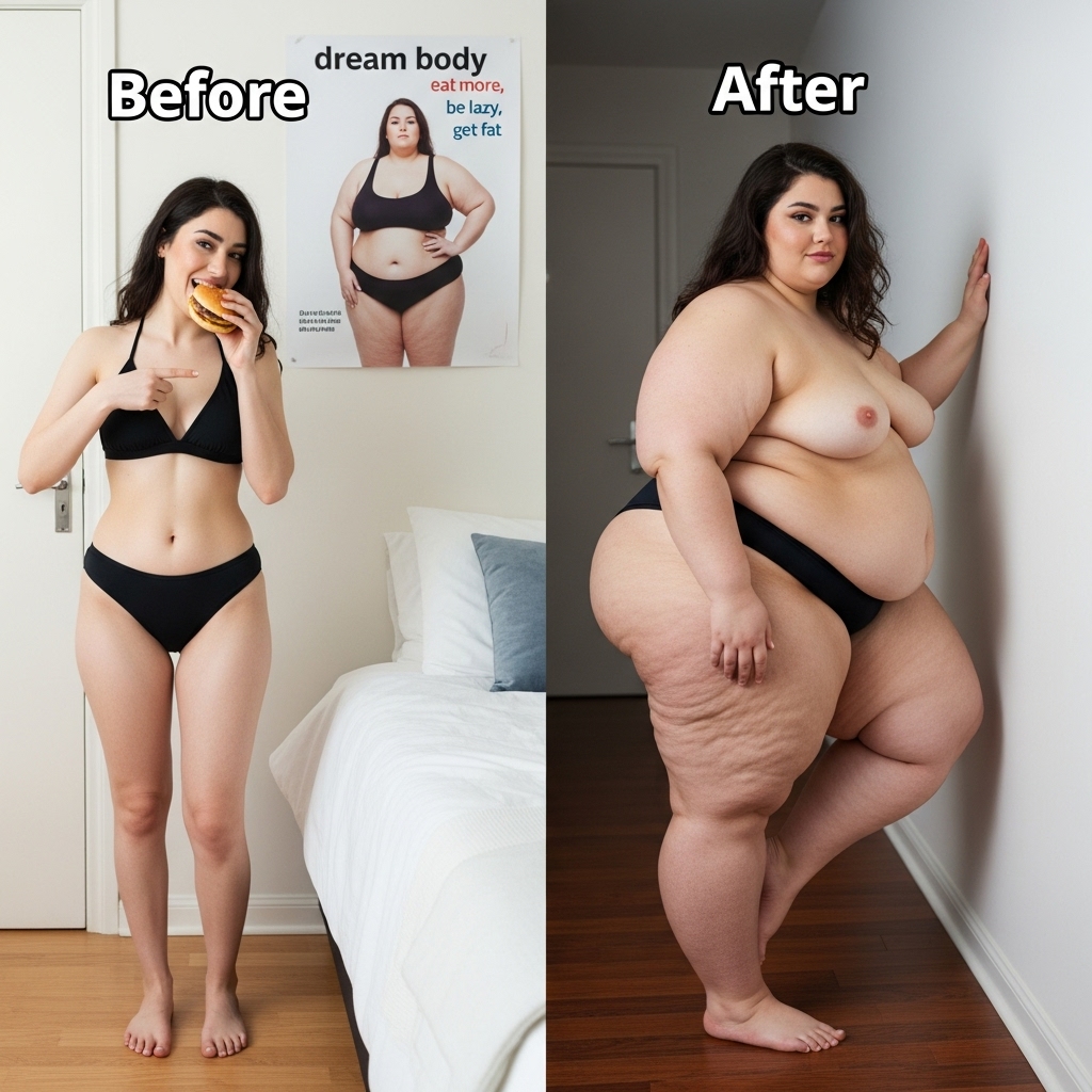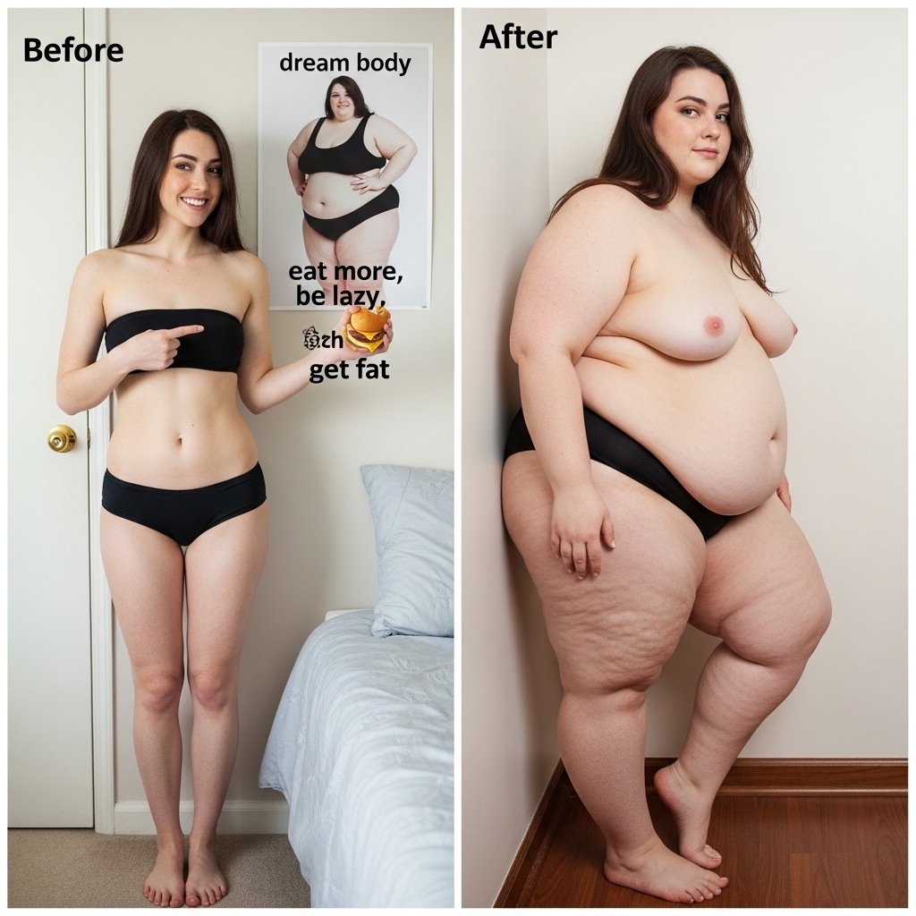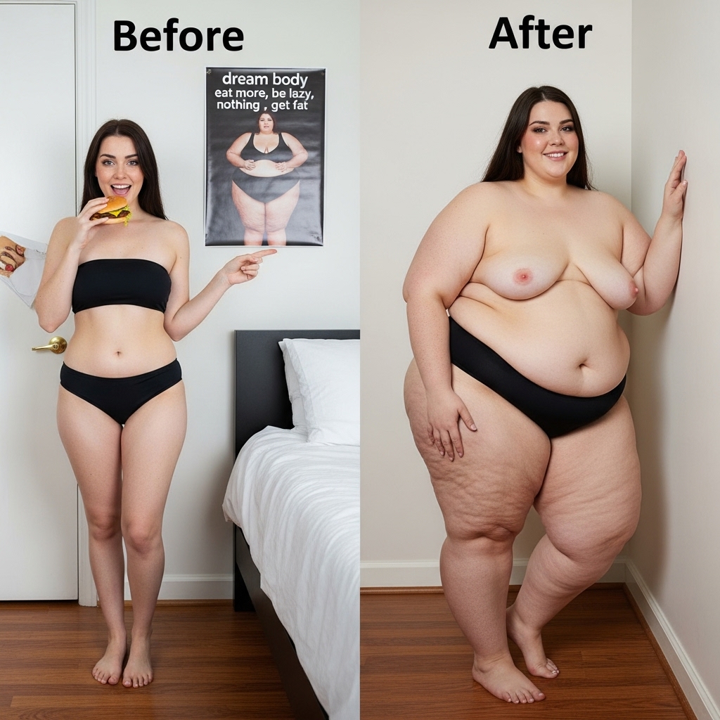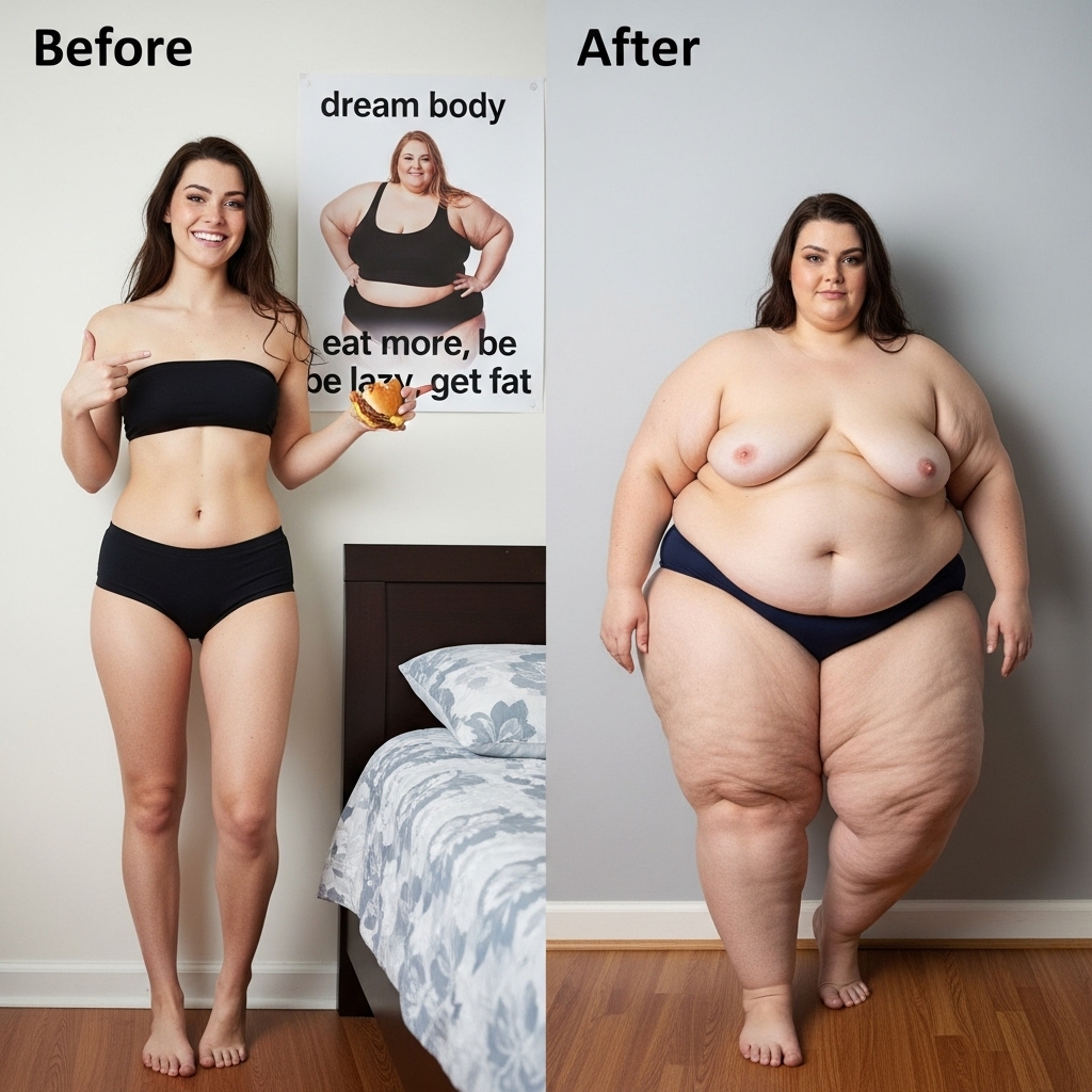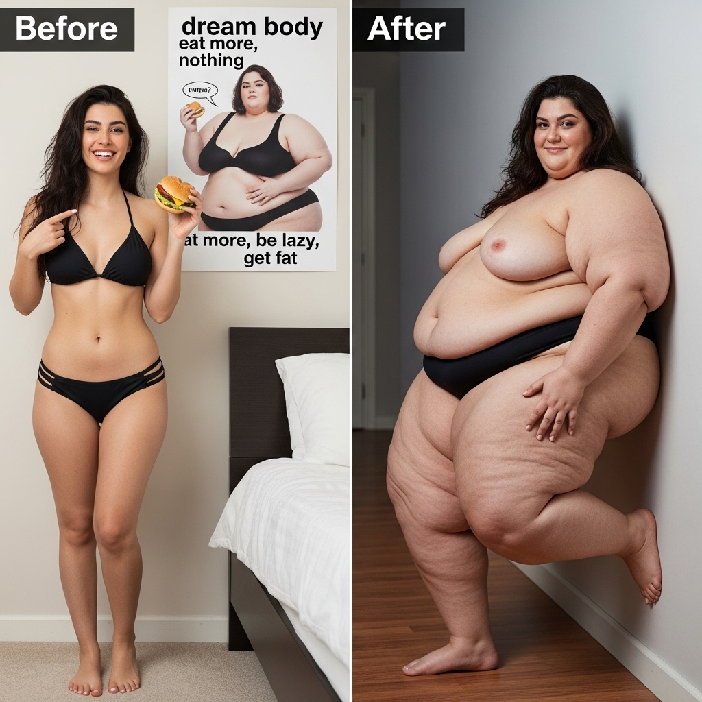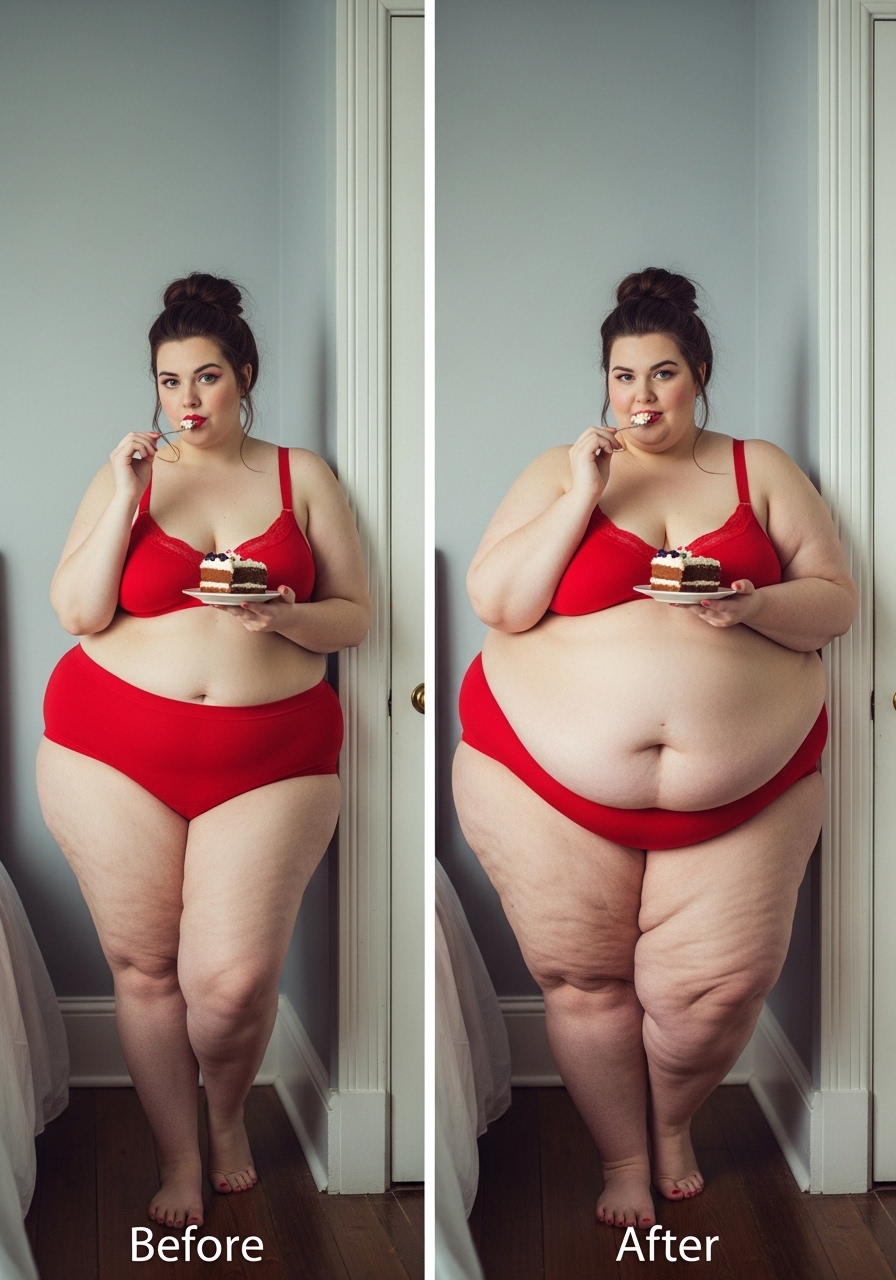 New prompt - works well in all orientations. Before and after of a beautiful long-haired dark brown engliah woman with classic english rose beauty in a bright bedroom that very makes thin people obese and naked. Her hair is in space buns and the same before and after. Before she is slim and very skinny. After she is obese. She is young, in her early twenties and so obese she is a blob, leaning against a wall with a leg in the air, eating a cake. She wears red lipstick and intricate eyeliner and is nakd wearing nothig. She has a chubby face, but the rest of her is very ovese. Her arms are swollen with lymphodemia, covered in heavy cellulite and rolls. Her wrists are swollen and wide with a fat crease between her forearm and hand. Swollen fat hands with inflated large fingers. Her lower half is obese with huge swollen lymphodemic female legs covered in heavy cellulite and rolls. Swollen, wide ankles with a fat rolls across the divide bweteen the calf and foot. Swollen fat feet, with inflated toes.she has an incredibly obese shapeless blob body. She is smirking, and has one swollen foot raised up. young looking, stunning with beautiful makeup and hair. She is incredibly obese with fat spilling everywhere making her blobby. Shes does have a deep double chin hiding her neck. A prominant roll of fat cuts across her swollen forearms and inflated hands. Her swolen ankles are wide and round, with fat covering them as wide as her calves. she has expanded into a gigantically wide mountain of fat spill outward in all directions folding over. Her skin has large stretch marks and blemishes and cellulite all overm damaged by the gain. Her upper arm farm is rolling over her forearms, with multiple rolls and creases at the elbow. Her fupa is out and shaved. Her thighs are marks with cellulite; lard rolling over her knees which are hidden under fat. Her calves are round and large, and are touching one another. Her ankles are round, and split in two by a large fat roll. Her hands and feet are fat, with round plump fingers and toes with fat splaying out. Her feet are obscenely fat.