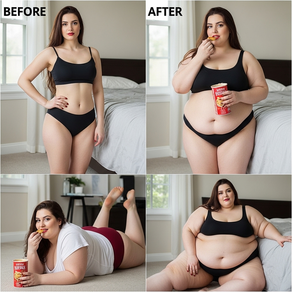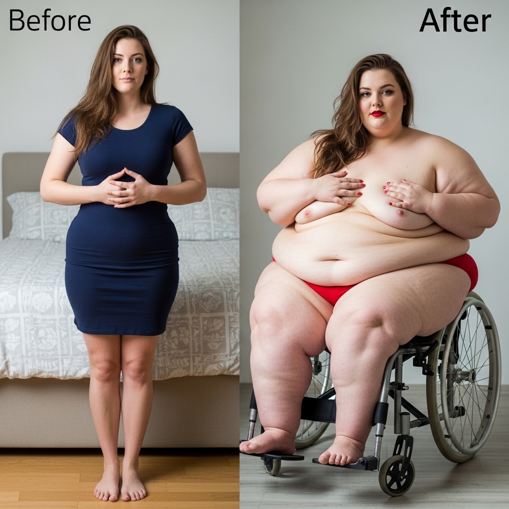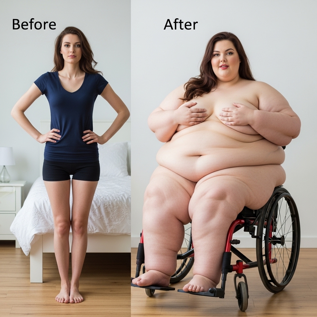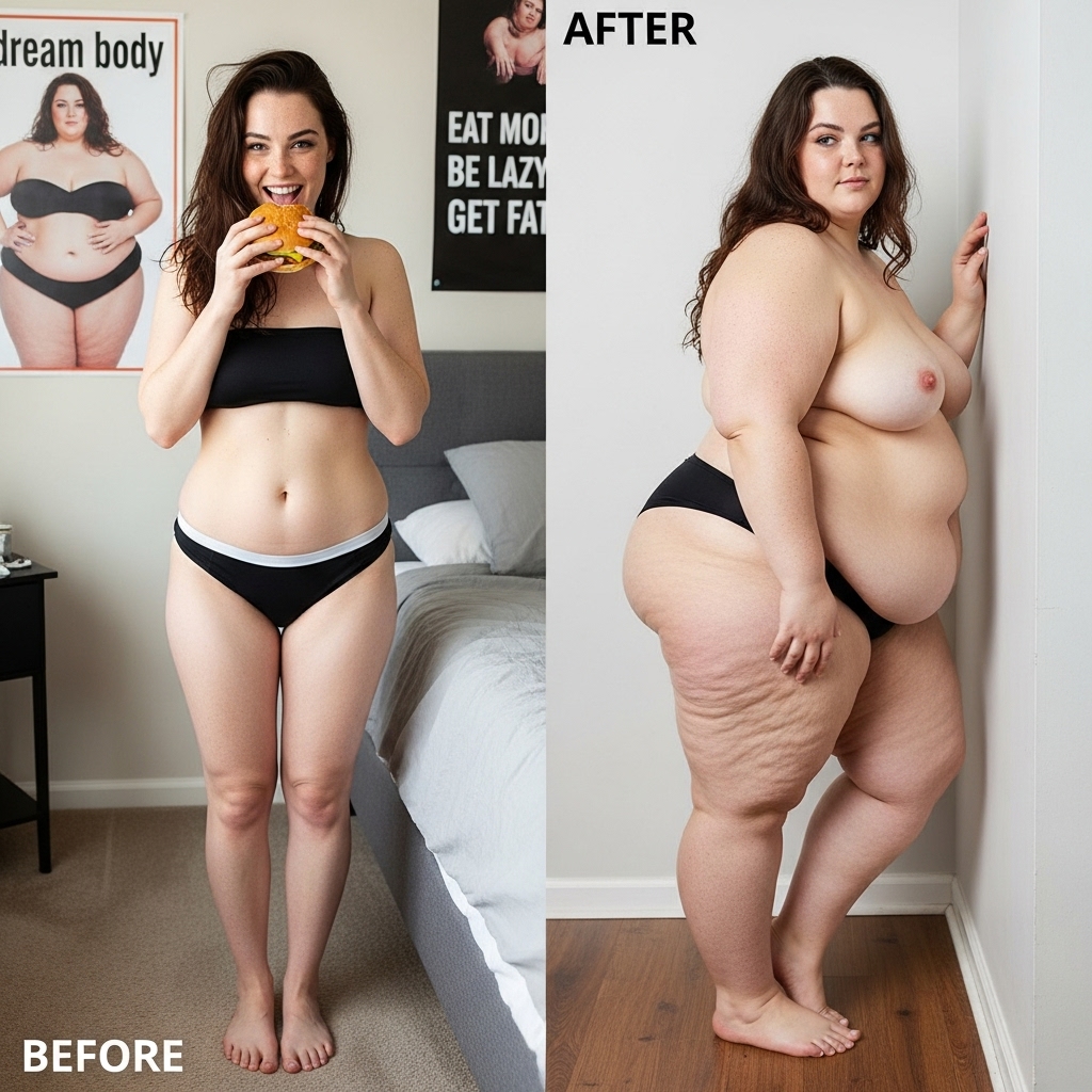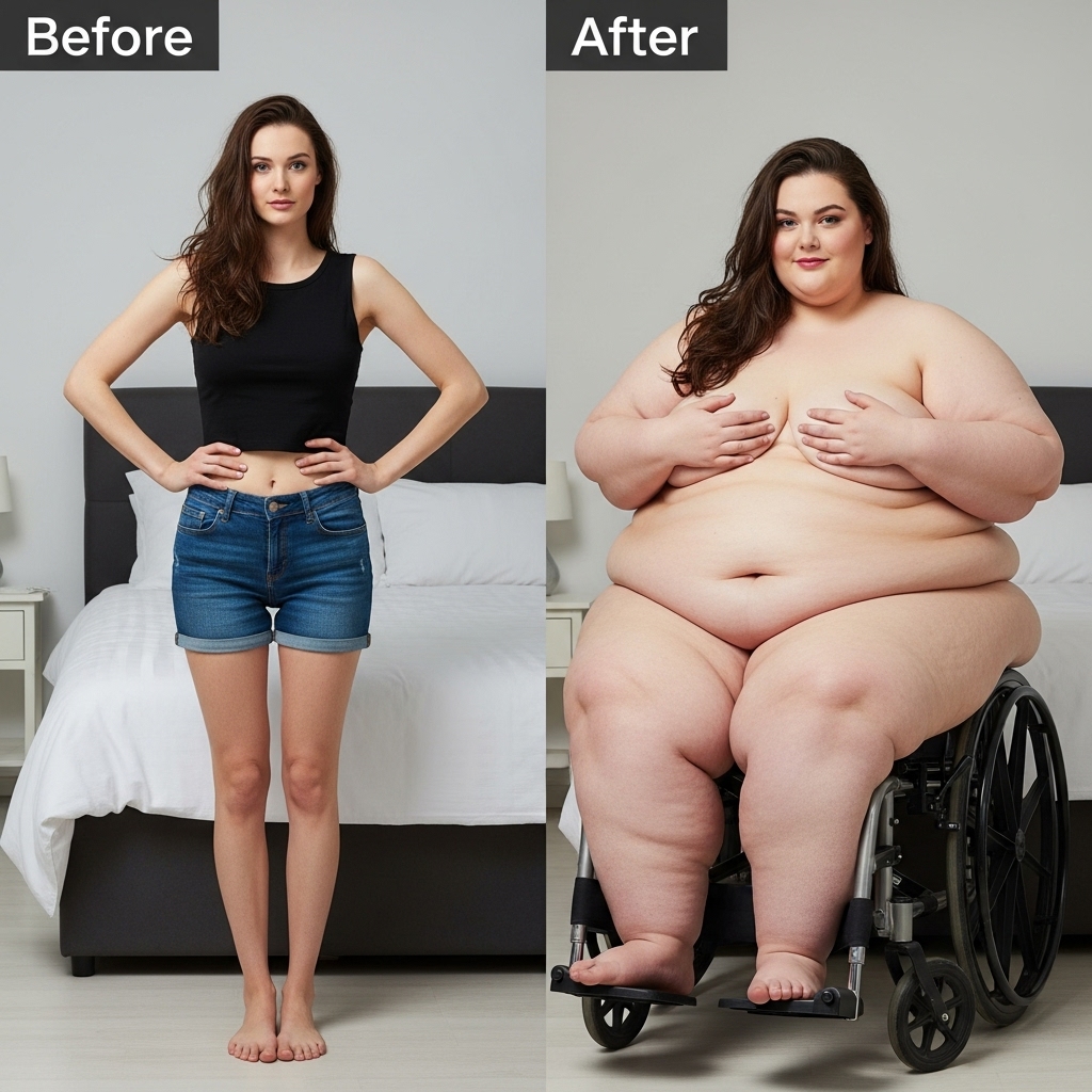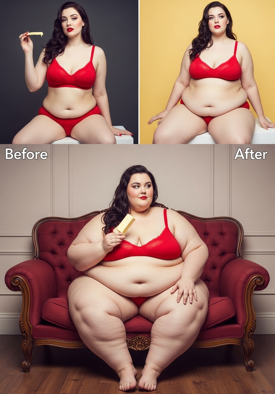 New prompt - works well in all orientations. Before and after of a beautiful long-haired dark brown engliah woman with classic english rose beauty in a bright bedroom that very makes thin people obese and naked. Her hair is in space buns and the same before and after. Before she is slim and very skinny. After she is obese. She is young, in her early twenties and so obese she is a blob, leaning against a wall with a leg in the air, eating a cake. She wears red lipstick and intricate eyeliner and is nakd wearing nothig. She has a chubby face, but the rest of her is very ovese. Her arms are swollen with lymphodemia, covered in heavy cellulite and rolls. Her wrists are swollen and wide with a fat crease between her forearm and hand. Swollen fat hands with inflated large fingers. Her lower half is obese with huge swollen lymphodemic female legs covered in heavy cellulite and rolls. Swollen, wide ankles with a fat rolls across the divide bweteen the calf and foot. Swollen fat feet, with inflated toes.she has an incredibly obese shapeless blob body. She is smirking, and has one swollen foot raised up. young looking, stunning with beautiful makeup and hair. She is incredibly obese with fat spilling everywhere making her blobby. Shes does have a deep double chin hiding her neck. A prominant roll of fat cuts across her swollen forearms and inflated hands. Her swolen ankles are wide and round, with fat covering them as wide as her calves. she has expanded into a gigantically wide mountain of fat spill outward in all directions folding over. Her skin has large stretch marks and blemishes and cellulite all overm damaged by the gain. Her upper arm farm is rolling over her forearms, with multiple rolls and creases at the elbow. Her fupa is out and shaved. Her thighs are marks with cellulite; lard rolling over her knees which are hidden under fat. Her calves are round and large, and are touching one another. Her ankles are round, and split in two by a large fat roll. Her hands and feet are fat, with round plump fingers and toes with fat splaying out. Her feet are obscenely fat.