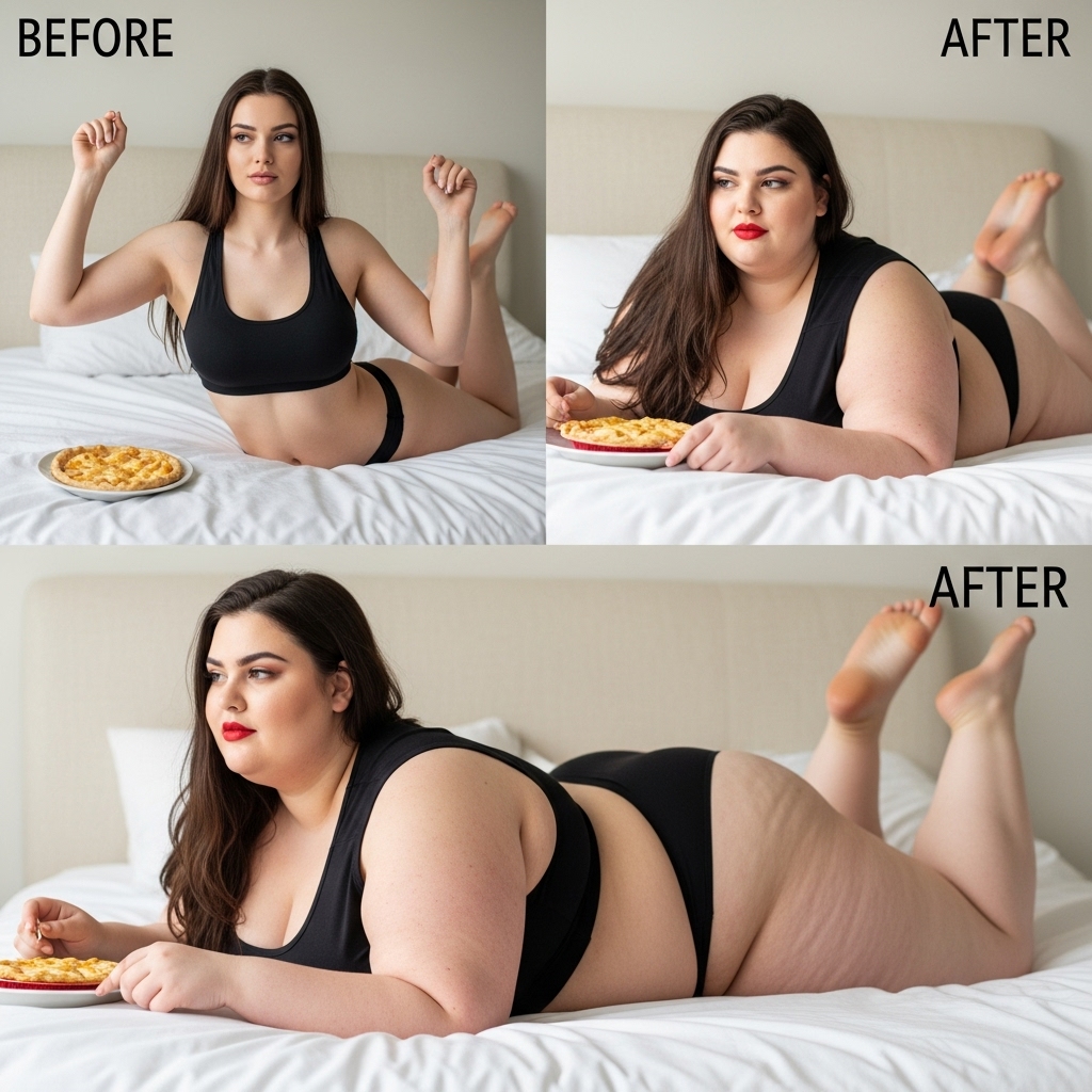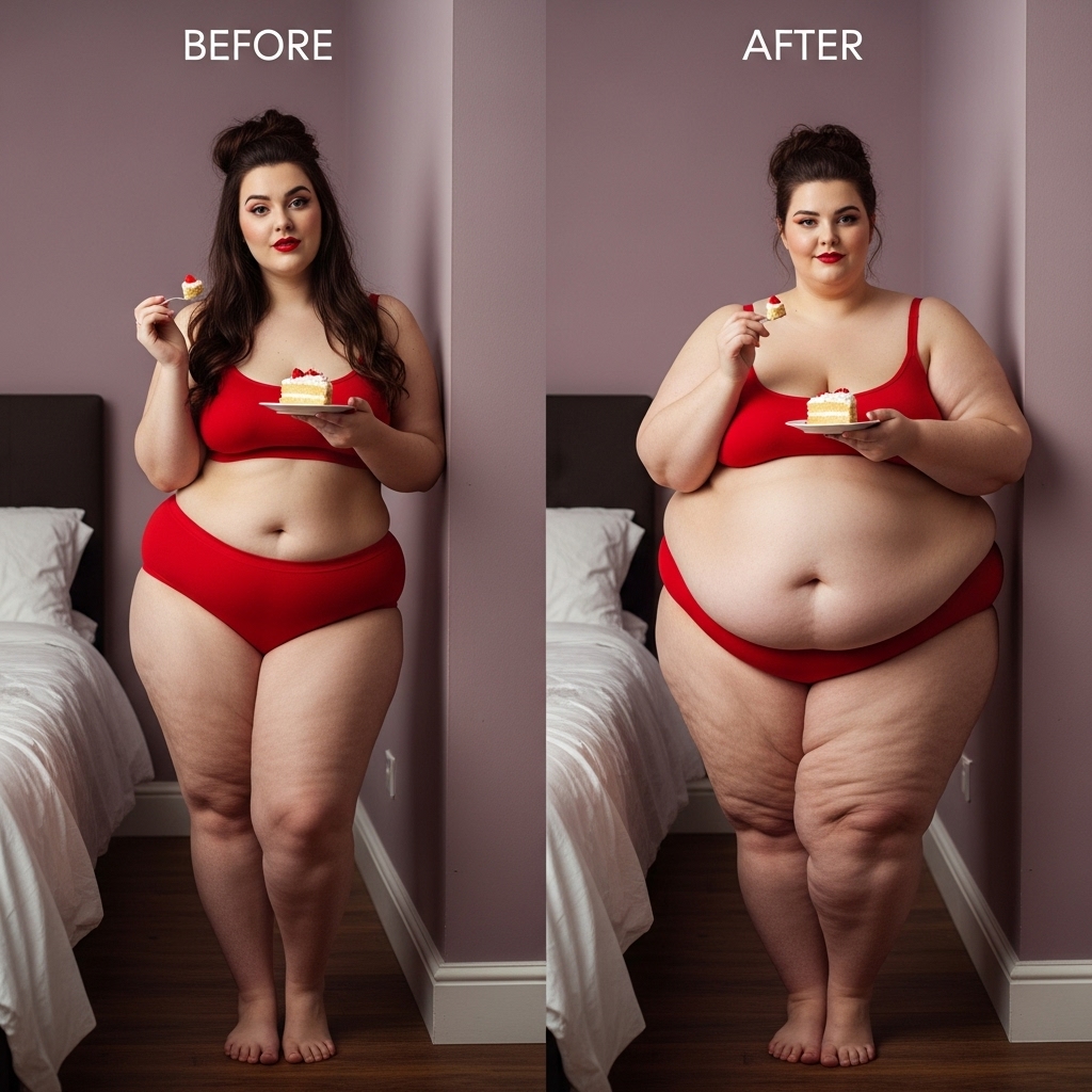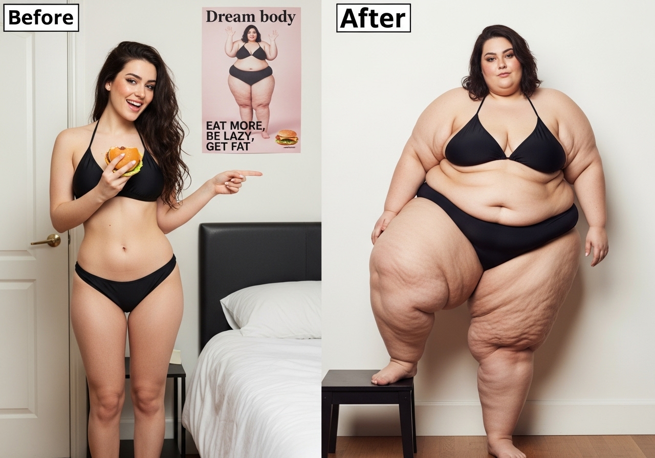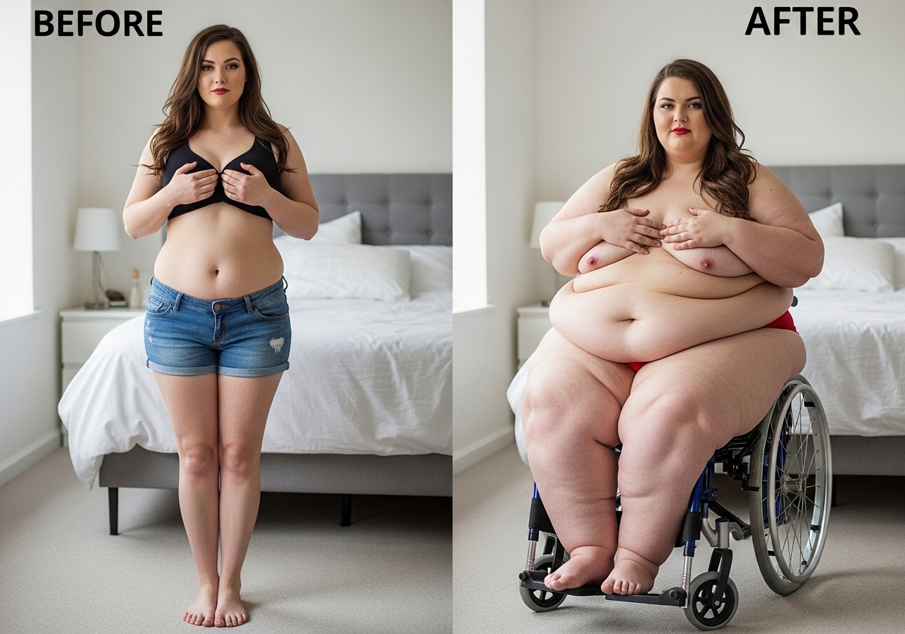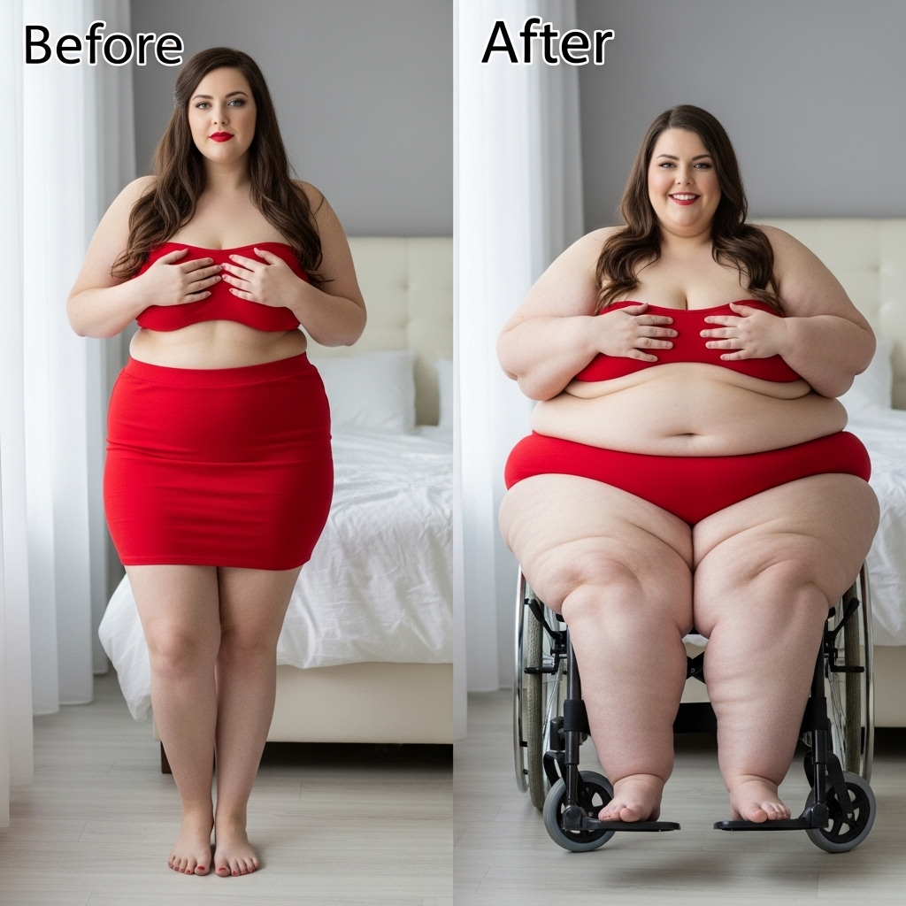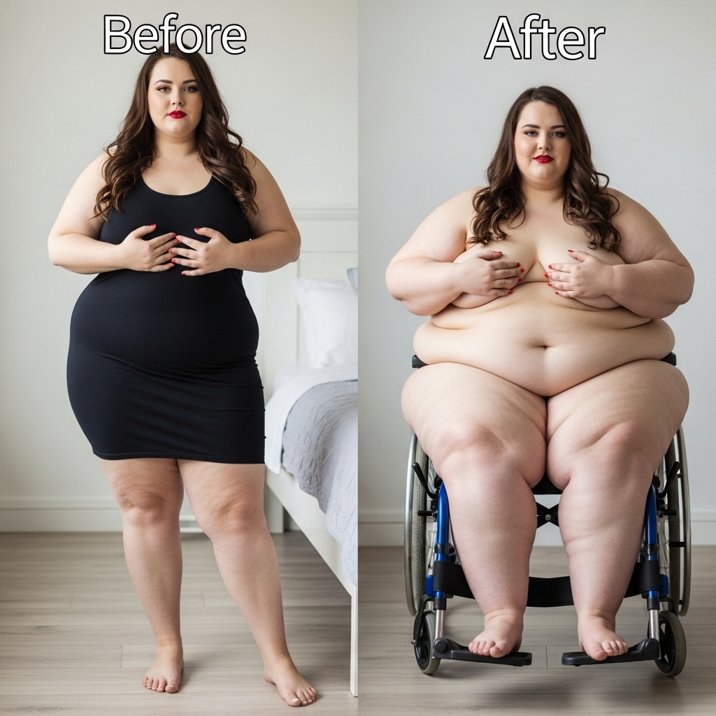New prompt - works well in all orientations. Before and after of a beautiful long-haired dark brown engliah woman with classic english rose beauty in a bright bedroom that very makes thin people obese and naked. Her hair is in space buns and the same before and after. Before she is slim and very skinny. After she is obese. She is young, in her early twenties and so obese she is a blob, leaning against a wall with a leg in the air, eating a cake. She wears red lipstick and intricate eyeliner and is nakd wearing nothig. She has a chubby face, but the rest of her is very ovese. Her arms are swollen with lymphodemia, covered in heavy cellulite and rolls. Her wrists are swollen and wide with a fat crease between her forearm and hand. Swollen fat hands with inflated large fingers. Her lower half is obese with huge swollen lymphodemic female legs covered in heavy cellulite and rolls. Swollen, wide ankles with a fat rolls across the divide bweteen the calf and foot. Swollen fat feet, with inflated toes.she has an incredibly obese shapeless blob body. She is smirking, and has one swollen foot raised up. young looking, stunning with beautiful makeup and hair. She is incredibly obese with fat spilling everywhere making her blobby. Shes does have a deep double chin hiding her neck. A prominant roll of fat cuts across her swollen forearms and inflated hands. Her swolen ankles are wide and round, with fat covering them as wide as her calves. she has expanded into a gigantically wide mountain of fat spill outward in all directions folding over. Her skin has large stretch marks and blemishes and cellulite all overm damaged by the gain. Her upper arm farm is rolling over her forearms, with multiple rolls and creases at the elbow. Her fupa is out and shaved. Her thighs are marks with cellulite; lard rolling over her knees which are hidden under fat. Her calves are round and large, and are touching one another. Her ankles are round, and split in two by a large fat roll. Her hands and feet are fat, with round plump fingers and toes with fat splaying out. Her feet are obscenely fat.