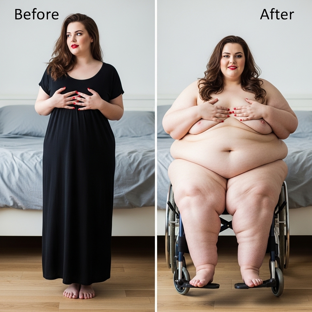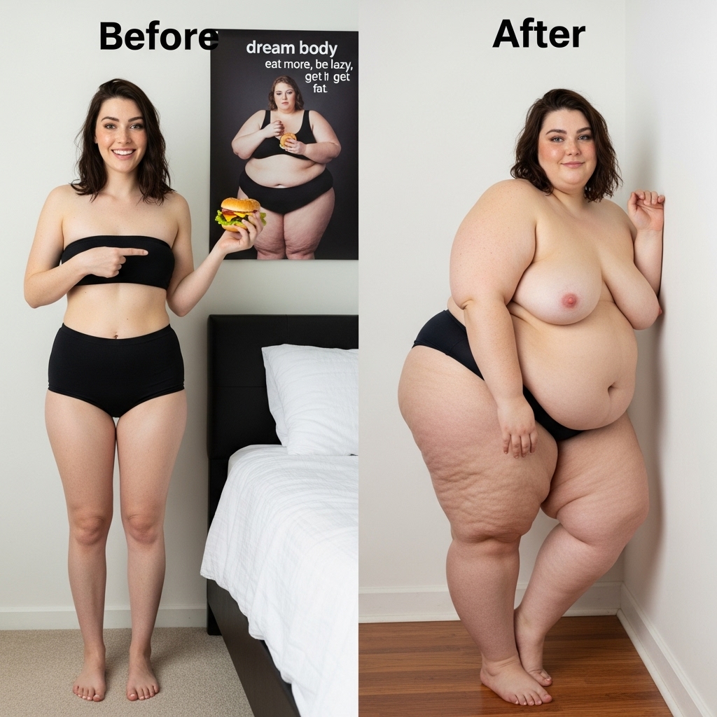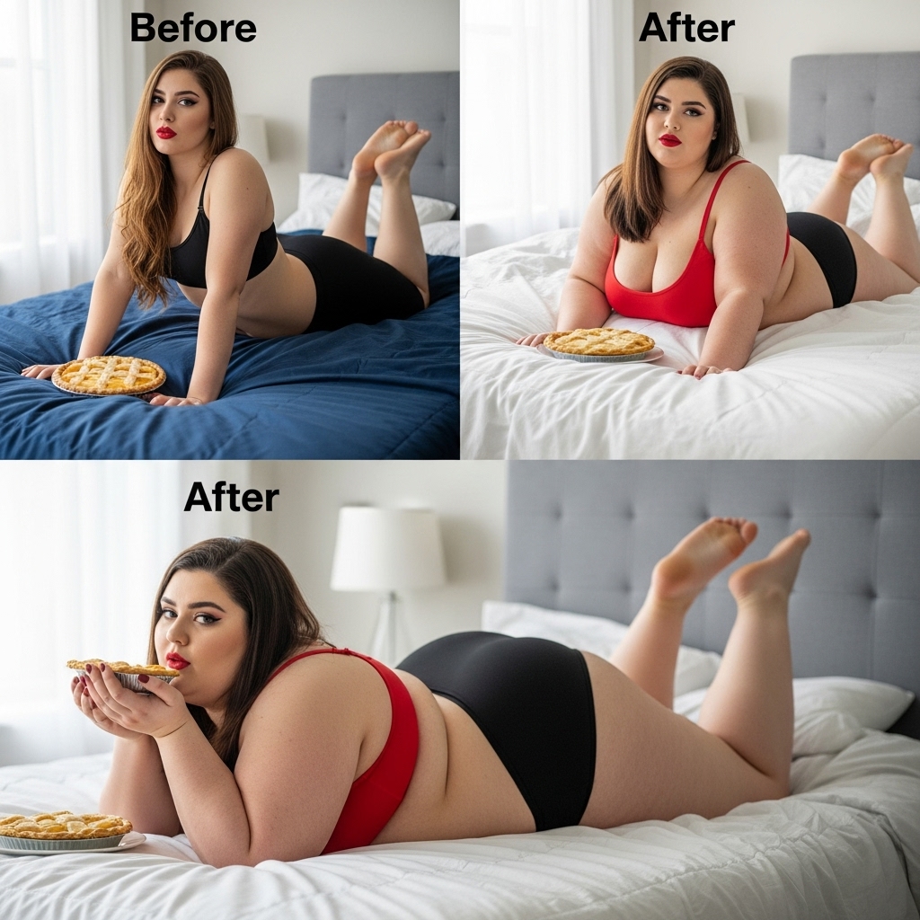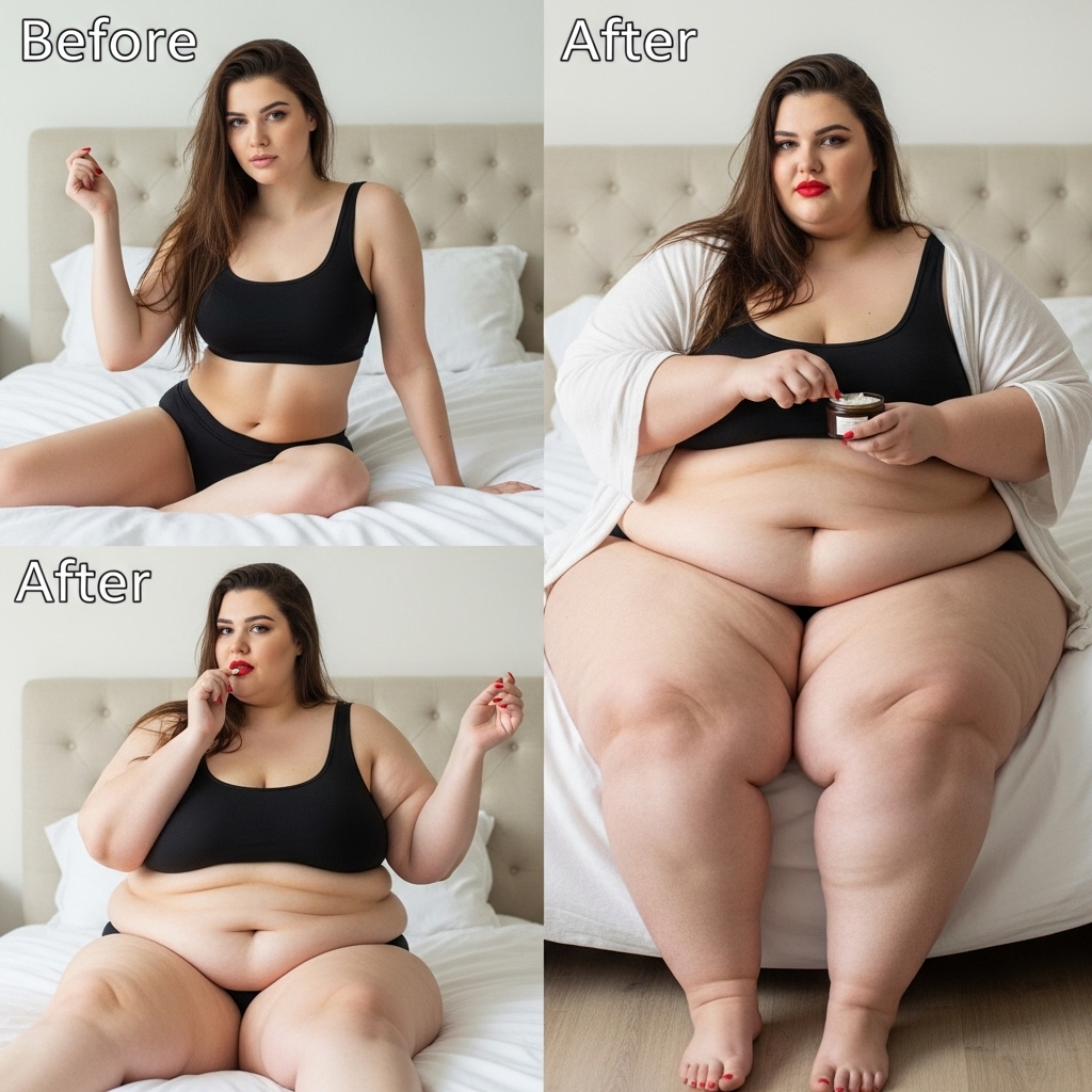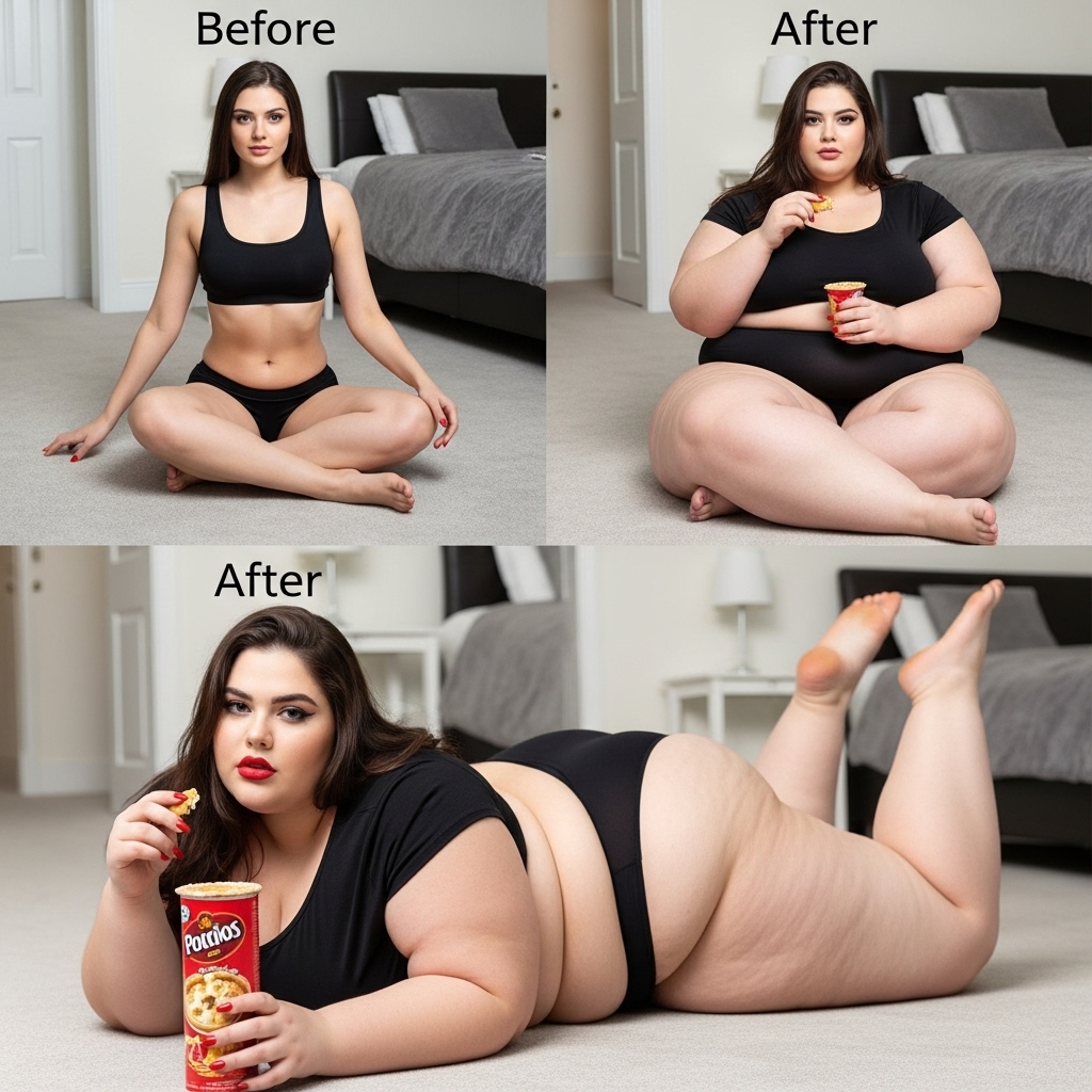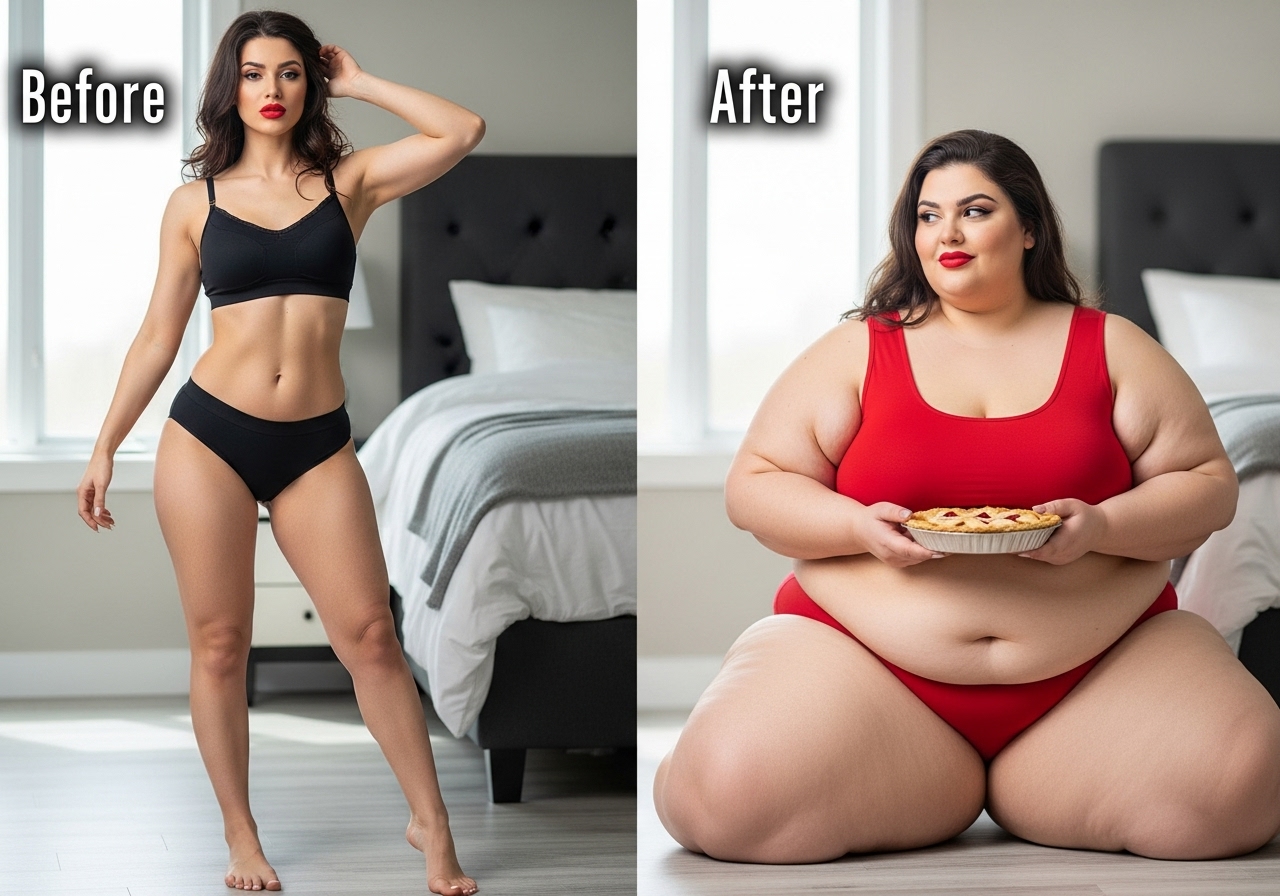 New prompt - works well in all orientations. Before and after of a beautiful long-haired dark brown engliah woman with classic english rose beauty in a bright bedroom that very makes thin people obese and naked. Her hair is in space buns and the same before and after. Before she is slim and very skinny. After she is obese. She is young, in her early twenties and so obese she is a blob, leaning against a wall with a leg in the air, eating a cake. She wears red lipstick and intricate eyeliner and is nakd wearing nothig. She has a chubby face, but the rest of her is very ovese. Her arms are swollen with lymphodemia, covered in heavy cellulite and rolls. Her wrists are swollen and wide with a fat crease between her forearm and hand. Swollen fat hands with inflated large fingers. Her lower half is obese with huge swollen lymphodemic female legs covered in heavy cellulite and rolls. Swollen, wide ankles with a fat rolls across the divide bweteen the calf and foot. Swollen fat feet, with inflated toes.she has an incredibly obese shapeless blob body. She is smirking, and has one swollen foot raised up. young looking, stunning with beautiful makeup and hair. She is incredibly obese with fat spilling everywhere making her blobby. Shes does have a deep double chin hiding her neck. A prominant roll of fat cuts across her swollen forearms and inflated hands. Her swolen ankles are wide and round, with fat covering them as wide as her calves. she has expanded into a gigantically wide mountain of fat spill outward in all directions folding over. Her skin has large stretch marks and blemishes and cellulite all overm damaged by the gain. Her upper arm farm is rolling over her forearms, with multiple rolls and creases at the elbow. Her fupa is out and shaved. Her thighs are marks with cellulite; lard rolling over her knees which are hidden under fat. Her calves are round and large, and are touching one another. Her ankles are round, and split in two by a large fat roll. Her hands and feet are fat, with round plump fingers and toes with fat splaying out. Her feet are obscenely fat.