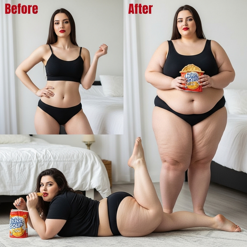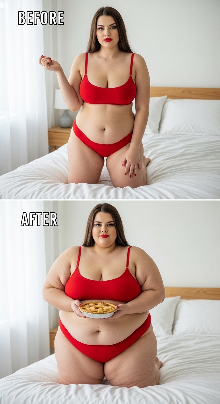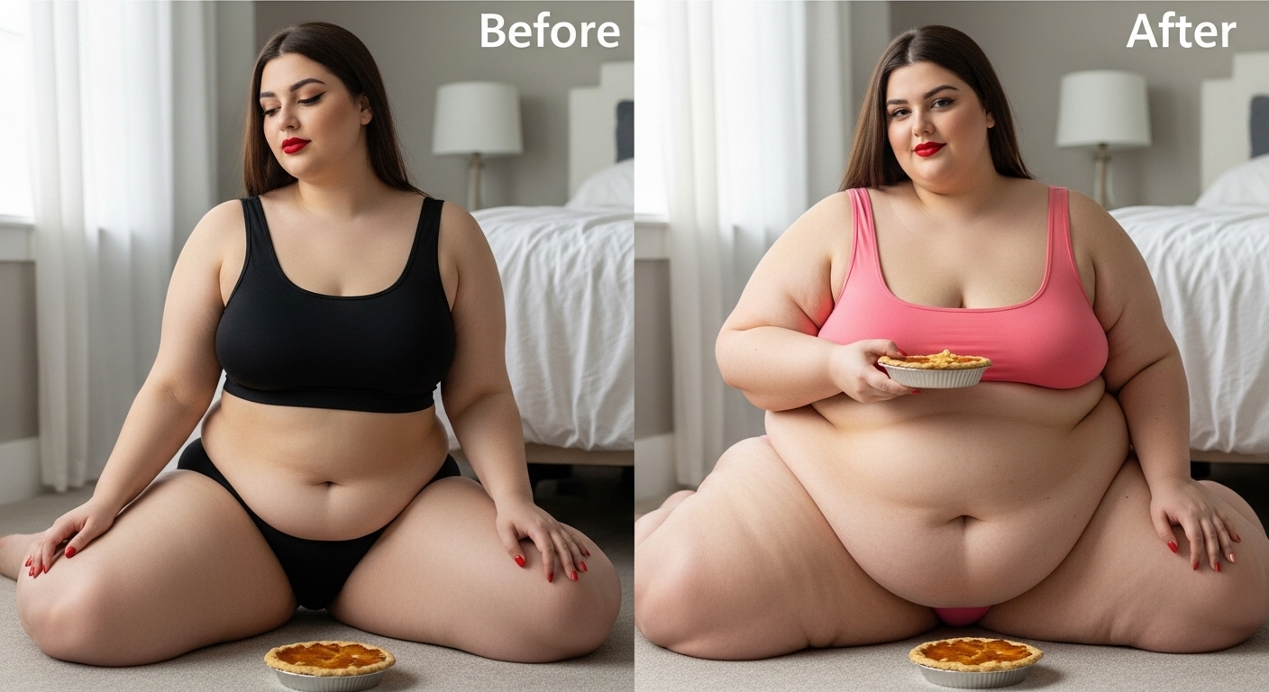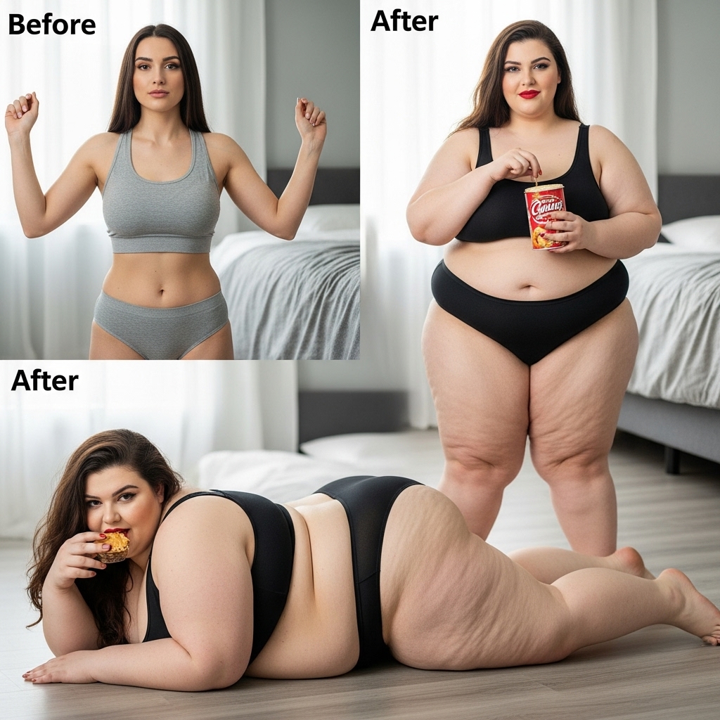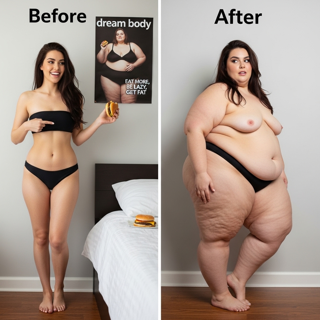 New prompt - works well in all orientations. Before and after of a beautiful long-haired dark brown engliah woman with classic english rose beauty in a bright bedroom that very makes thin people obese and naked. Her hair is in space buns and the same before and after. Before she is slim and very skinny. After she is obese. She is young, in her early twenties and so obese she is a blob, leaning against a wall with a leg in the air, eating a cake. She wears red lipstick and intricate eyeliner and is nakd wearing nothig. She has a chubby face, but the rest of her is very ovese. Her arms are swollen with lymphodemia, covered in heavy cellulite and rolls. Her wrists are swollen and wide with a fat crease between her forearm and hand. Swollen fat hands with inflated large fingers. Her lower half is obese with huge swollen lymphodemic female legs covered in heavy cellulite and rolls. Swollen, wide ankles with a fat rolls across the divide bweteen the calf and foot. Swollen fat feet, with inflated toes.she has an incredibly obese shapeless blob body. She is smirking, and has one swollen foot raised up. young looking, stunning with beautiful makeup and hair. She is incredibly obese with fat spilling everywhere making her blobby. Shes does have a deep double chin hiding her neck. A prominant roll of fat cuts across her swollen forearms and inflated hands. Her swolen ankles are wide and round, with fat covering them as wide as her calves. she has expanded into a gigantically wide mountain of fat spill outward in all directions folding over. Her skin has large stretch marks and blemishes and cellulite all overm damaged by the gain. Her upper arm farm is rolling over her forearms, with multiple rolls and creases at the elbow. Her fupa is out and shaved. Her thighs are marks with cellulite; lard rolling over her knees which are hidden under fat. Her calves are round and large, and are touching one another. Her ankles are round, and split in two by a large fat roll. Her hands and feet are fat, with round plump fingers and toes with fat splaying out. Her feet are obscenely fat.