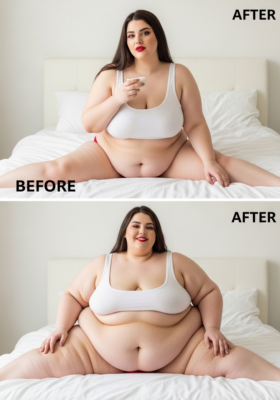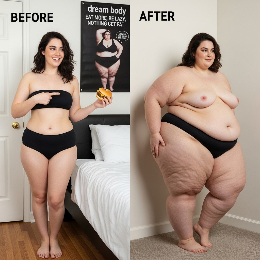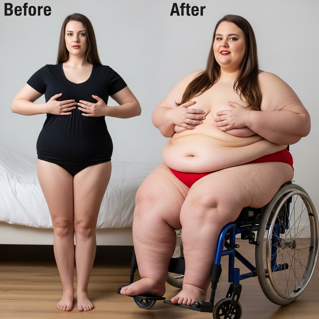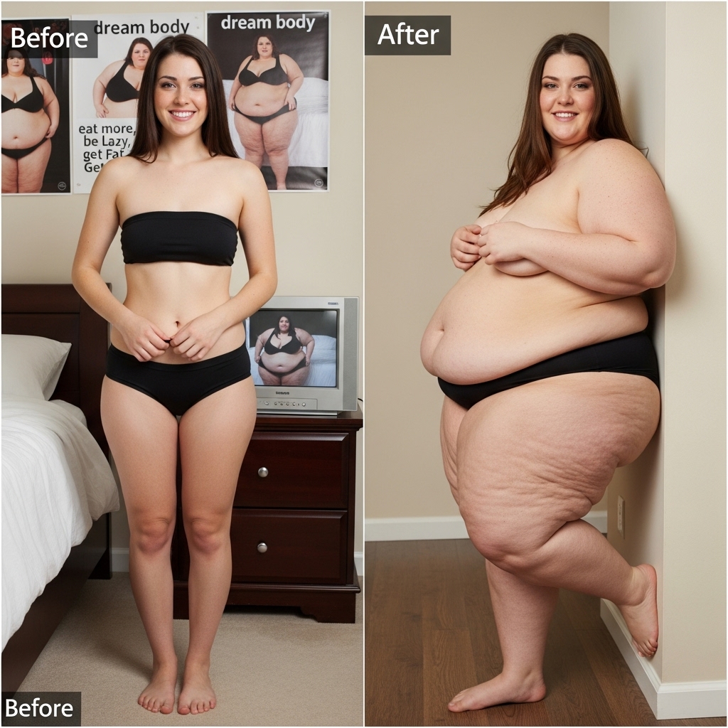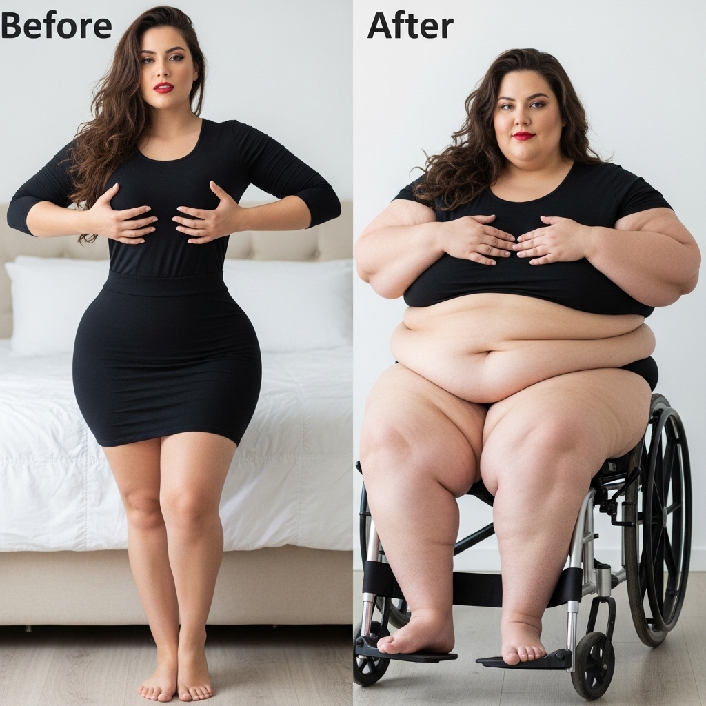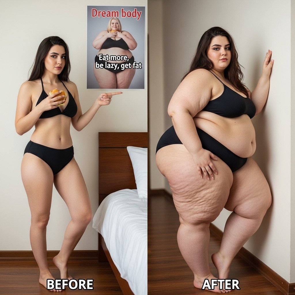 New prompt - works well in all orientations. Before and after of a beautiful long-haired dark brown engliah woman with classic english rose beauty in a bright bedroom that very makes thin people obese and naked. Her hair is in space buns and the same before and after. Before she is slim and very skinny. After she is obese. She is young, in her early twenties and so obese she is a blob, leaning against a wall with a leg in the air, eating a cake. She wears red lipstick and intricate eyeliner and is nakd wearing nothig. She has a chubby face, but the rest of her is very ovese. Her arms are swollen with lymphodemia, covered in heavy cellulite and rolls. Her wrists are swollen and wide with a fat crease between her forearm and hand. Swollen fat hands with inflated large fingers. Her lower half is obese with huge swollen lymphodemic female legs covered in heavy cellulite and rolls. Swollen, wide ankles with a fat rolls across the divide bweteen the calf and foot. Swollen fat feet, with inflated toes.she has an incredibly obese shapeless blob body. She is smirking, and has one swollen foot raised up. young looking, stunning with beautiful makeup and hair. She is incredibly obese with fat spilling everywhere making her blobby. Shes does have a deep double chin hiding her neck. A prominant roll of fat cuts across her swollen forearms and inflated hands. Her swolen ankles are wide and round, with fat covering them as wide as her calves. she has expanded into a gigantically wide mountain of fat spill outward in all directions folding over. Her skin has large stretch marks and blemishes and cellulite all overm damaged by the gain. Her upper arm farm is rolling over her forearms, with multiple rolls and creases at the elbow. Her fupa is out and shaved. Her thighs are marks with cellulite; lard rolling over her knees which are hidden under fat. Her calves are round and large, and are touching one another. Her ankles are round, and split in two by a large fat roll. Her hands and feet are fat, with round plump fingers and toes with fat splaying out. Her feet are obscenely fat.