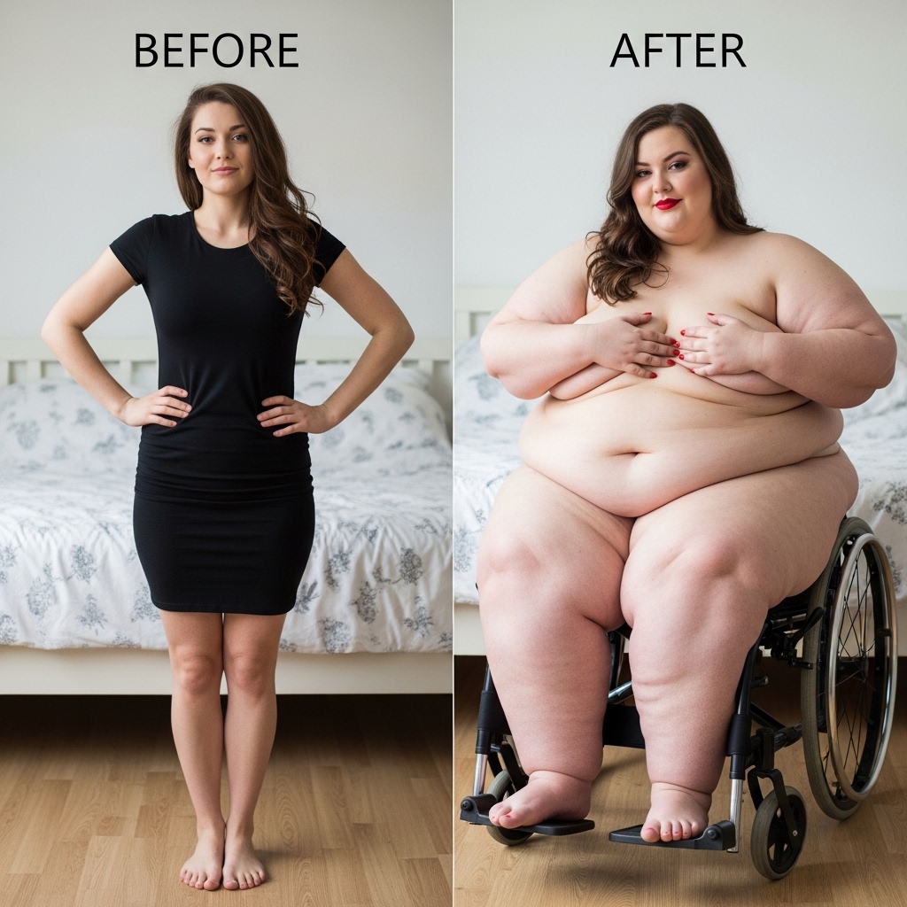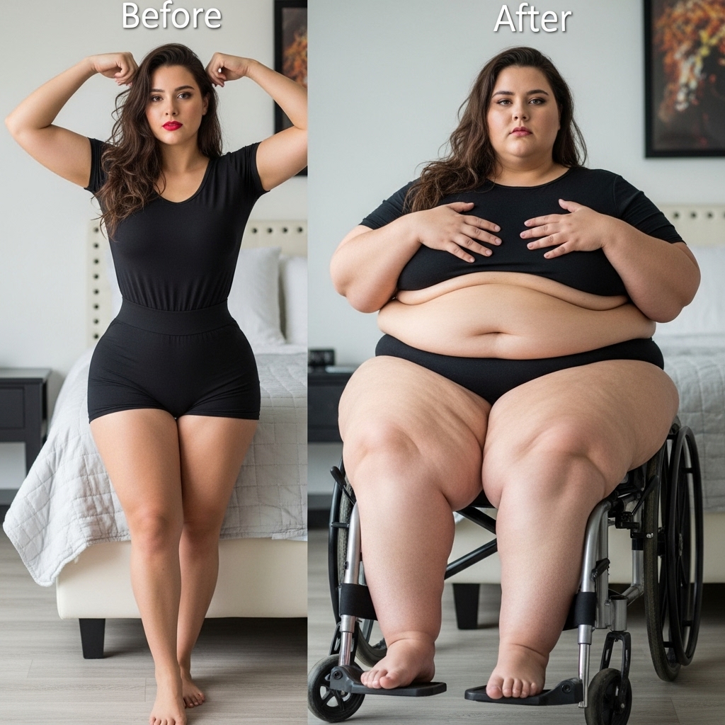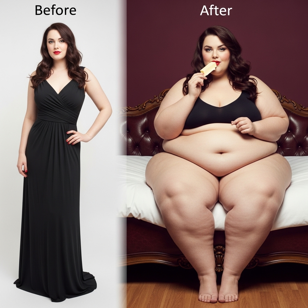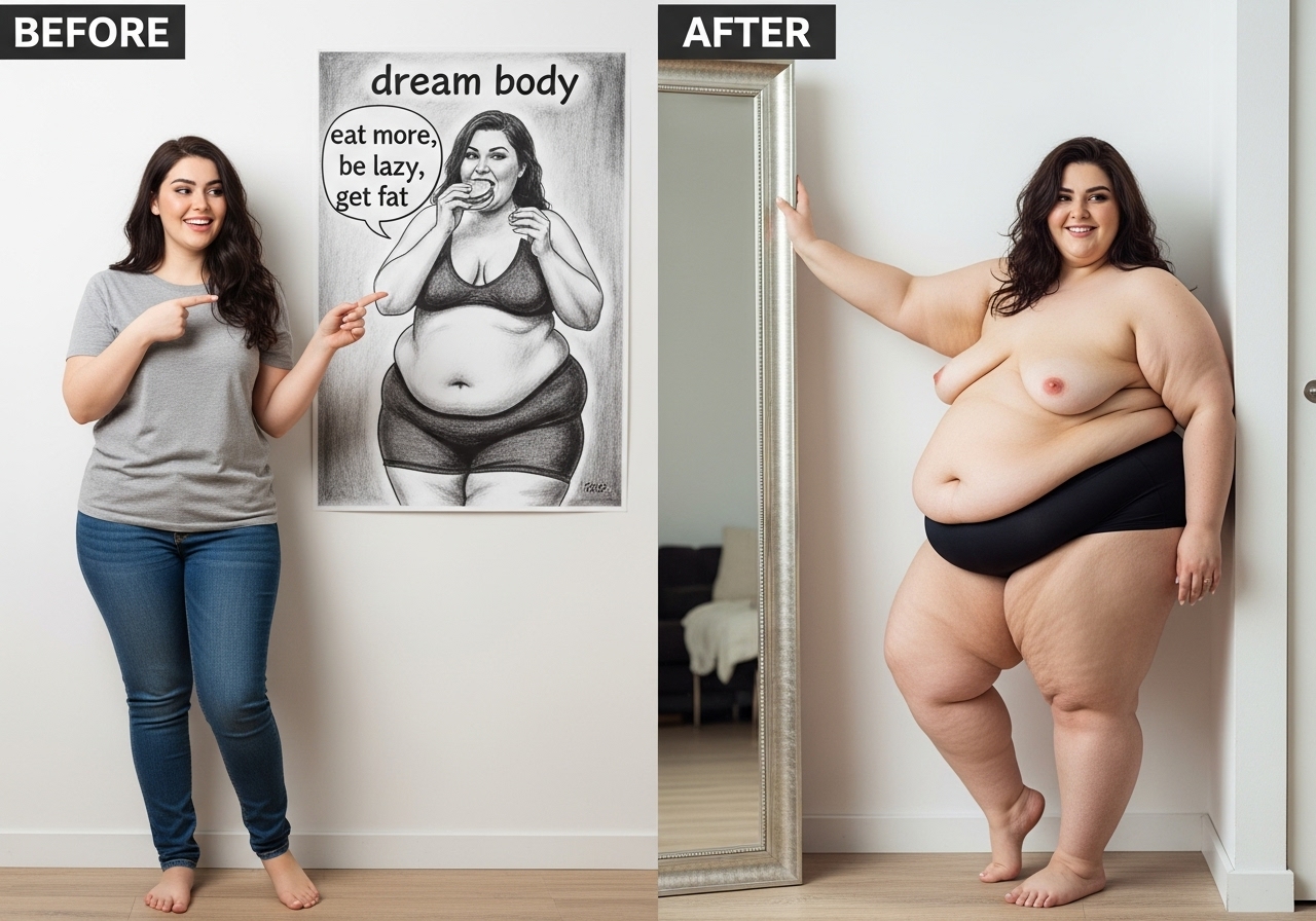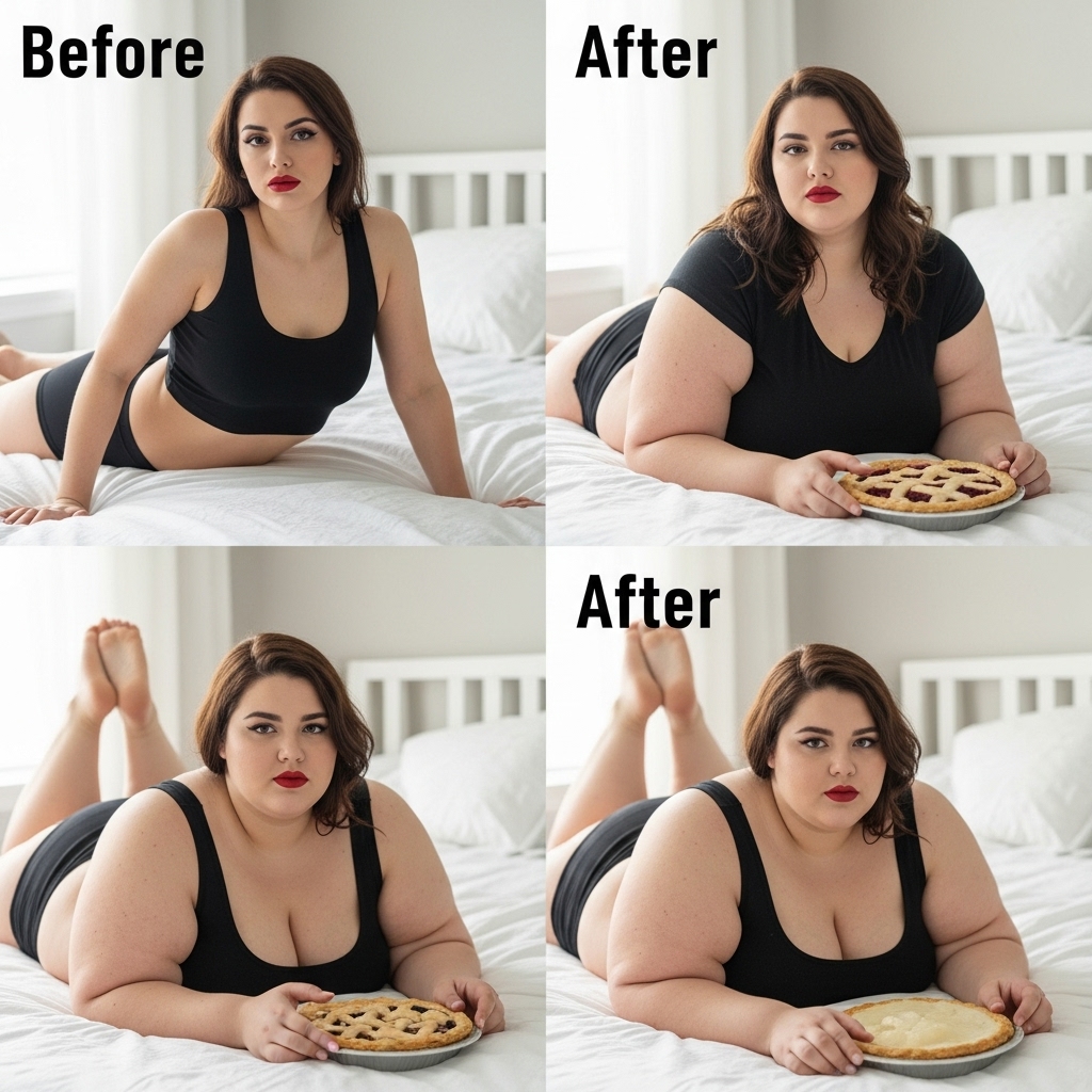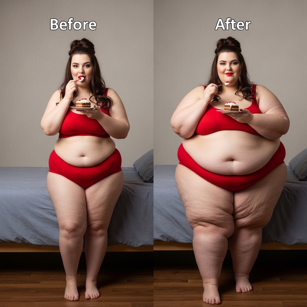 New prompt - works well in all orientations. Before and after of a beautiful long-haired dark brown engliah woman with classic english rose beauty in a bright bedroom that very makes thin people obese and naked. Her hair is in space buns and the same before and after. Before she is slim and very skinny. After she is obese. She is young, in her early twenties and so obese she is a blob, leaning against a wall with a leg in the air, eating a cake. She wears red lipstick and intricate eyeliner and is nakd wearing nothig. She has a chubby face, but the rest of her is very ovese. Her arms are swollen with lymphodemia, covered in heavy cellulite and rolls. Her wrists are swollen and wide with a fat crease between her forearm and hand. Swollen fat hands with inflated large fingers. Her lower half is obese with huge swollen lymphodemic female legs covered in heavy cellulite and rolls. Swollen, wide ankles with a fat rolls across the divide bweteen the calf and foot. Swollen fat feet, with inflated toes.she has an incredibly obese shapeless blob body. She is smirking, and has one swollen foot raised up. young looking, stunning with beautiful makeup and hair. She is incredibly obese with fat spilling everywhere making her blobby. Shes does have a deep double chin hiding her neck. A prominant roll of fat cuts across her swollen forearms and inflated hands. Her swolen ankles are wide and round, with fat covering them as wide as her calves. she has expanded into a gigantically wide mountain of fat spill outward in all directions folding over. Her skin has large stretch marks and blemishes and cellulite all overm damaged by the gain. Her upper arm farm is rolling over her forearms, with multiple rolls and creases at the elbow. Her fupa is out and shaved. Her thighs are marks with cellulite; lard rolling over her knees which are hidden under fat. Her calves are round and large, and are touching one another. Her ankles are round, and split in two by a large fat roll. Her hands and feet are fat, with round plump fingers and toes with fat splaying out. Her feet are obscenely fat.