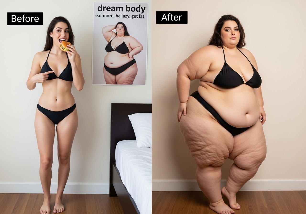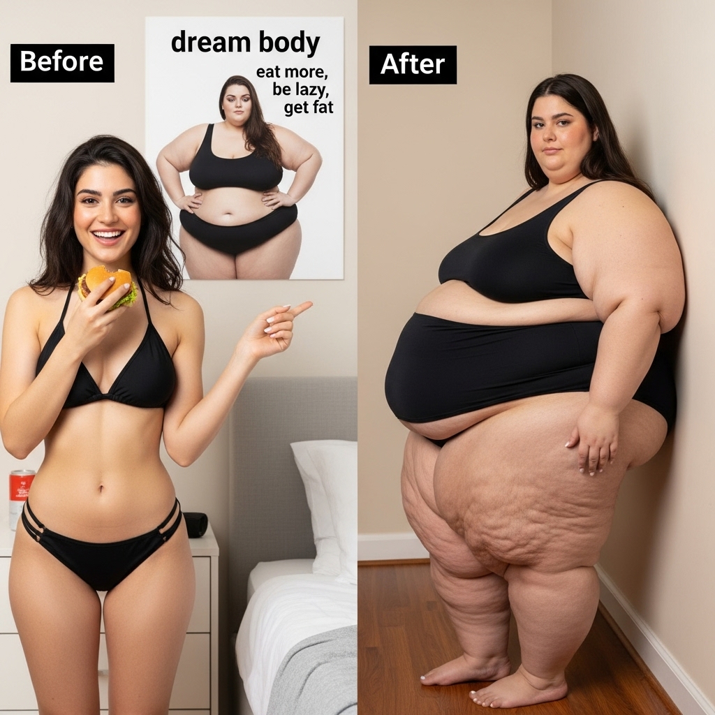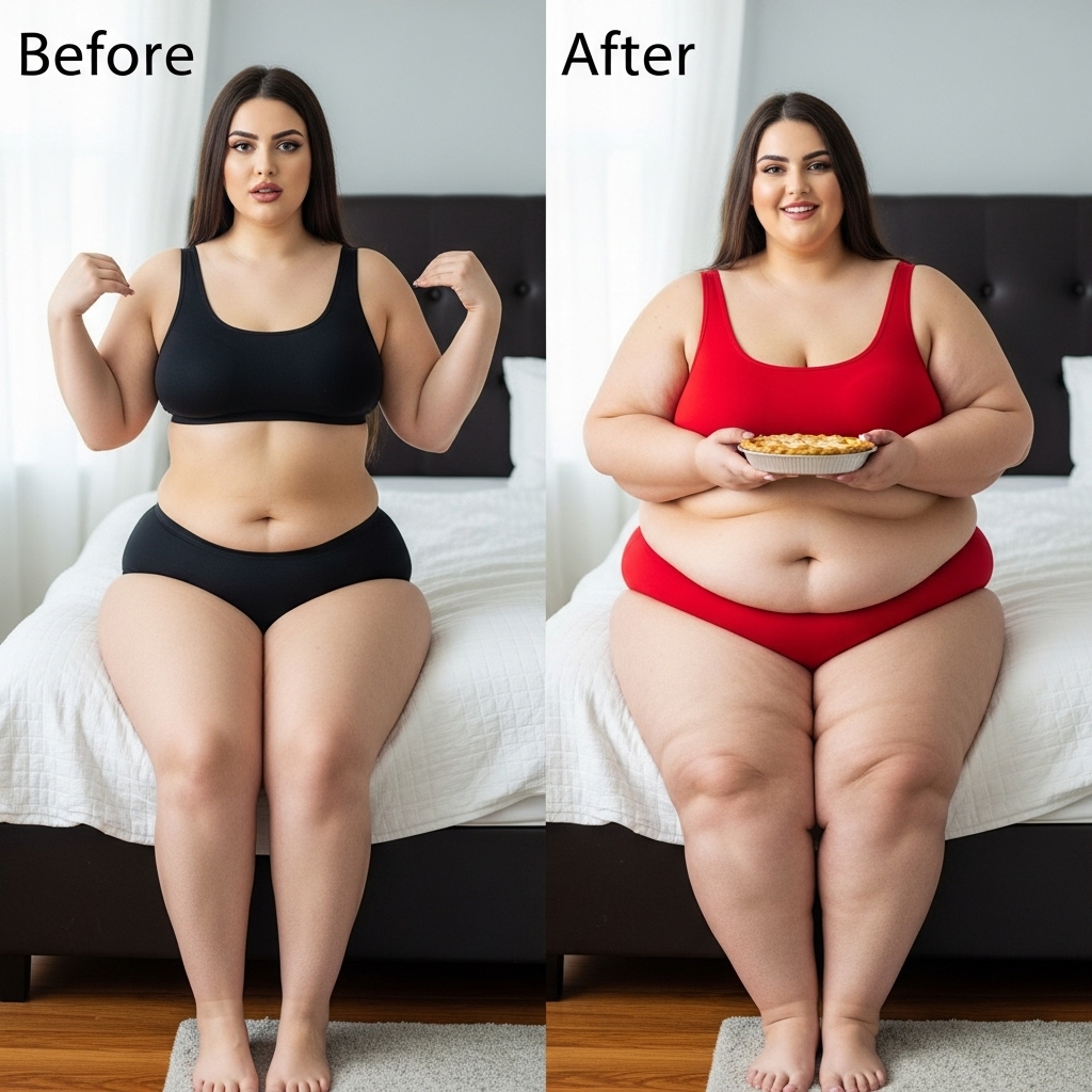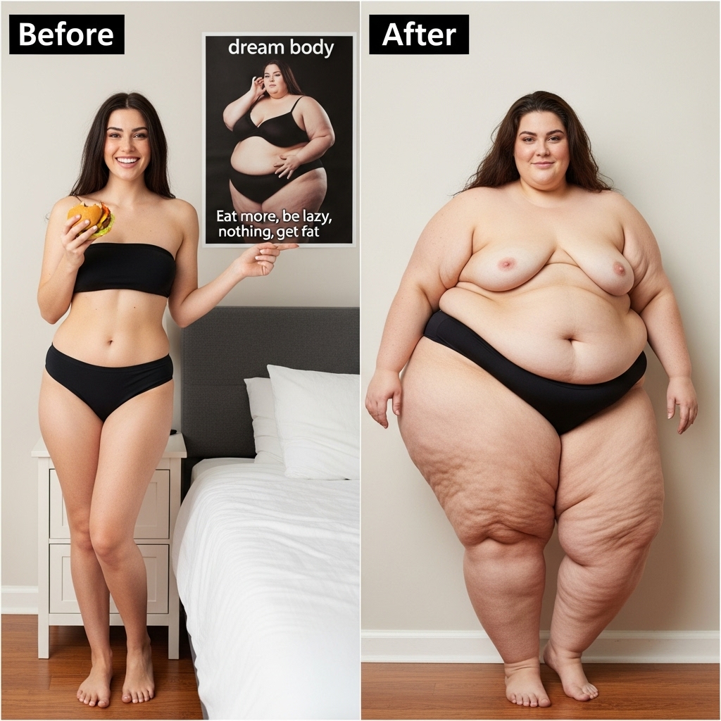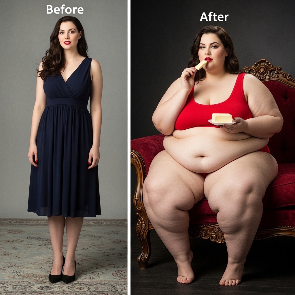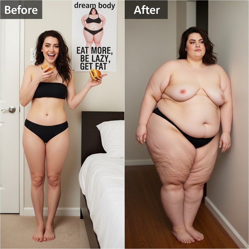 New prompt - works well in all orientations. Before and after of a beautiful long-haired dark brown engliah woman with classic english rose beauty in a bright bedroom that very makes thin people obese and naked. Her hair is in space buns and the same before and after. Before she is slim and very skinny. After she is obese. She is young, in her early twenties and so obese she is a blob, leaning against a wall with a leg in the air, eating a cake. She wears red lipstick and intricate eyeliner and is nakd wearing nothig. She has a chubby face, but the rest of her is very ovese. Her arms are swollen with lymphodemia, covered in heavy cellulite and rolls. Her wrists are swollen and wide with a fat crease between her forearm and hand. Swollen fat hands with inflated large fingers. Her lower half is obese with huge swollen lymphodemic female legs covered in heavy cellulite and rolls. Swollen, wide ankles with a fat rolls across the divide bweteen the calf and foot. Swollen fat feet, with inflated toes.she has an incredibly obese shapeless blob body. She is smirking, and has one swollen foot raised up. young looking, stunning with beautiful makeup and hair. She is incredibly obese with fat spilling everywhere making her blobby. Shes does have a deep double chin hiding her neck. A prominant roll of fat cuts across her swollen forearms and inflated hands. Her swolen ankles are wide and round, with fat covering them as wide as her calves. she has expanded into a gigantically wide mountain of fat spill outward in all directions folding over. Her skin has large stretch marks and blemishes and cellulite all overm damaged by the gain. Her upper arm farm is rolling over her forearms, with multiple rolls and creases at the elbow. Her fupa is out and shaved. Her thighs are marks with cellulite; lard rolling over her knees which are hidden under fat. Her calves are round and large, and are touching one another. Her ankles are round, and split in two by a large fat roll. Her hands and feet are fat, with round plump fingers and toes with fat splaying out. Her feet are obscenely fat.