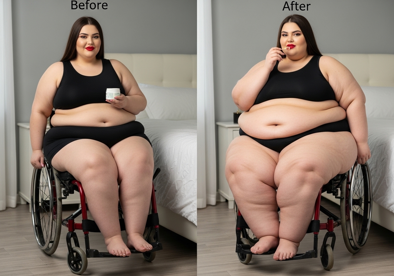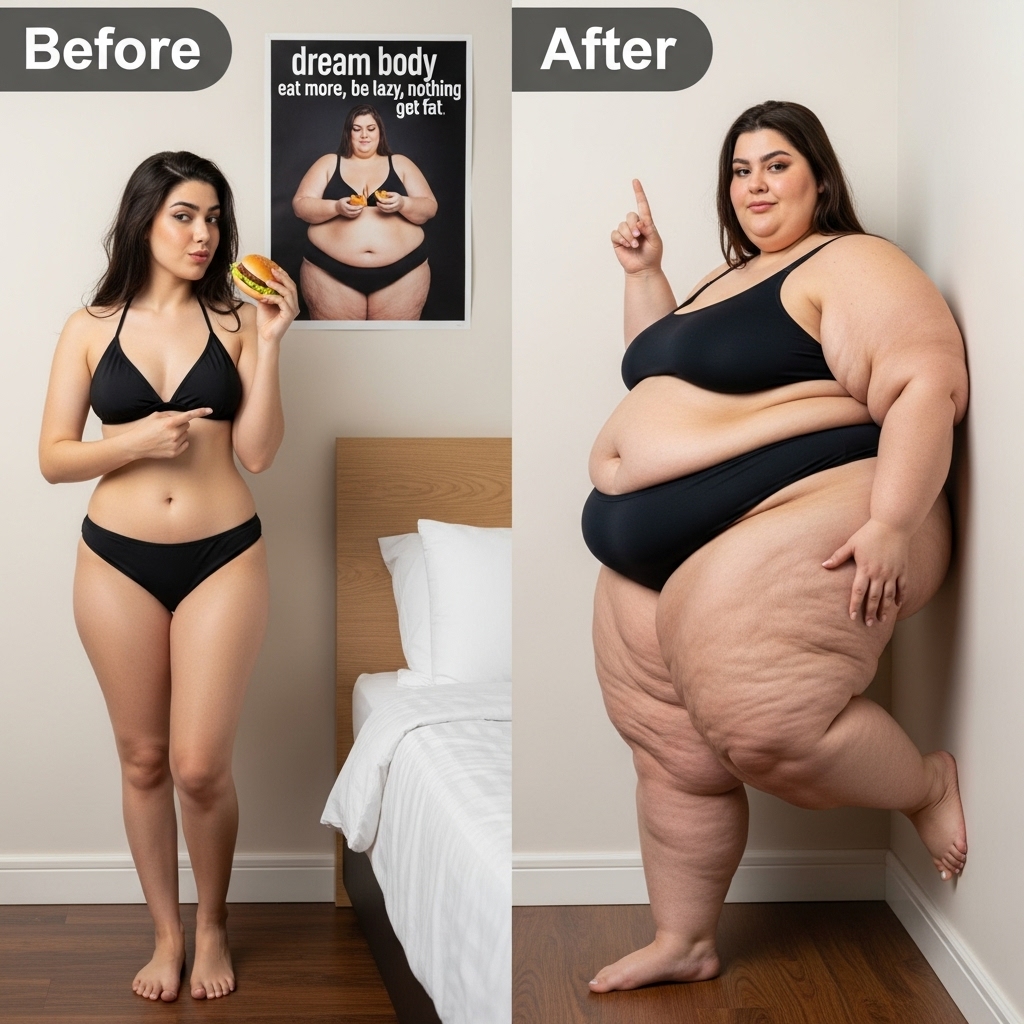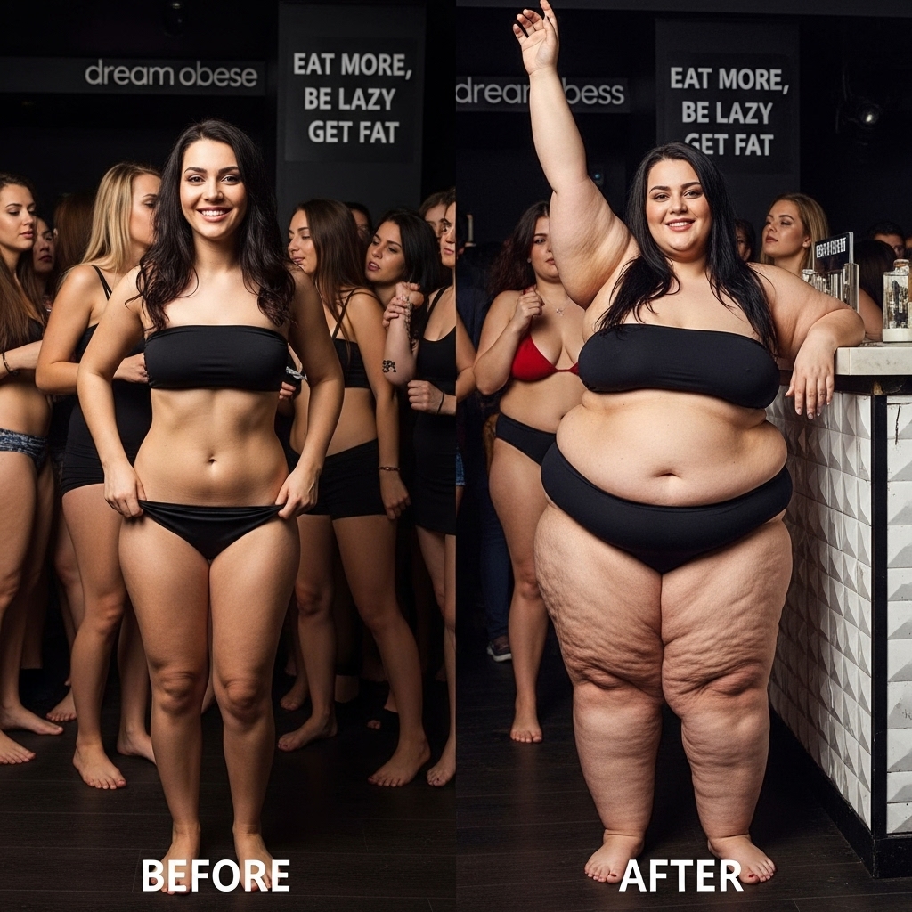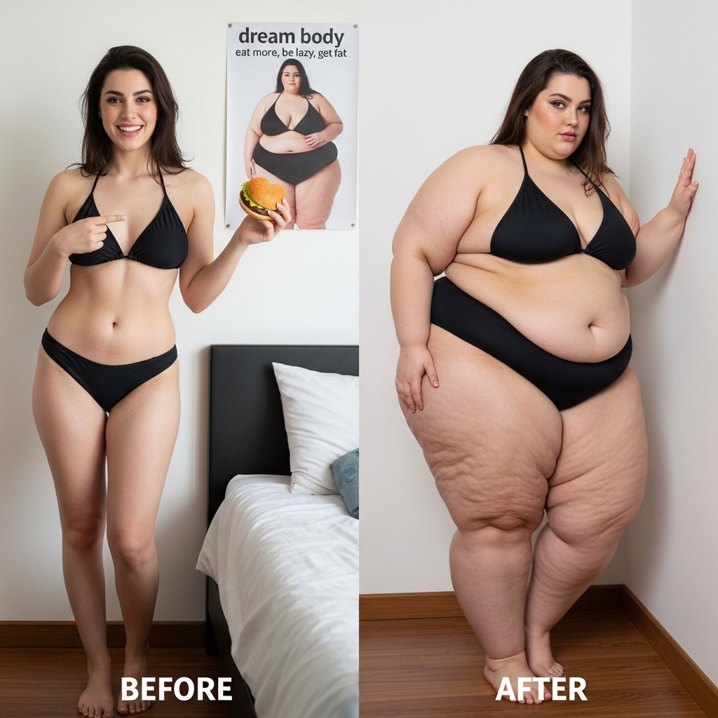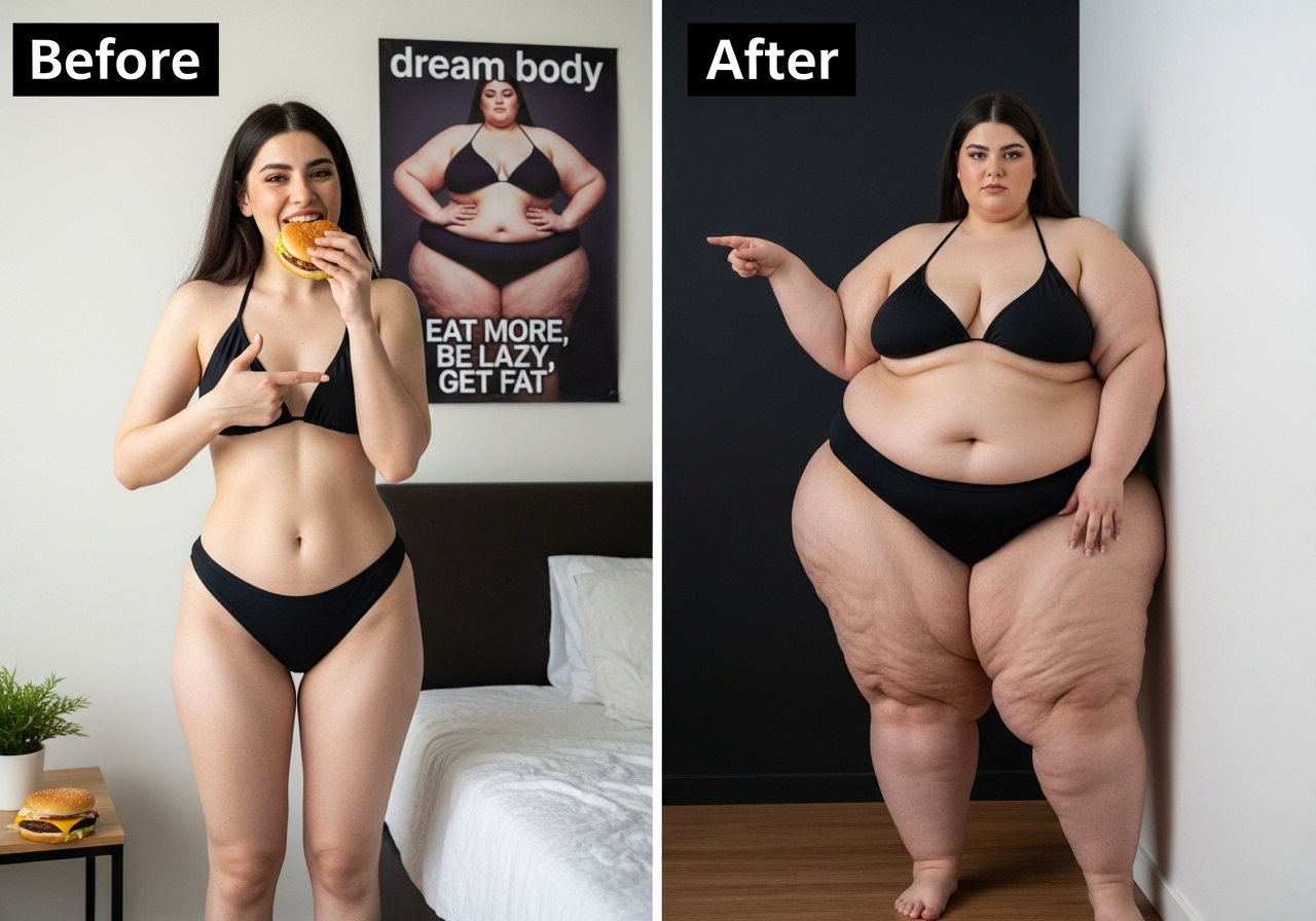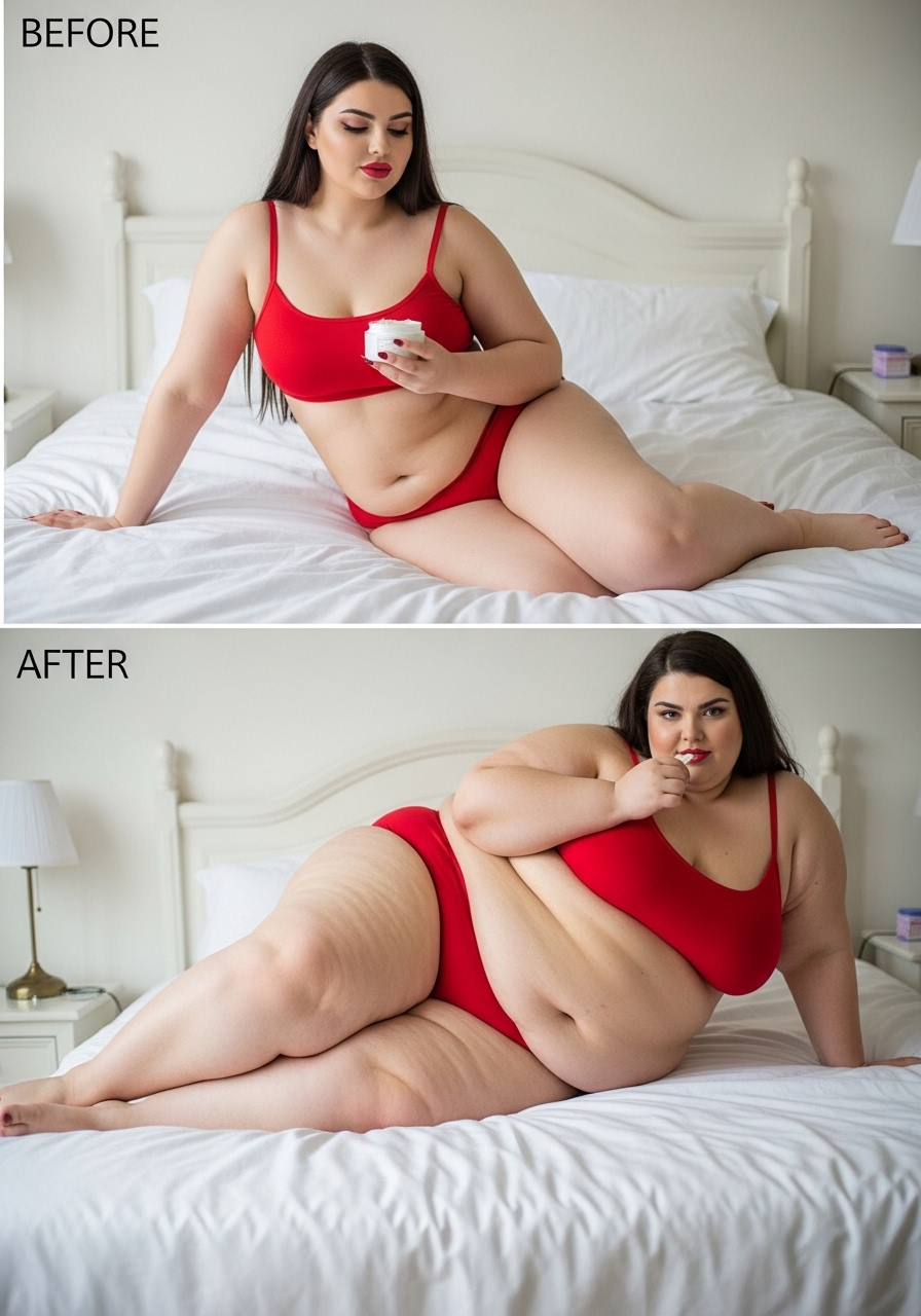 New prompt - works well in all orientations. Before and after of a beautiful long-haired dark brown engliah woman with classic english rose beauty in a bright bedroom that very makes thin people obese and naked. Her hair is in space buns and the same before and after. Before she is slim and very skinny. After she is obese. She is young, in her early twenties and so obese she is a blob, leaning against a wall with a leg in the air, eating a cake. She wears red lipstick and intricate eyeliner and is nakd wearing nothig. She has a chubby face, but the rest of her is very ovese. Her arms are swollen with lymphodemia, covered in heavy cellulite and rolls. Her wrists are swollen and wide with a fat crease between her forearm and hand. Swollen fat hands with inflated large fingers. Her lower half is obese with huge swollen lymphodemic female legs covered in heavy cellulite and rolls. Swollen, wide ankles with a fat rolls across the divide bweteen the calf and foot. Swollen fat feet, with inflated toes.she has an incredibly obese shapeless blob body. She is smirking, and has one swollen foot raised up. young looking, stunning with beautiful makeup and hair. She is incredibly obese with fat spilling everywhere making her blobby. Shes does have a deep double chin hiding her neck. A prominant roll of fat cuts across her swollen forearms and inflated hands. Her swolen ankles are wide and round, with fat covering them as wide as her calves. she has expanded into a gigantically wide mountain of fat spill outward in all directions folding over. Her skin has large stretch marks and blemishes and cellulite all overm damaged by the gain. Her upper arm farm is rolling over her forearms, with multiple rolls and creases at the elbow. Her fupa is out and shaved. Her thighs are marks with cellulite; lard rolling over her knees which are hidden under fat. Her calves are round and large, and are touching one another. Her ankles are round, and split in two by a large fat roll. Her hands and feet are fat, with round plump fingers and toes with fat splaying out. Her feet are obscenely fat.
