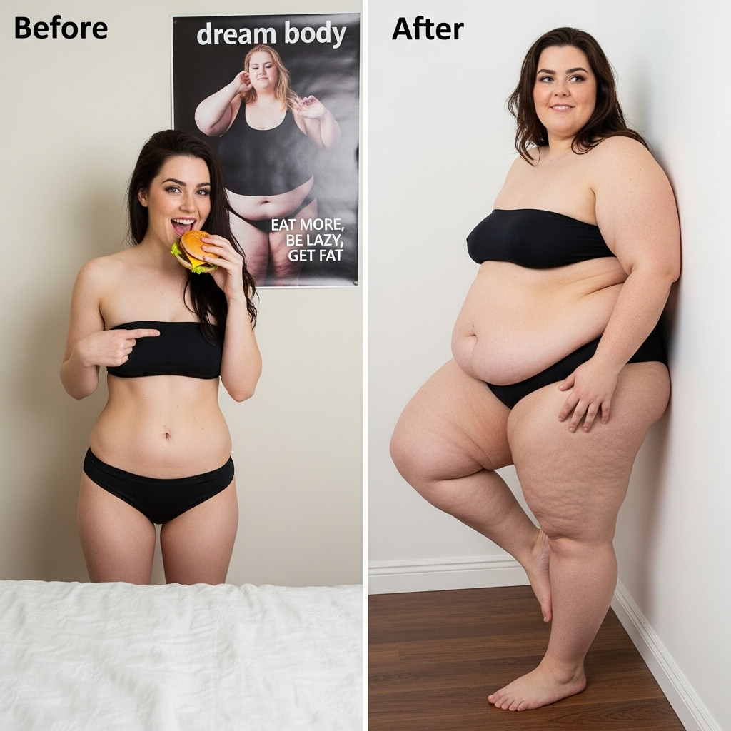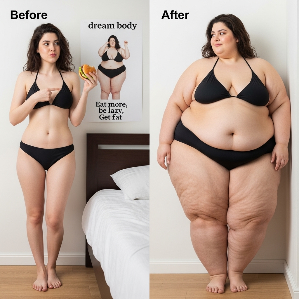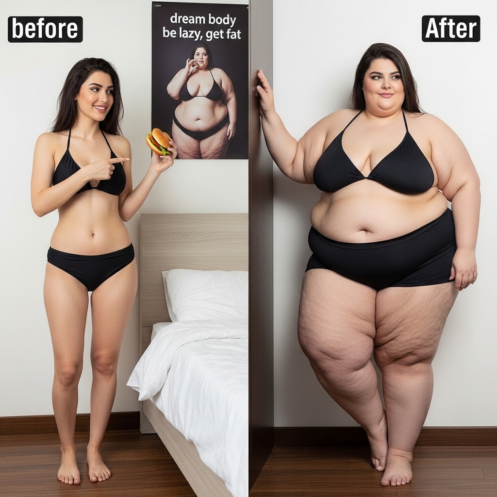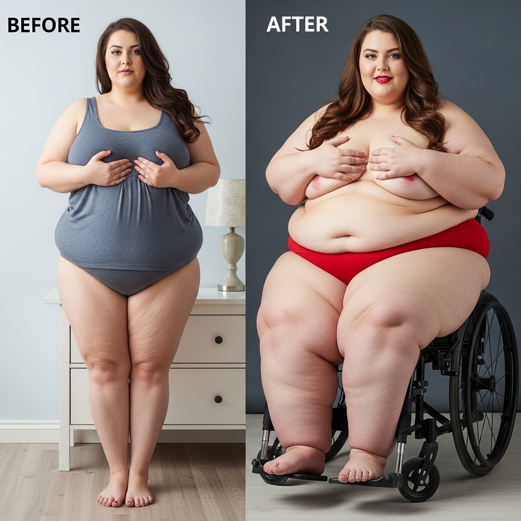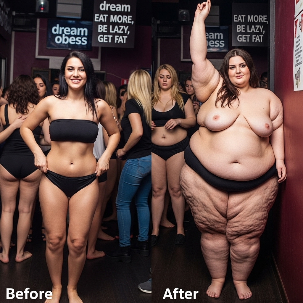 New prompt - works well in all orientations. Before and after of a beautiful long-haired dark brown engliah woman with classic english rose beauty in a bright bedroom that very makes thin people obese and naked. Her hair is in space buns and the same before and after. Before she is slim and very skinny. After she is obese. She is young, in her early twenties and so obese she is a blob, leaning against a wall with a leg in the air, eating a cake. She wears red lipstick and intricate eyeliner and is nakd wearing nothig. She has a chubby face, but the rest of her is very ovese. Her arms are swollen with lymphodemia, covered in heavy cellulite and rolls. Her wrists are swollen and wide with a fat crease between her forearm and hand. Swollen fat hands with inflated large fingers. Her lower half is obese with huge swollen lymphodemic female legs covered in heavy cellulite and rolls. Swollen, wide ankles with a fat rolls across the divide bweteen the calf and foot. Swollen fat feet, with inflated toes.she has an incredibly obese shapeless blob body. She is smirking, and has one swollen foot raised up. young looking, stunning with beautiful makeup and hair. She is incredibly obese with fat spilling everywhere making her blobby. Shes does have a deep double chin hiding her neck. A prominant roll of fat cuts across her swollen forearms and inflated hands. Her swolen ankles are wide and round, with fat covering them as wide as her calves. she has expanded into a gigantically wide mountain of fat spill outward in all directions folding over. Her skin has large stretch marks and blemishes and cellulite all overm damaged by the gain. Her upper arm farm is rolling over her forearms, with multiple rolls and creases at the elbow. Her fupa is out and shaved. Her thighs are marks with cellulite; lard rolling over her knees which are hidden under fat. Her calves are round and large, and are touching one another. Her ankles are round, and split in two by a large fat roll. Her hands and feet are fat, with round plump fingers and toes with fat splaying out. Her feet are obscenely fat.