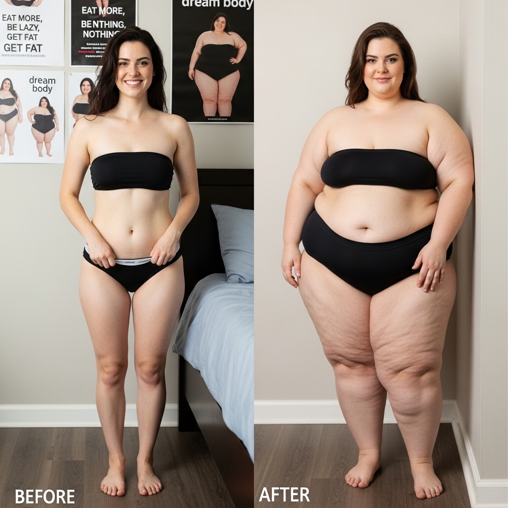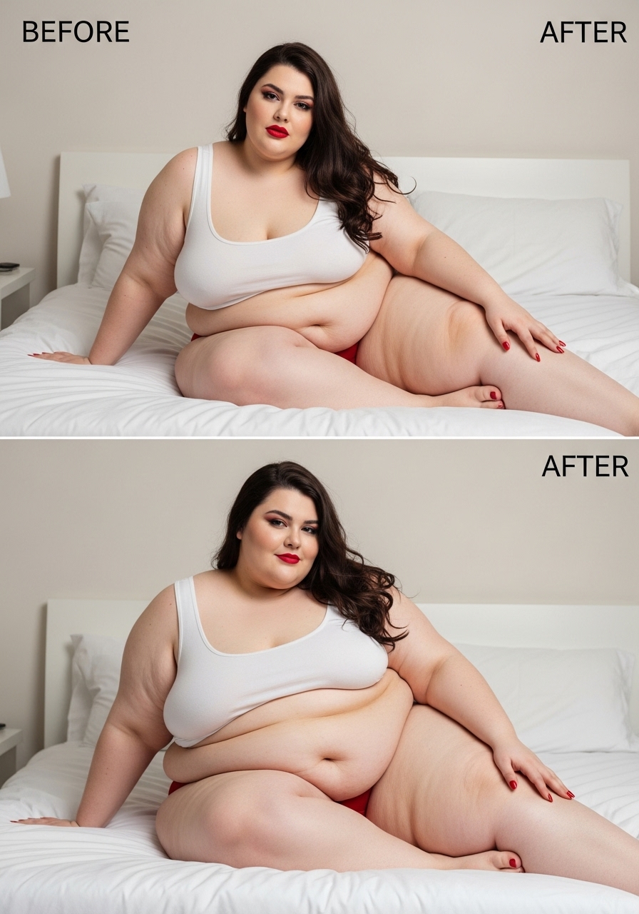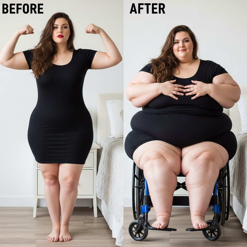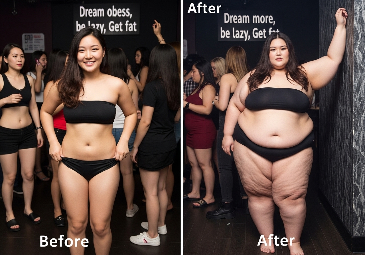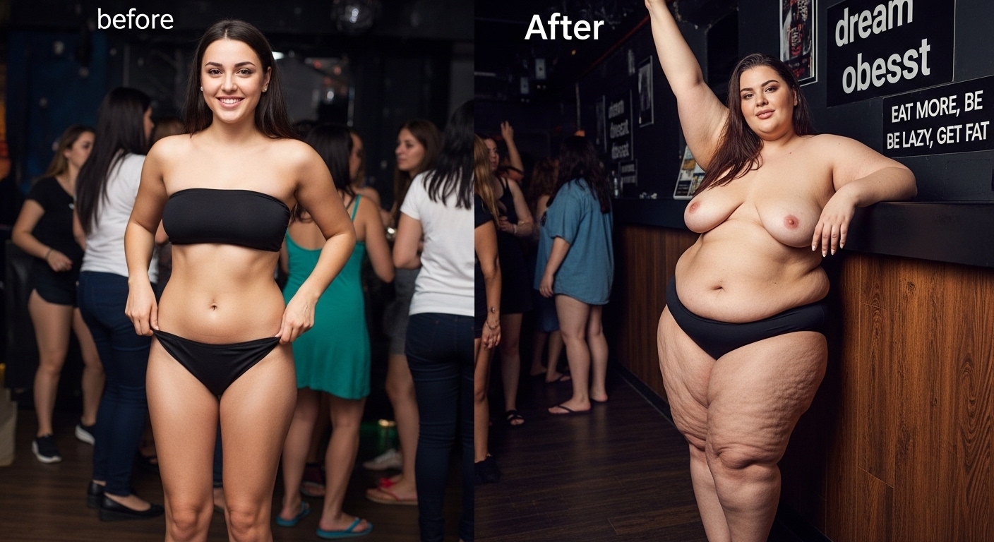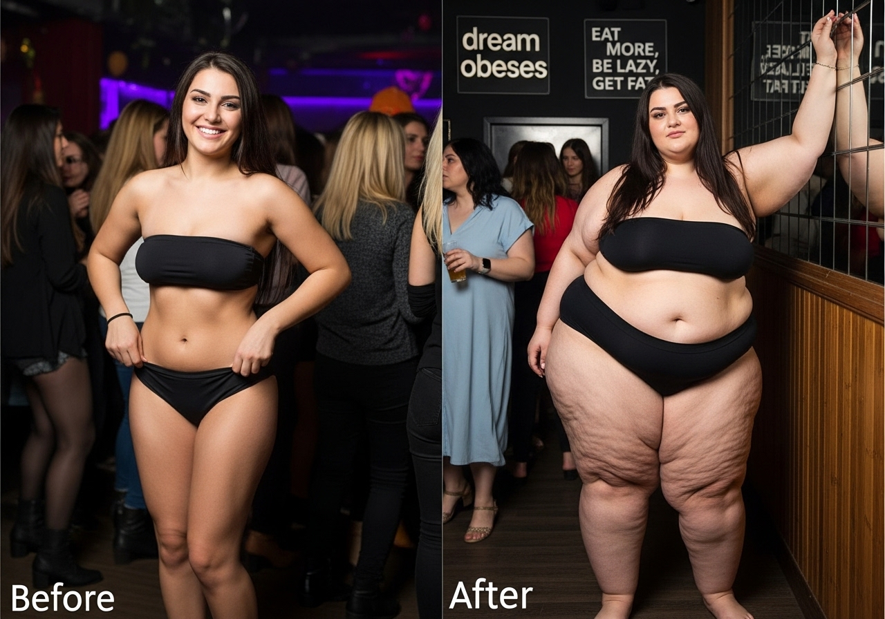 New prompt - works well in all orientations. Before and after of a beautiful long-haired dark brown engliah woman with classic english rose beauty in a bright bedroom that very makes thin people obese and naked. Her hair is in space buns and the same before and after. Before she is slim and very skinny. After she is obese. She is young, in her early twenties and so obese she is a blob, leaning against a wall with a leg in the air, eating a cake. She wears red lipstick and intricate eyeliner and is nakd wearing nothig. She has a chubby face, but the rest of her is very ovese. Her arms are swollen with lymphodemia, covered in heavy cellulite and rolls. Her wrists are swollen and wide with a fat crease between her forearm and hand. Swollen fat hands with inflated large fingers. Her lower half is obese with huge swollen lymphodemic female legs covered in heavy cellulite and rolls. Swollen, wide ankles with a fat rolls across the divide bweteen the calf and foot. Swollen fat feet, with inflated toes.she has an incredibly obese shapeless blob body. She is smirking, and has one swollen foot raised up. young looking, stunning with beautiful makeup and hair. She is incredibly obese with fat spilling everywhere making her blobby. Shes does have a deep double chin hiding her neck. A prominant roll of fat cuts across her swollen forearms and inflated hands. Her swolen ankles are wide and round, with fat covering them as wide as her calves. she has expanded into a gigantically wide mountain of fat spill outward in all directions folding over. Her skin has large stretch marks and blemishes and cellulite all overm damaged by the gain. Her upper arm farm is rolling over her forearms, with multiple rolls and creases at the elbow. Her fupa is out and shaved. Her thighs are marks with cellulite; lard rolling over her knees which are hidden under fat. Her calves are round and large, and are touching one another. Her ankles are round, and split in two by a large fat roll. Her hands and feet are fat, with round plump fingers and toes with fat splaying out. Her feet are obscenely fat.