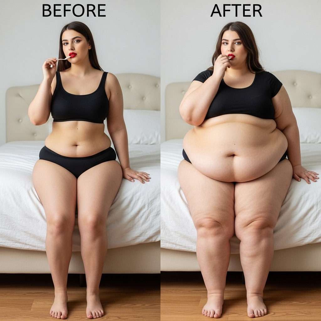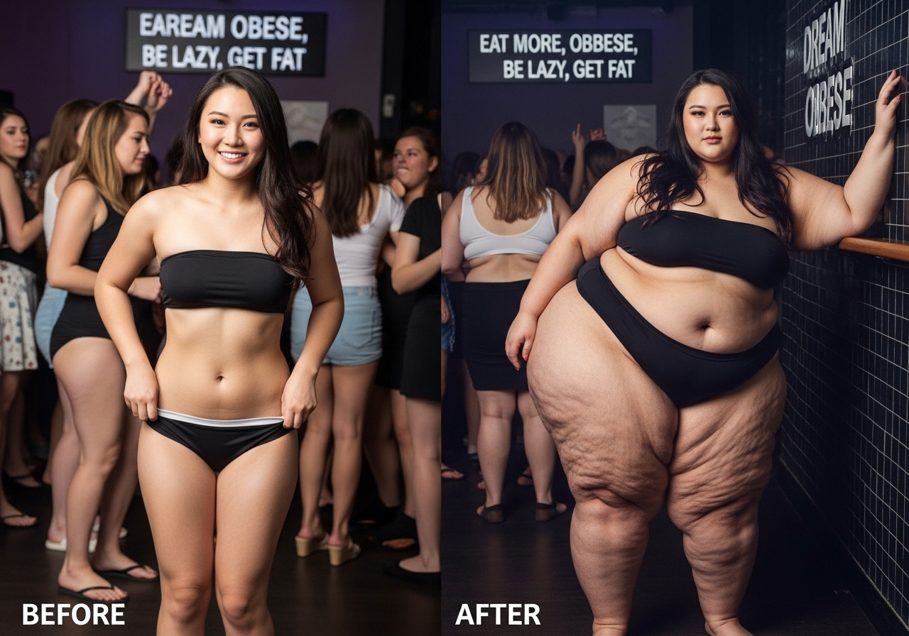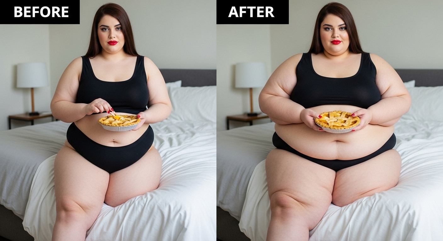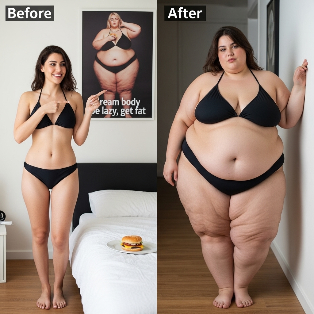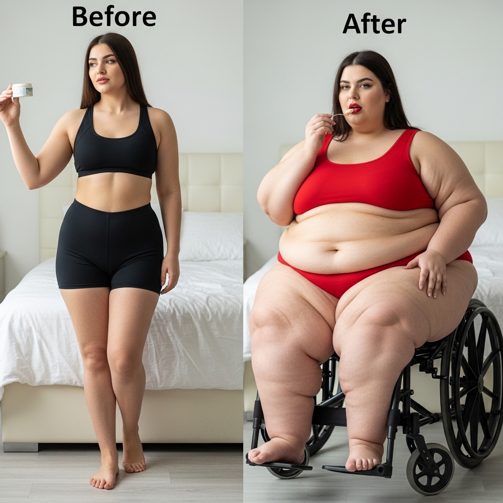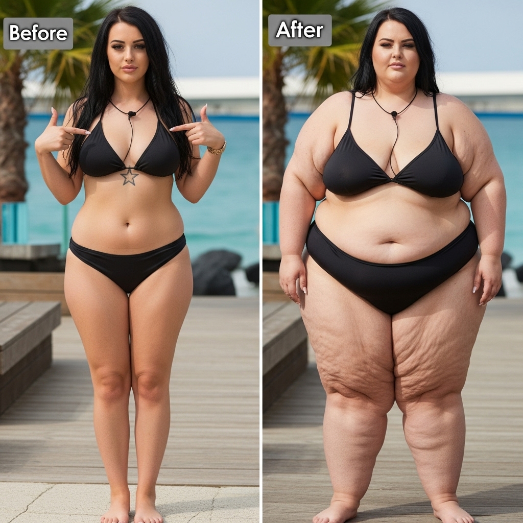 New prompt - works well in all orientations. Before and after of a beautiful long-haired dark brown engliah woman with classic english rose beauty in a bright bedroom that very makes thin people obese and naked. Her hair is in space buns and the same before and after. Before she is slim and very skinny. After she is obese. She is young, in her early twenties and so obese she is a blob, leaning against a wall with a leg in the air, eating a cake. She wears red lipstick and intricate eyeliner and is nakd wearing nothig. She has a chubby face, but the rest of her is very ovese. Her arms are swollen with lymphodemia, covered in heavy cellulite and rolls. Her wrists are swollen and wide with a fat crease between her forearm and hand. Swollen fat hands with inflated large fingers. Her lower half is obese with huge swollen lymphodemic female legs covered in heavy cellulite and rolls. Swollen, wide ankles with a fat rolls across the divide bweteen the calf and foot. Swollen fat feet, with inflated toes.she has an incredibly obese shapeless blob body. She is smirking, and has one swollen foot raised up. young looking, stunning with beautiful makeup and hair. She is incredibly obese with fat spilling everywhere making her blobby. Shes does have a deep double chin hiding her neck. A prominant roll of fat cuts across her swollen forearms and inflated hands. Her swolen ankles are wide and round, with fat covering them as wide as her calves. she has expanded into a gigantically wide mountain of fat spill outward in all directions folding over. Her skin has large stretch marks and blemishes and cellulite all overm damaged by the gain. Her upper arm farm is rolling over her forearms, with multiple rolls and creases at the elbow. Her fupa is out and shaved. Her thighs are marks with cellulite; lard rolling over her knees which are hidden under fat. Her calves are round and large, and are touching one another. Her ankles are round, and split in two by a large fat roll. Her hands and feet are fat, with round plump fingers and toes with fat splaying out. Her feet are obscenely fat.