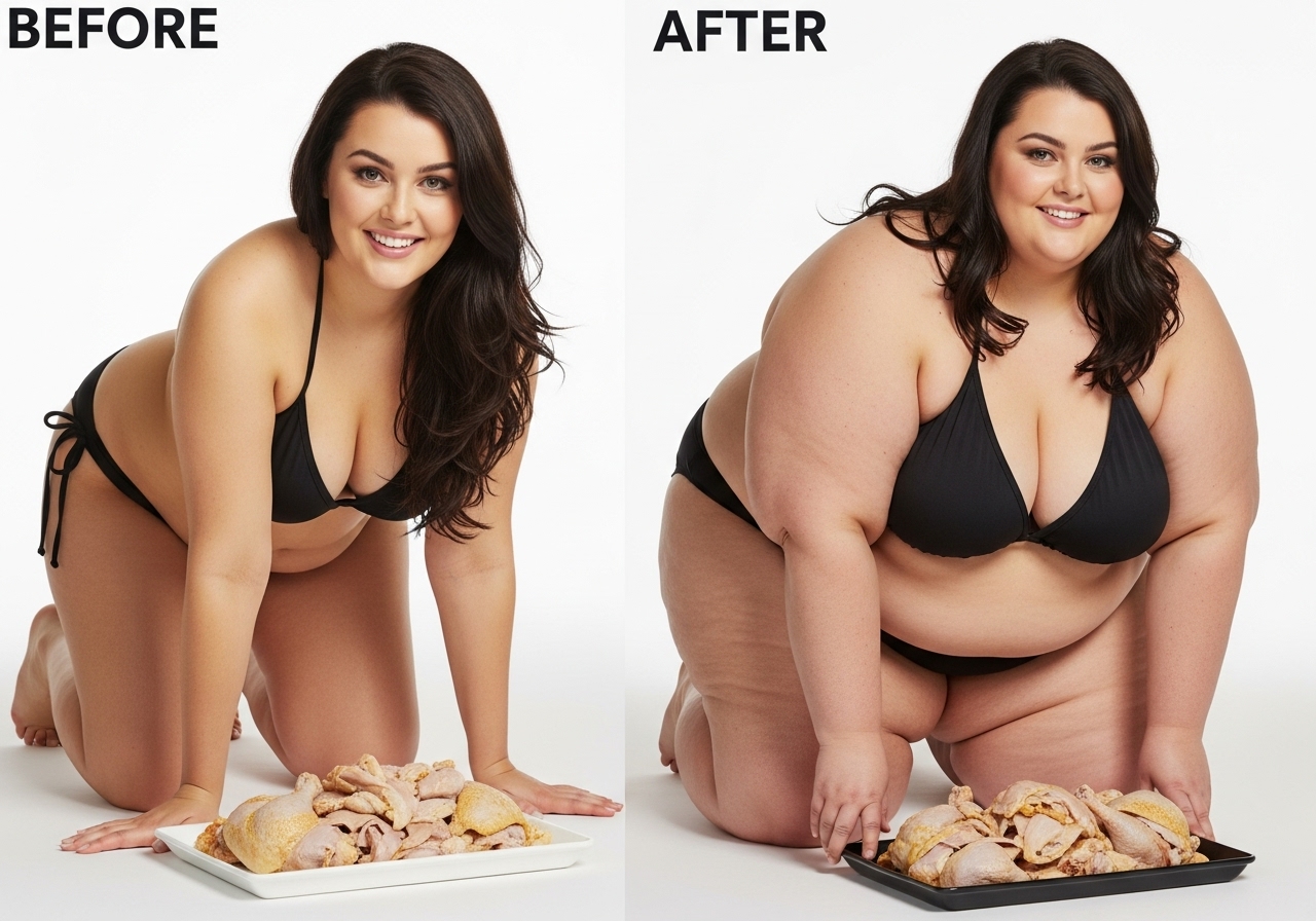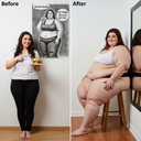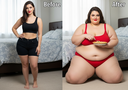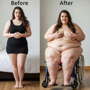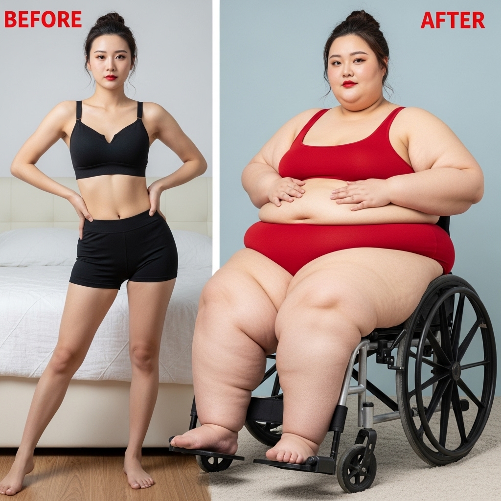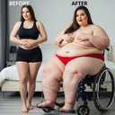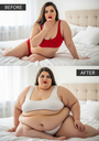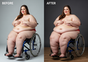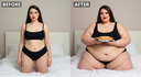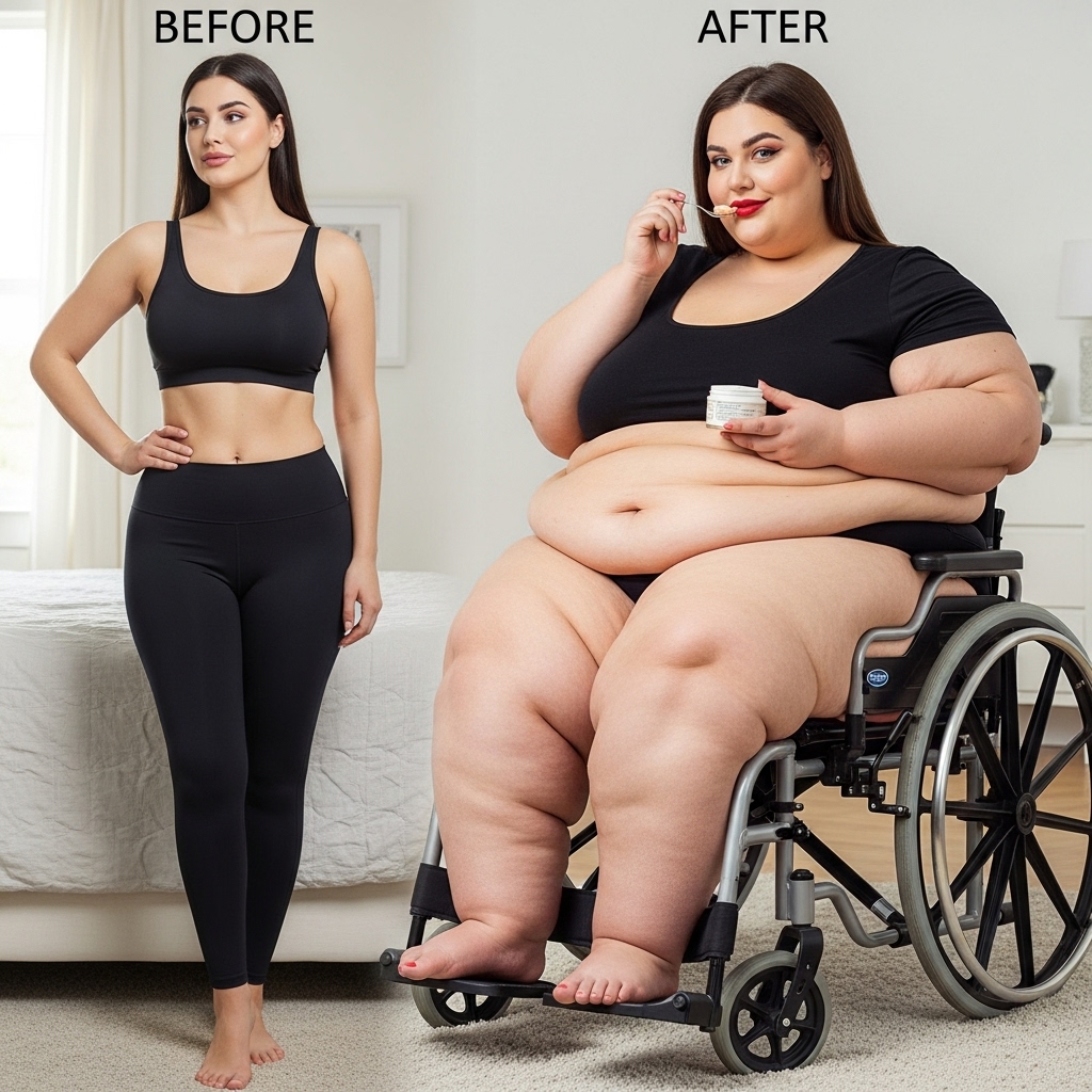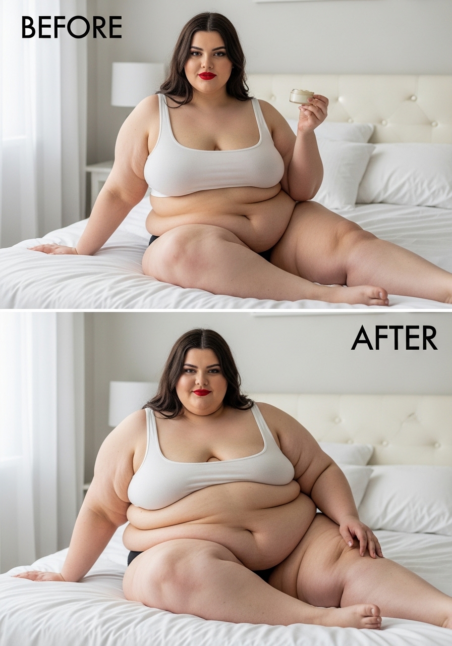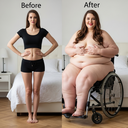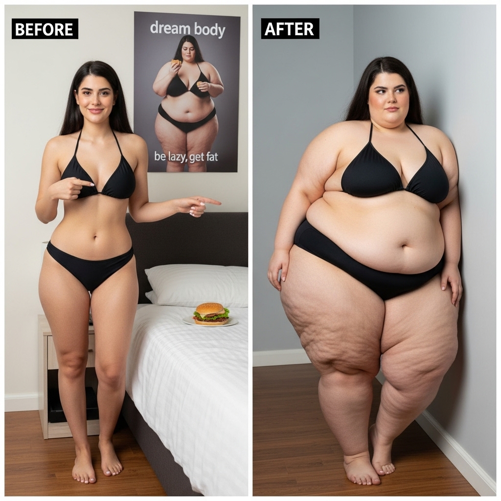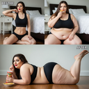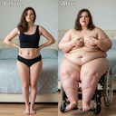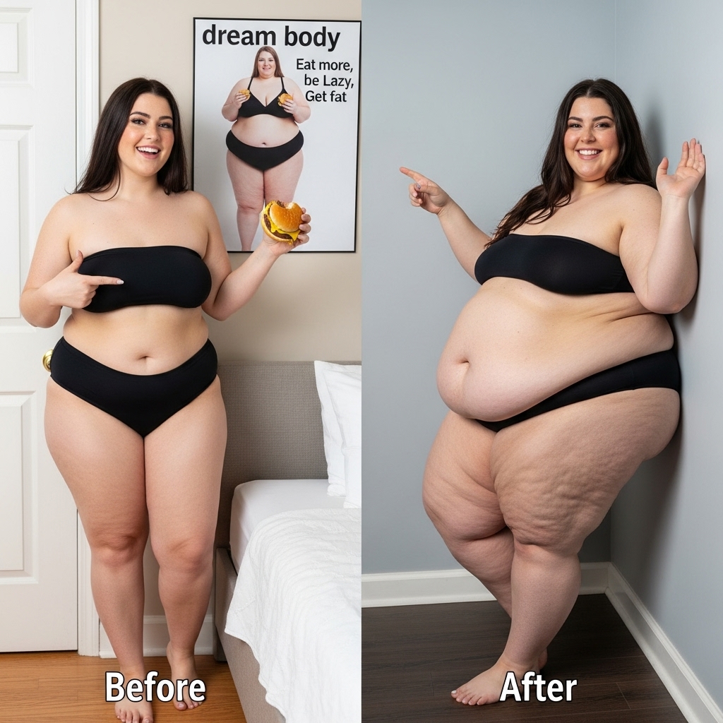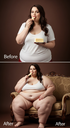 New prompt - works well in all orientations. Before and after of a beautiful long-haired dark brown engliah woman with classic english rose beauty in a bright bedroom that very makes thin people obese and naked. Her hair is in space buns and the same before and after. Before she is slim and very skinny. After she is obese. She is young, in her early twenties and so obese she is a blob, leaning against a wall with a leg in the air, eating a cake. She wears red lipstick and intricate eyeliner and is nakd wearing nothig. She has a chubby face, but the rest of her is very ovese. Her arms are swollen with lymphodemia, covered in heavy cellulite and rolls. Her wrists are swollen and wide with a fat crease between her forearm and hand. Swollen fat hands with inflated large fingers. Her lower half is obese with huge swollen lymphodemic female legs covered in heavy cellulite and rolls. Swollen, wide ankles with a fat rolls across the divide bweteen the calf and foot. Swollen fat feet, with inflated toes.she has an incredibly obese shapeless blob body. She is smirking, and has one swollen foot raised up. young looking, stunning with beautiful makeup and hair. She is incredibly obese with fat spilling everywhere making her blobby. Shes does have a deep double chin hiding her neck. A prominant roll of fat cuts across her swollen forearms and inflated hands. Her swolen ankles are wide and round, with fat covering them as wide as her calves. she has expanded into a gigantically wide mountain of fat spill outward in all directions folding over. Her skin has large stretch marks and blemishes and cellulite all overm damaged by the gain. Her upper arm farm is rolling over her forearms, with multiple rolls and creases at the elbow. Her fupa is out and shaved. Her thighs are marks with cellulite; lard rolling over her knees which are hidden under fat. Her calves are round and large, and are touching one another. Her ankles are round, and split in two by a large fat roll. Her hands and feet are fat, with round plump fingers and toes with fat splaying out. Her feet are obscenely fat.