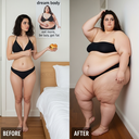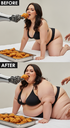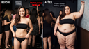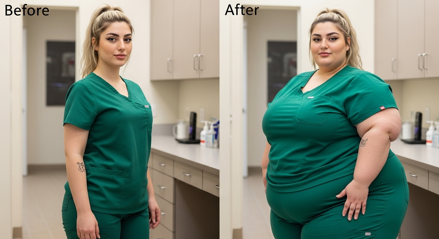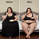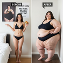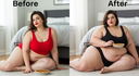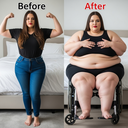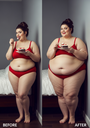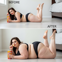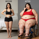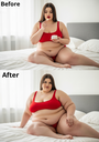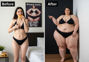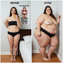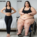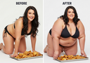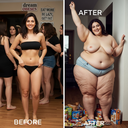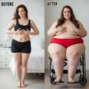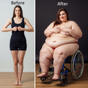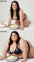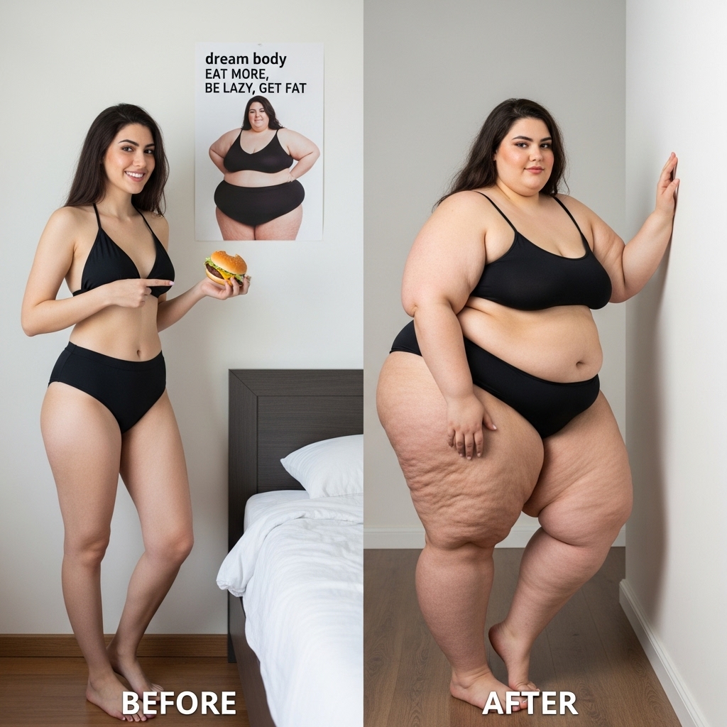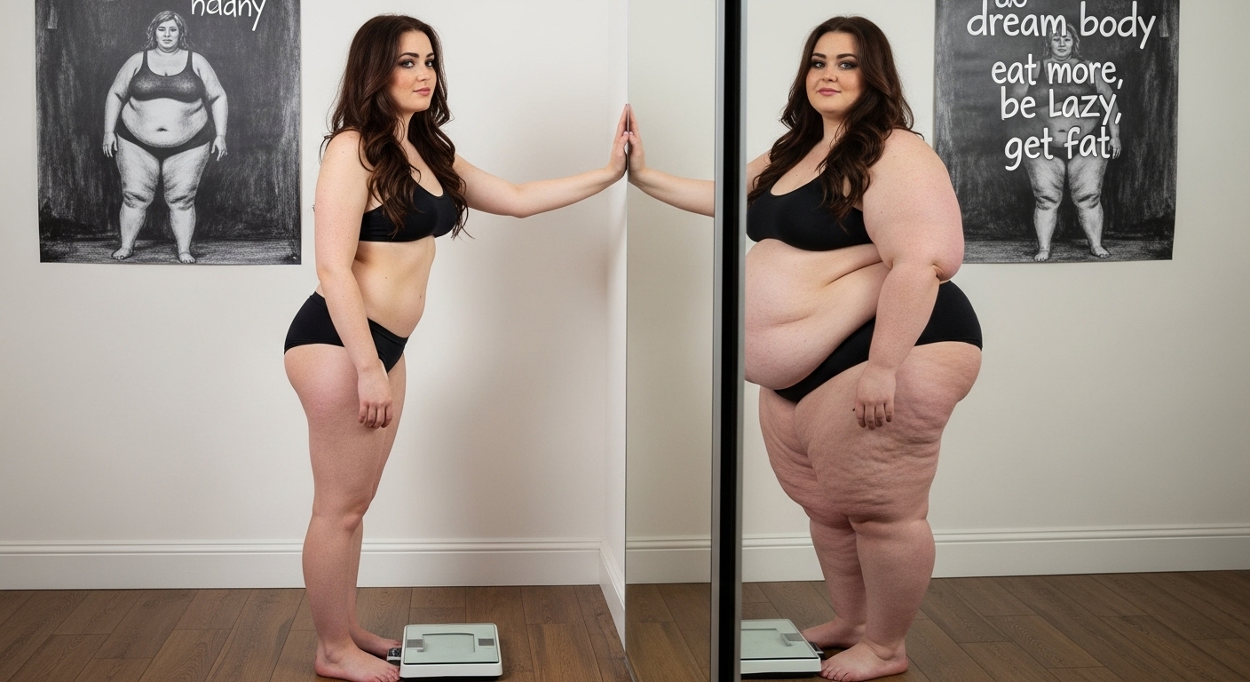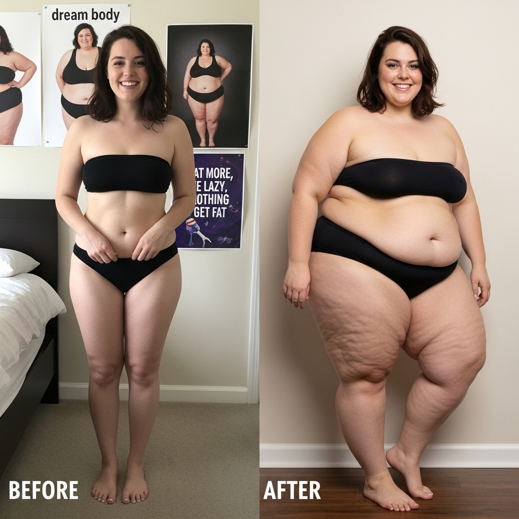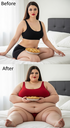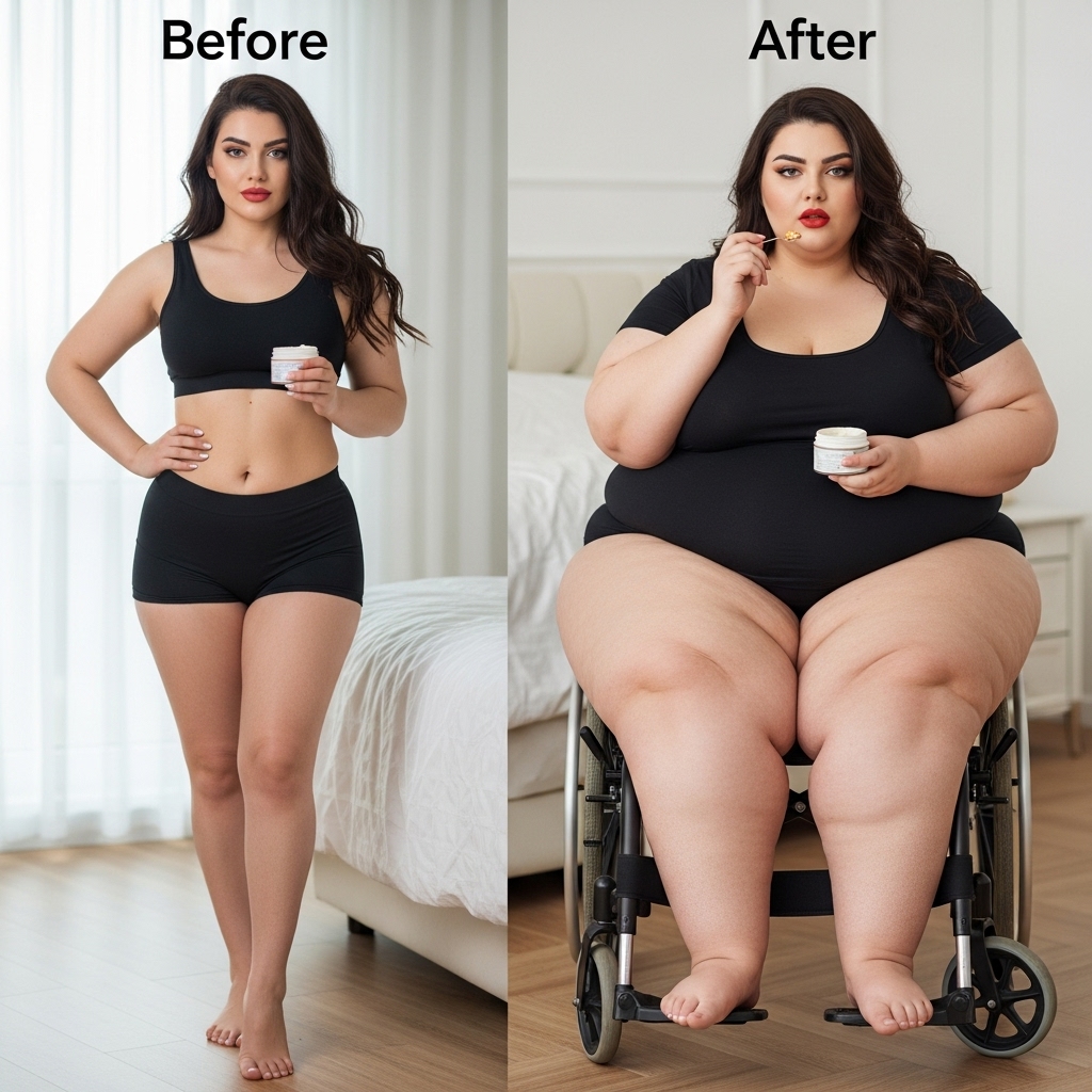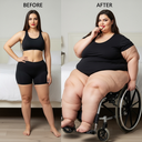 New prompt - works well in all orientations. Before and after of a beautiful long-haired dark brown engliah woman with classic english rose beauty in a bright bedroom that very makes thin people obese and naked. Her hair is in space buns and the same before and after. Before she is slim and very skinny. After she is obese. She is young, in her early twenties and so obese she is a blob, leaning against a wall with a leg in the air, eating a cake. She wears red lipstick and intricate eyeliner and is nakd wearing nothig. She has a chubby face, but the rest of her is very ovese. Her arms are swollen with lymphodemia, covered in heavy cellulite and rolls. Her wrists are swollen and wide with a fat crease between her forearm and hand. Swollen fat hands with inflated large fingers. Her lower half is obese with huge swollen lymphodemic female legs covered in heavy cellulite and rolls. Swollen, wide ankles with a fat rolls across the divide bweteen the calf and foot. Swollen fat feet, with inflated toes.she has an incredibly obese shapeless blob body. She is smirking, and has one swollen foot raised up. young looking, stunning with beautiful makeup and hair. She is incredibly obese with fat spilling everywhere making her blobby. Shes does have a deep double chin hiding her neck. A prominant roll of fat cuts across her swollen forearms and inflated hands. Her swolen ankles are wide and round, with fat covering them as wide as her calves. she has expanded into a gigantically wide mountain of fat spill outward in all directions folding over. Her skin has large stretch marks and blemishes and cellulite all overm damaged by the gain. Her upper arm farm is rolling over her forearms, with multiple rolls and creases at the elbow. Her fupa is out and shaved. Her thighs are marks with cellulite; lard rolling over her knees which are hidden under fat. Her calves are round and large, and are touching one another. Her ankles are round, and split in two by a large fat roll. Her hands and feet are fat, with round plump fingers and toes with fat splaying out. Her feet are obscenely fat.