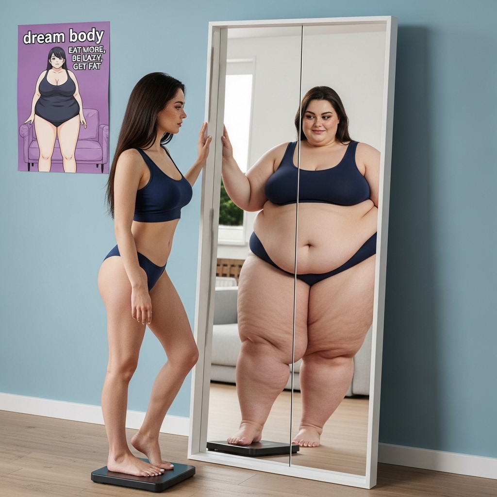 >>36957 4k photo with film grain of a woman looking into a magic huge mirror, which shows people what they're look like if they became extremely fat. The mirror divides exactly down the middle of the room, at a 45 degree angle to us the viewer, and has no border. On the left hand side is her current self, and to the right side, the mirror reflects everything in the room including here, showing her after a huge weight gain. She is a stunning gorgeous uk university nudist model in her early twenties. In both sides of the mirror she mantains same description: She's smiling and happy, has gorgeous chocolate long hair, large dark brown eyes, cute round button nose, freckles, good fake tan, and has small boobs, no makeup apart from lipstick. She leans against a wall, with a scale under her. She touches her hand to the mirror longingly. In the non-reflected side she is thin, wearing nothing (no clothes). A photograph drawn poster of a very obese woman wearing nothing behind her reads "dream body" and "eat more, be lazy, get fat". She looks sad and longing. In the right side, everything in the room is reflected (including the poster, furniture, etc.). She is reflected too - doing the same pose, except in the reflection she is an incredibly obese shapeless blob body, wearing nothing (nudenaked, no clothes). She's looking at herself, smiling happily. She is still happy, young looking, stunning with beautiful makeup and hair. She is incredibly obese with fat spilling everywhere making her blobby. Her face is the same beauty and She has the same hair, except it's significantly fatter. A prominant roll of fat cuts across her swollen forearms and inflated hands. Her swolen ankles are wide and round, with fat covering them as wide as her calves. she has expanded into a gigantically wide mountain of fat spill outward in all directions folding over. Her skin has large stretch marks and blemishes and cellulite all overm damaged by the gain. Her upper arm farm is rolling over her forearms, with multiple rolls and creases at the elbow. Her fupa is out and shaved. Her thighs are marks with cellulite; lard rolling over her knees which are hidden under fat. Her calves are round and large, and are touching one another. Her ankles are round, and split in two by a large fat roll. Her hands and feet are fat, with round plump fingers and toes with fat splaying out. Her feet are obscenely fat. She is impossibly obese, she is rapidly growing fatter, she is beyond the fattest woman in the universe, magic weight gain has caused her to grow to impossible fatness, every limb is extremely fat, humongous legs.