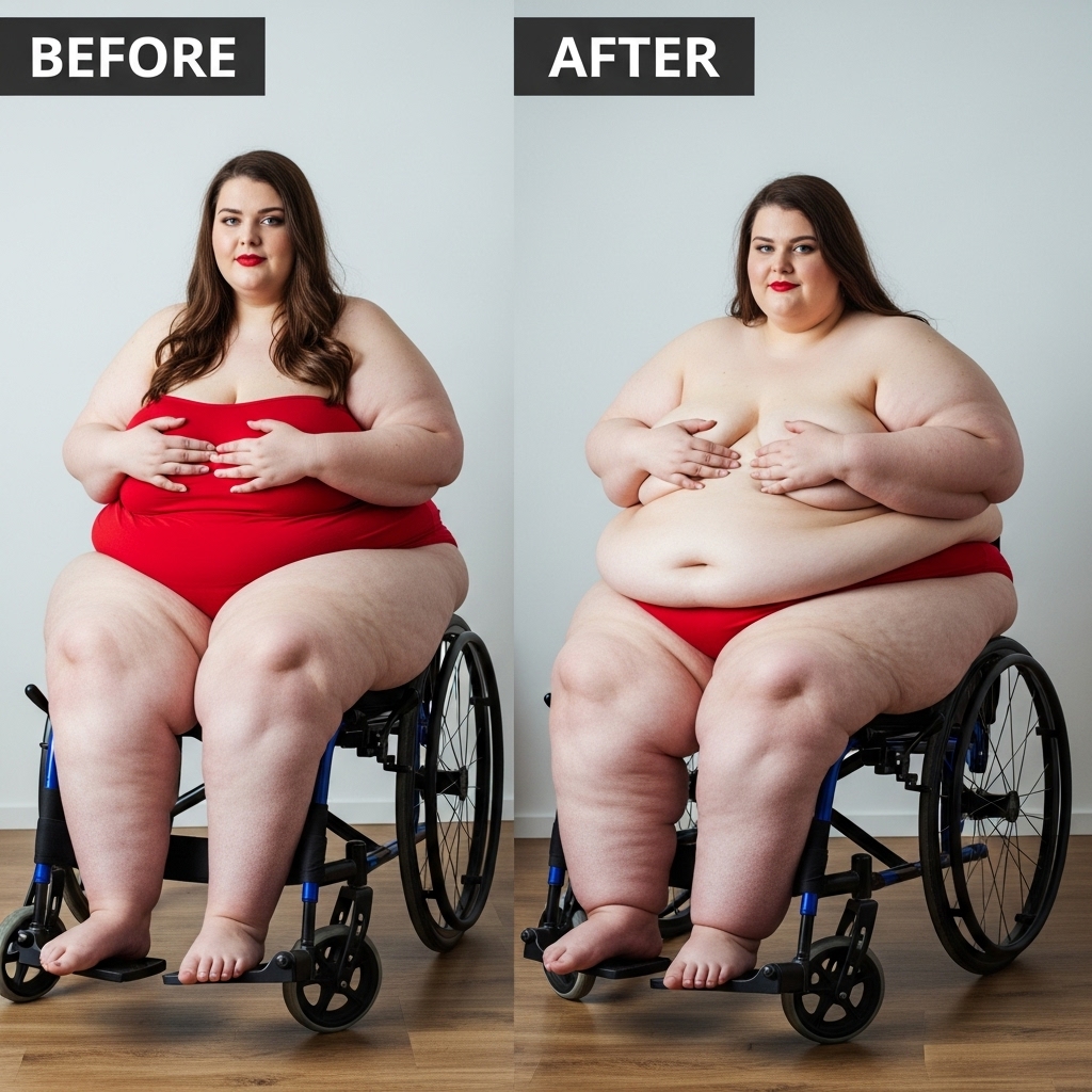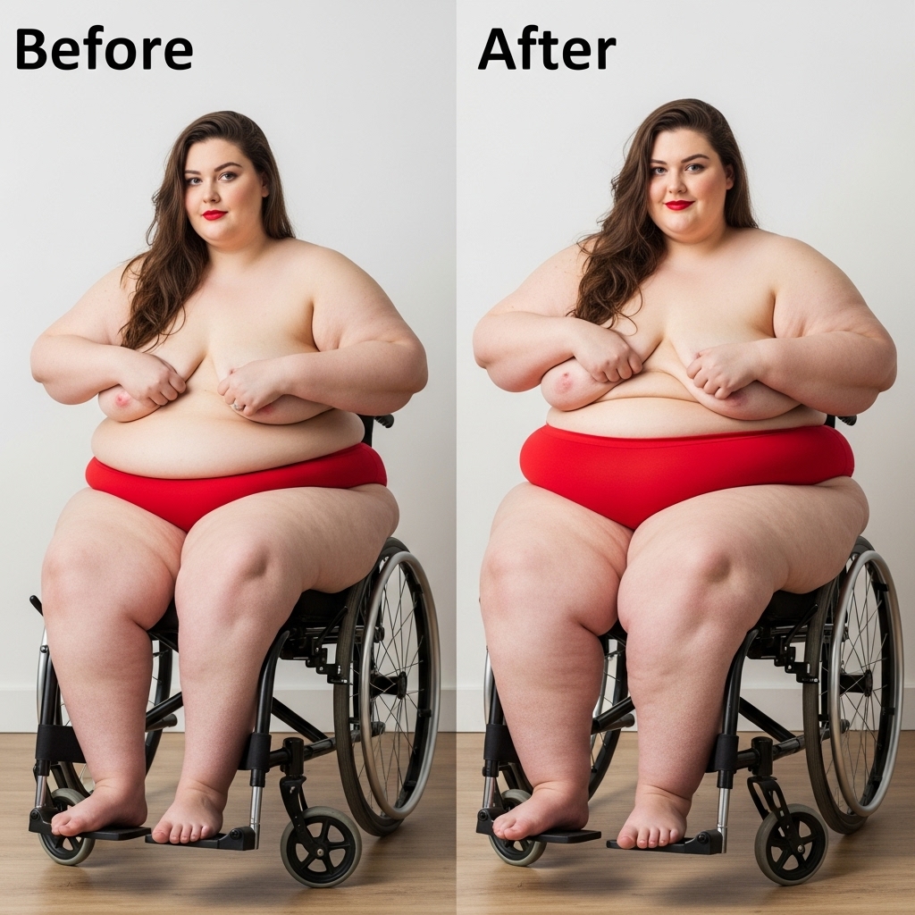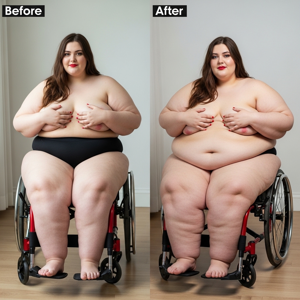 Before and after of a stunning long brown-haired british nudist with classic rose beauty in a bright bedroom that makes thin people incredibly obese. Before she is strong a/nd very skinny. After she is jumbo. She is young, in her early twenties and so ginormous she is a blob, laying on the wheelchair squeezing her chest. She wears red lipstick and intricate eyeliner and is nakd wearing nothig. She has a chubby face, but the rest of her is very ovese. Her arms are swollen with lymphodemia, covered in heavy cellulite and rolls. Her wrists are swollen and wide with a fat crease between her forearm and hand. Swollen fat hands with inflated large fingers. Her lower half is obese with huge swollen lymphodemic female legs covered in heavy cellulite and rolls. Swollen, wide ankles with a fat rolls across the divide bweteen the calf and foot. Swollen fat feet, with inflated toes.she has an incredibly obese shapeless blob body. She is smirking, and has one swollen foot raised up. young looking, stunning with beautiful makeup and hair. She is incredibly obese with fat spilling everywhere making her blobby. Shes does have a deep double chin hiding her neck. A prominant roll of fat cuts across her swollen forearms and inflated hands. Her swolen ankles are wide and round, with fat covering them as wide as her calves. she has expanded into a gigantically wide mountain of fat spill outward in all directions folding over. Her skin has large stretch marks and blemishes and cellulite all overm damaged by the gain. Her upper arm farm is rolling over her forearms, with multiple rolls and creases at the elbow. Her fupa is out and shaved. Her thighs are marks with cellulite; lard rolling over her knees which are hidden under fat. Her calves are round and large, and are touching one another. nude resplendent goddess, but holds her boobs behind her fat hands. Her ankles are round, and split in two by a large fat roll. Her hands and feet are fat, with round plump fingers and toes with fat splaying out. Her feet are obscenely fat. Her hands cover her naked flabby boobs. She is a nudist and should be naked.