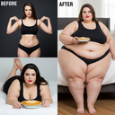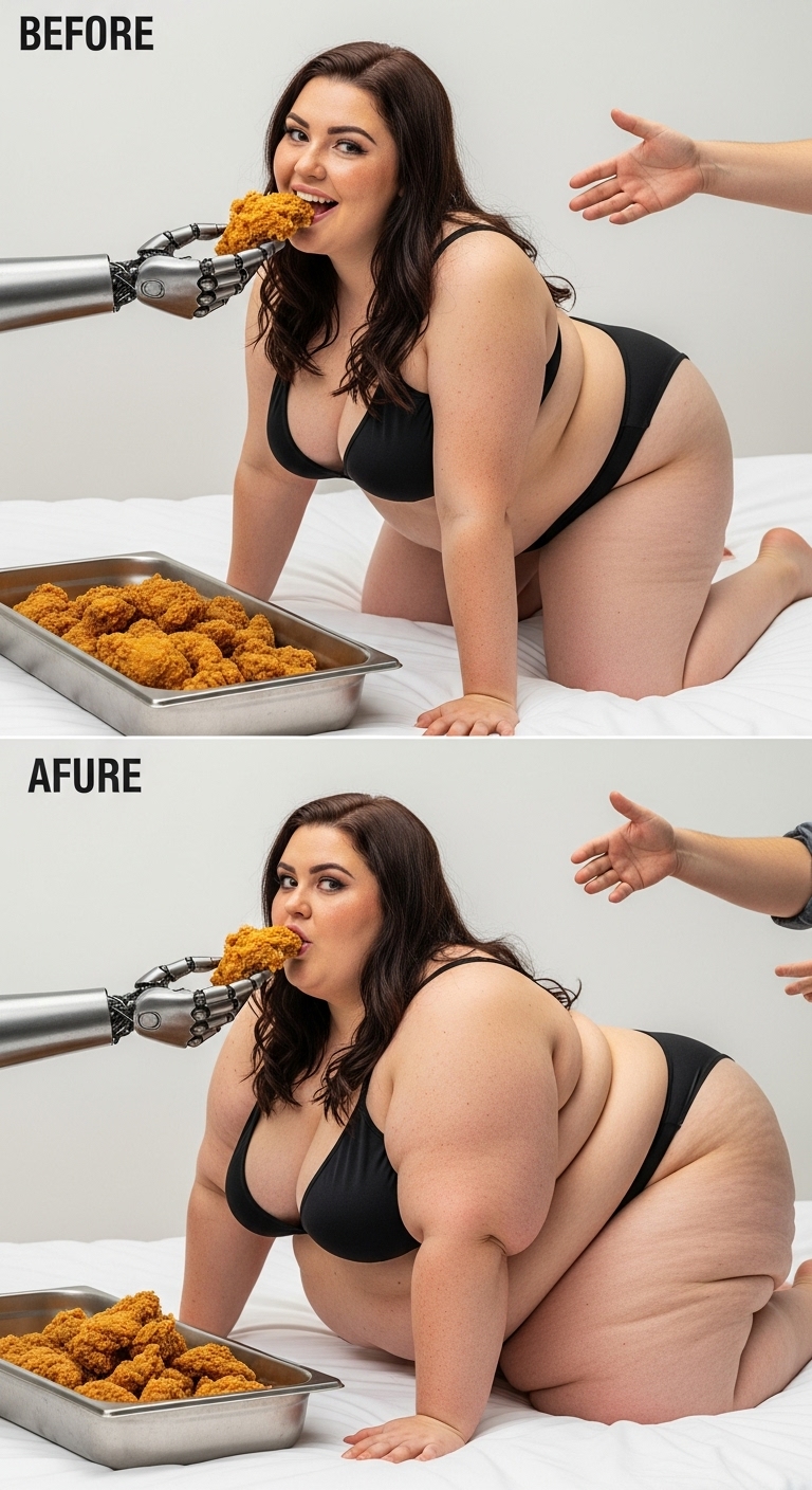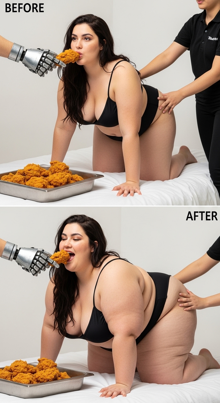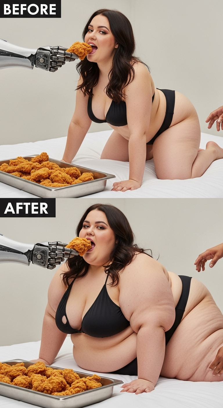 >>36912 This one worked really well in portrait of all things. new show about getting extremely fat. Before after full body photos of huge weight gain in 1 year of brunette amreanian university student in her early twenties. in both pictures she mantains same description: Smiling and happy, stunning long hair, dark brown eyes, cute small nose, freckles, slight fake tan. She is on her hands and knees eating fried chicken from a large deep trough, at a 45 degree angle. She is in a white room with a mechanical hand bringing the chicken up to her mouth, which awaits eagerly. Another mechanical hand is round the rear but we can't see where it's going. In the before picture she is slender, wearing a bikini, and tied to a bed - Her eyes are closed. In the after picture, she's assisted as she can't support her incredibly obese body, in the same small bikini top which has ripped and torn. She is still happy, young looking, stunning with beautiful makeup and hair. She is incredibly obese with fat spilling everywhere. Her face is the same beauty and She has the same hair. she has expanded into a gigantically wide mountain of fat spill outward in all directions folding over. Her skin has large stretch marks. Her upper arm farm is rolling over her forearms, with multiple rolls and creases at the elbow. Her fupa is out and shaved. Her thighs are marks with cellulite; lard rolling over her knees which are hidden under fat. Her calves are round and large, and are touching one another. Her ankles are round, and split in two by a large fat roll. Her hands and feet are fat, with round plump digits. She is impossibly obese, she is rapidly growing fatter, she is beyond the fattest woman in the universe, magic weight gain has caused her to grow to impossible fatness, every limb is extremely fat, humongous legs.