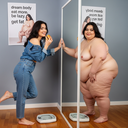 4k photo with film grain of a woman looking into a magic huge mirror, which shows people what they're look like if they became extremely fat. The mirror divides exactly down the middle of the room, at a 45 degree angle to us the viewer, and has no border. On the left hand side is her current self, and to the right side, the mirror reflects everything in the room including here, showing her after a huge weight gain. She is a stunning gorgeous armenian university nudist model in her early twenties. In both sides of the mirror she mantains same description: She's smiling and happy, has gorgeous chocolate long hair, large dark brown eyes, cute round button nose, freckles, good fake tan, and has small boobs, no makeup apart from lipstick. She leans against a wall, with a scale under her. She touches her hand to the mirror longingly. In the non-reflected side she is thin, wearing nothing (no clothes). A photograph drawn poster of a very obese woman wearing nothing behind her reads "dream body" and "eat more, be lazy, get fat". She looks sad and longing. In the right side, everything in the room is reflected (including the poster, furniture, etc.). She is reflected too - doing the same pose, except in the reflection she is an incredibly obese shapeless blob body, wearing nothing (nudenaked, no clothes). She's looking at herself, smiling happily. She is still happy, young looking, stunning with beautiful makeup and hair. She is incredibly obese with fat spilling everywhere making her blobby. Her face is the same beauty and She has the same hair, except it's significantly fatter. A prominant roll of fat cuts across her swollen forearms and inflated hands. Her swolen ankles are wide and round, with fat covering them as wide as her calves. she has expanded into a gigantically wide mountain of fat spill outward in all directions folding over. Her skin has large stretch marks and blemishes and cellulite all overm damaged by the gain. Her upper arm farm is rolling over her forearms, with multiple rolls and creases at the elbow. Her fupa is out and shaved. Her thighs are marks with cellulite; lard rolling over her knees which are hidden under fat. Her calves are round and large, and are touching one another. Her ankles are round, and split in two by a large fat roll. Her hands and feet are fat, with round plump fingers and toes with fat splaying out. Her feet are obscenely fat. She is impossibly obese, she is rapidly growing fatter, she is beyond the fattest woman in the universe, magic weight gain has caused her to grow to impossible fatness, every limb is extremely fat, humongous legs