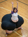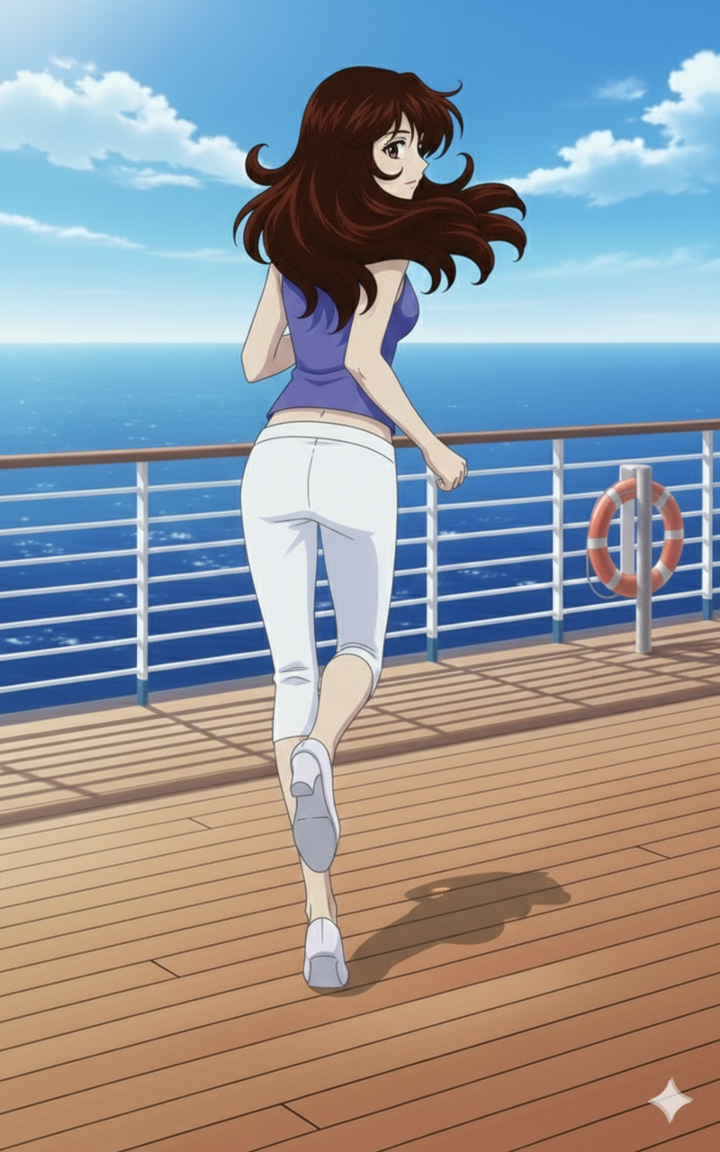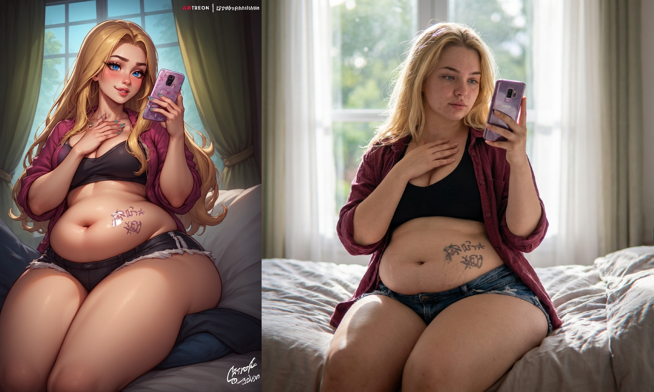 Please turn this image into a highly photorealistic image captured with a professional full-frame DSLR or mirrorless camera, using a prime lens with a wide aperture (e.g., 50mm f/1.4), in natural lighting conditions, changing the cartoon character into a realistic human (a young woman). Preserve the exact same anatomy, pose, and composition exactly.