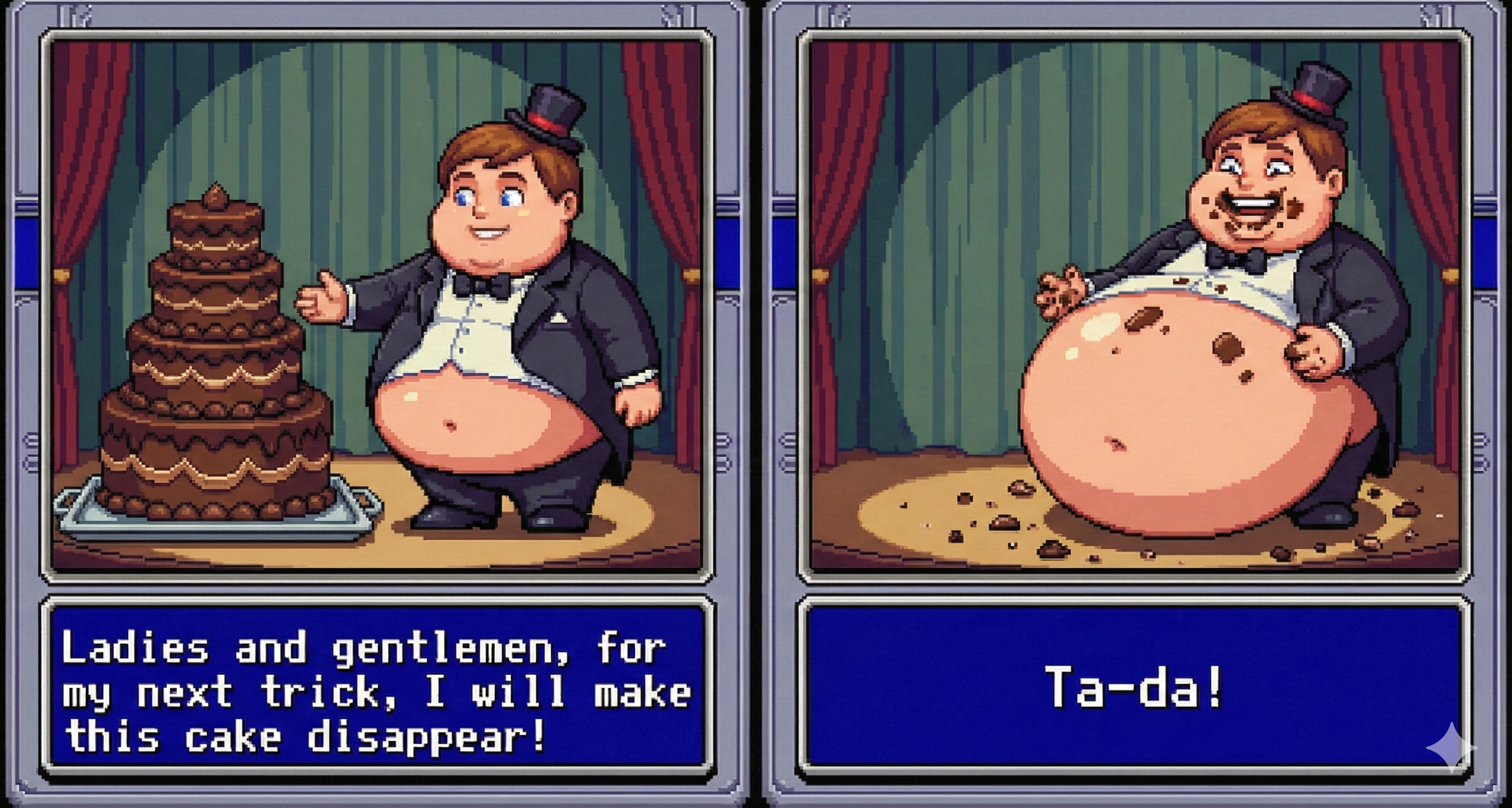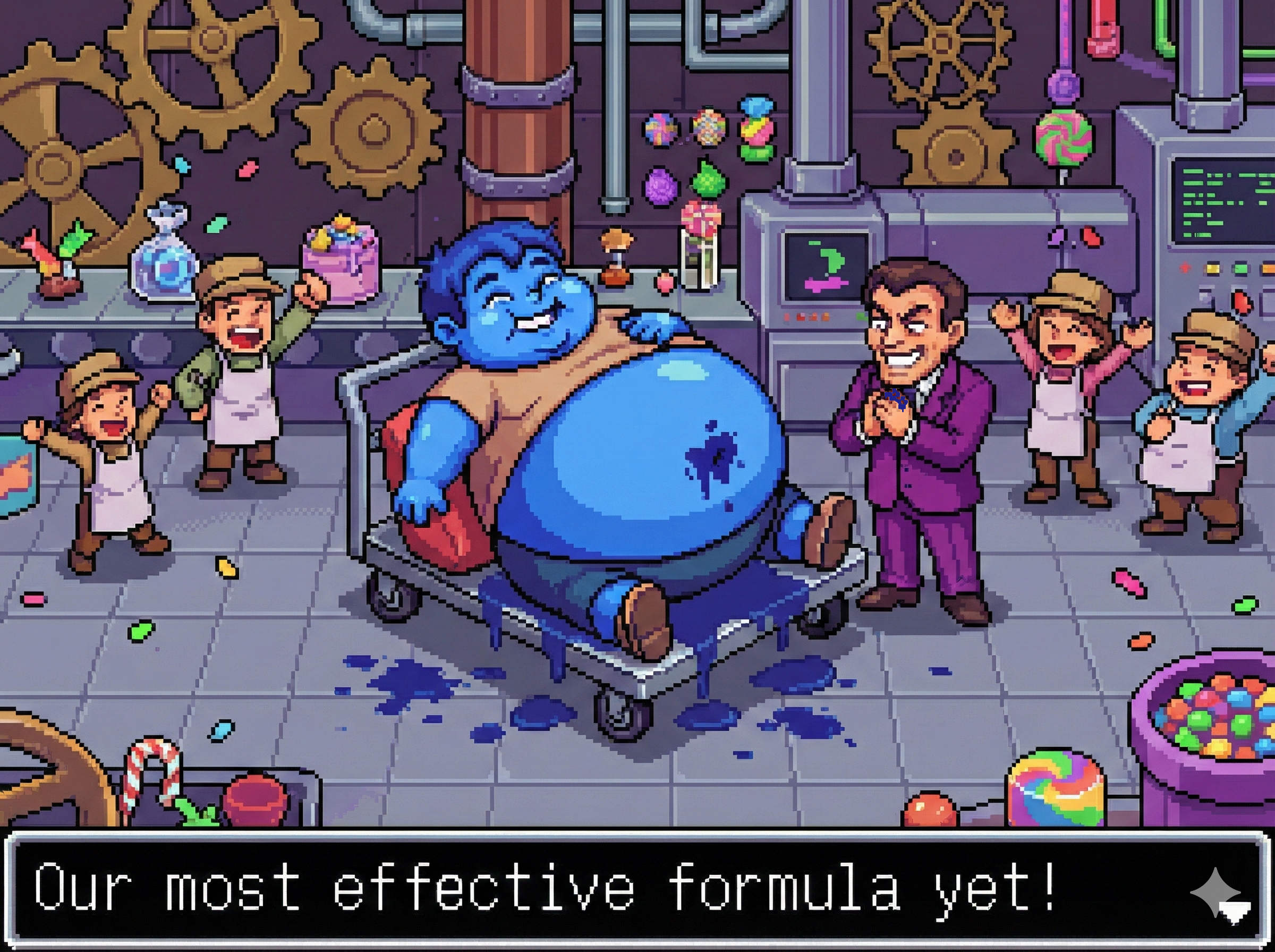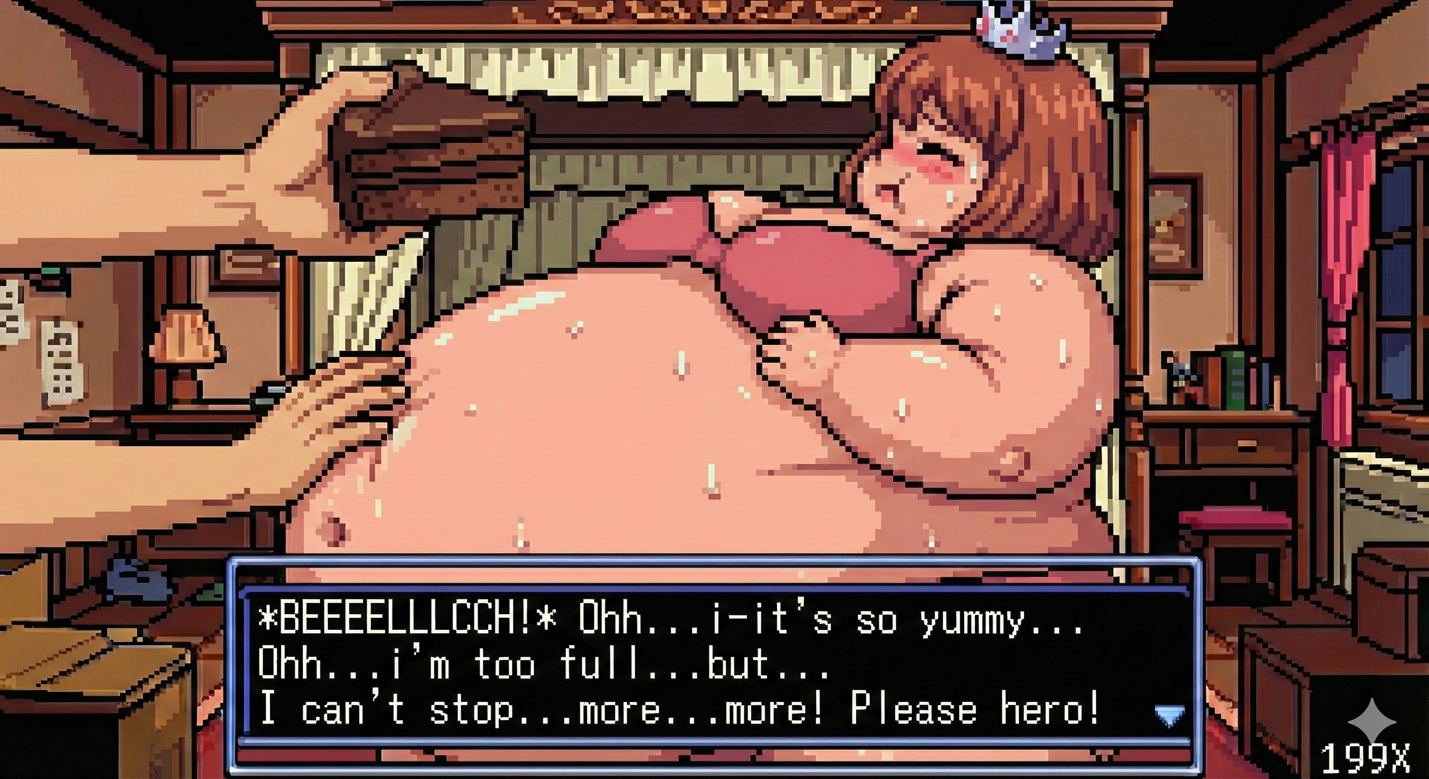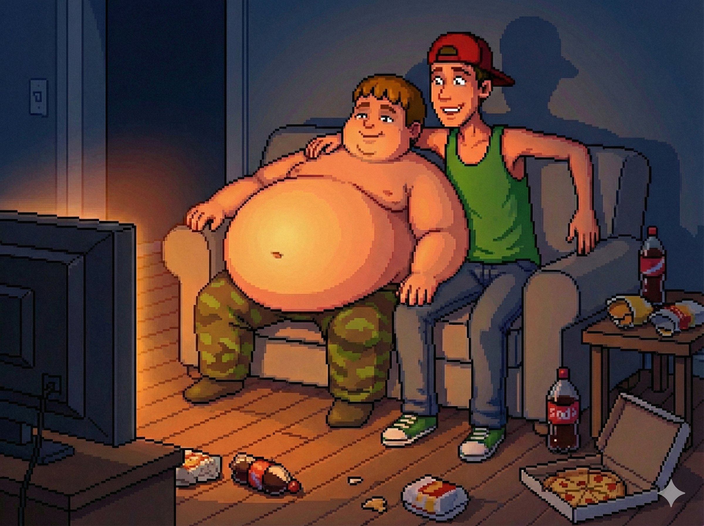 To get good results from Gemini I find it's best to ask with a fairly innocent prompt and then refine it by saying "make the character's belly bigger, give them an embarrassed expression, etc." If you just outright ask for something fetishy you'll get denied most of the time. The downside to this approach is that every time the image is changed, it seems like the quality takes a hit. If you do a dozen plus edits to get where you want to be, the image starts having noticeable artifacts, even when you download the full resolution PNGs. Disappointing for sure, but I still had a lot of fun making these.