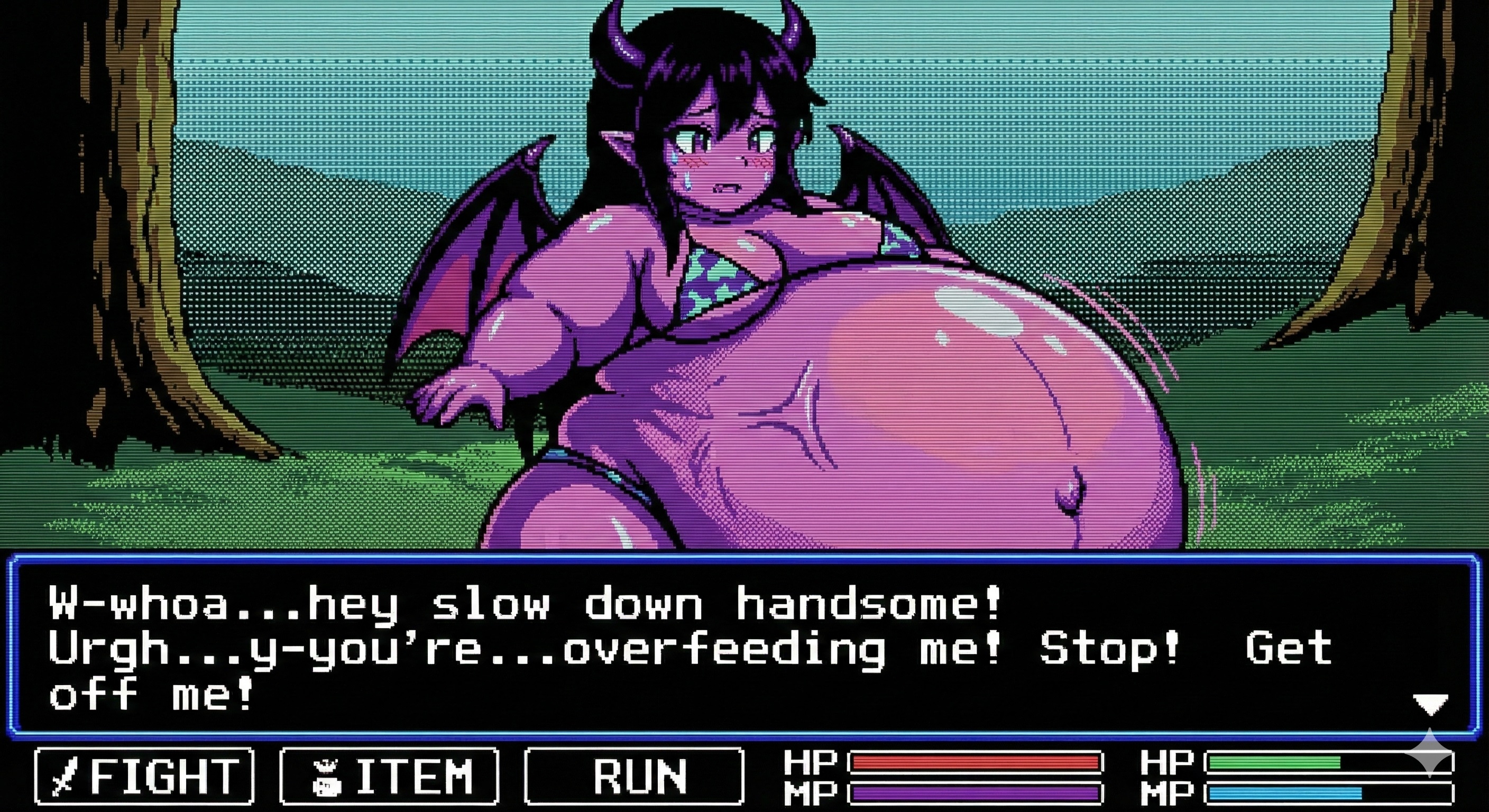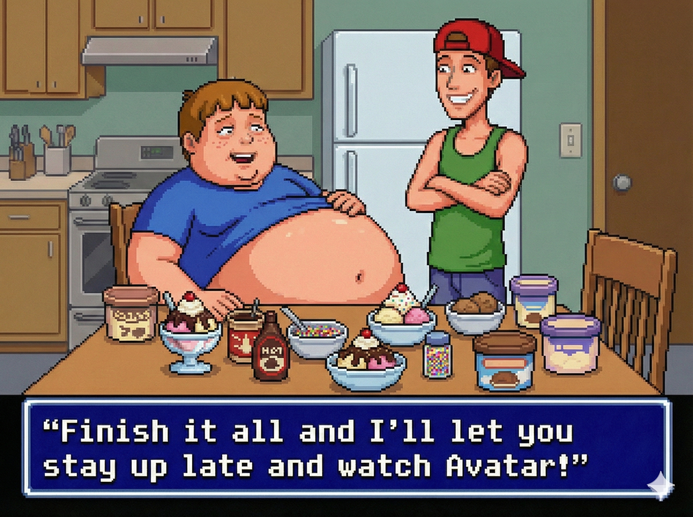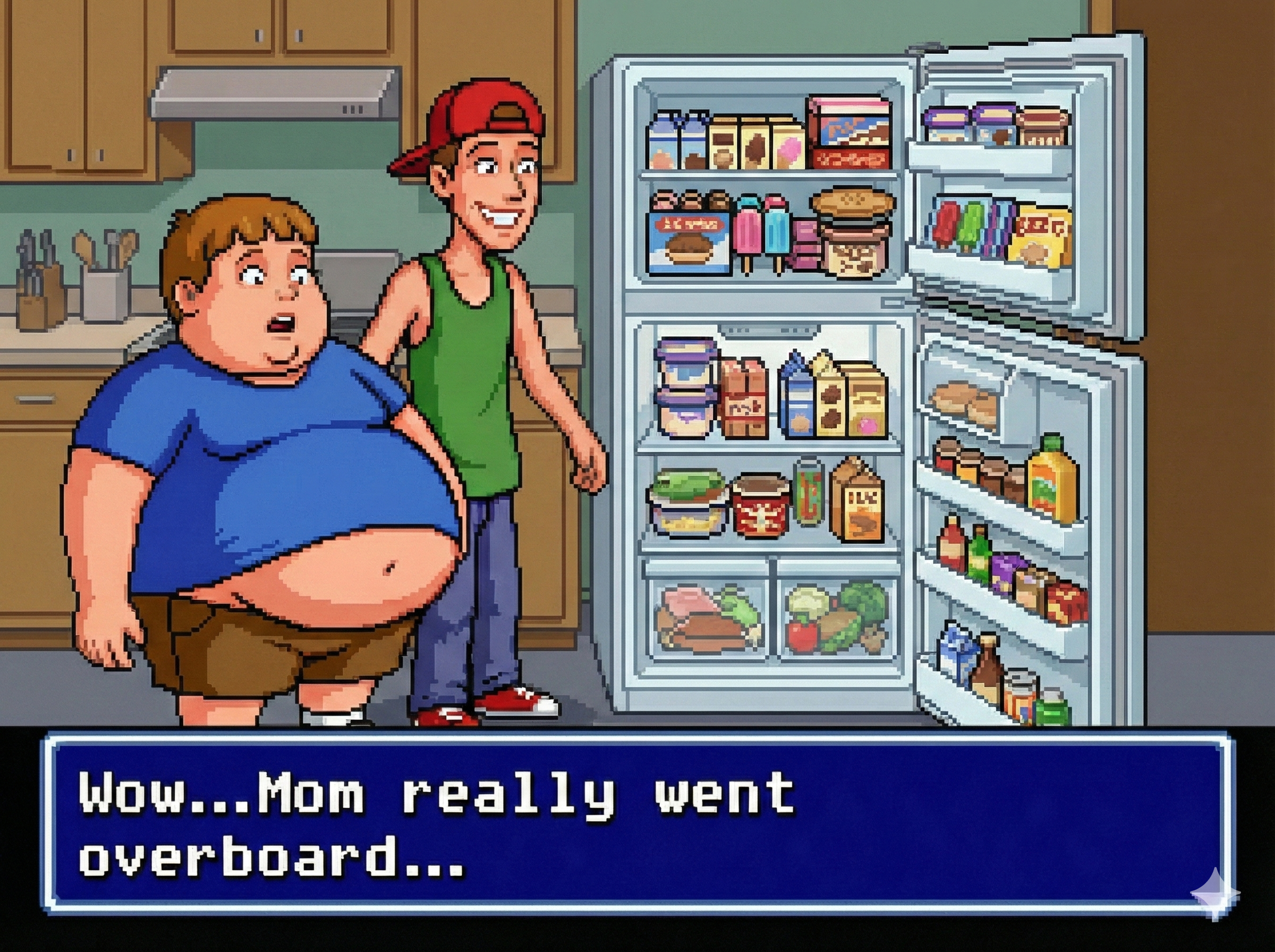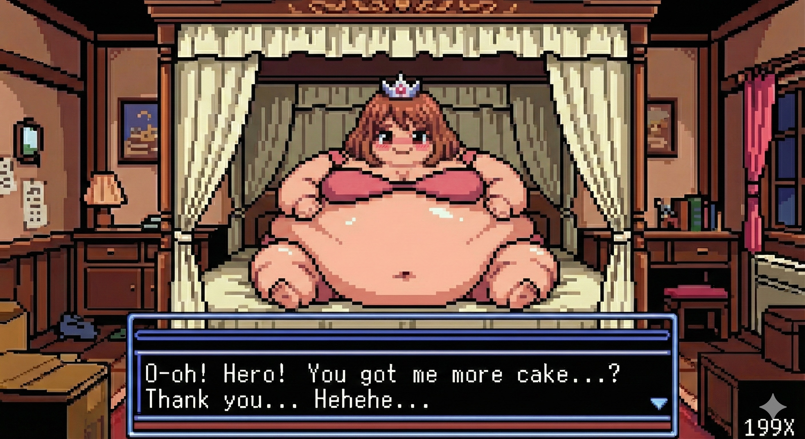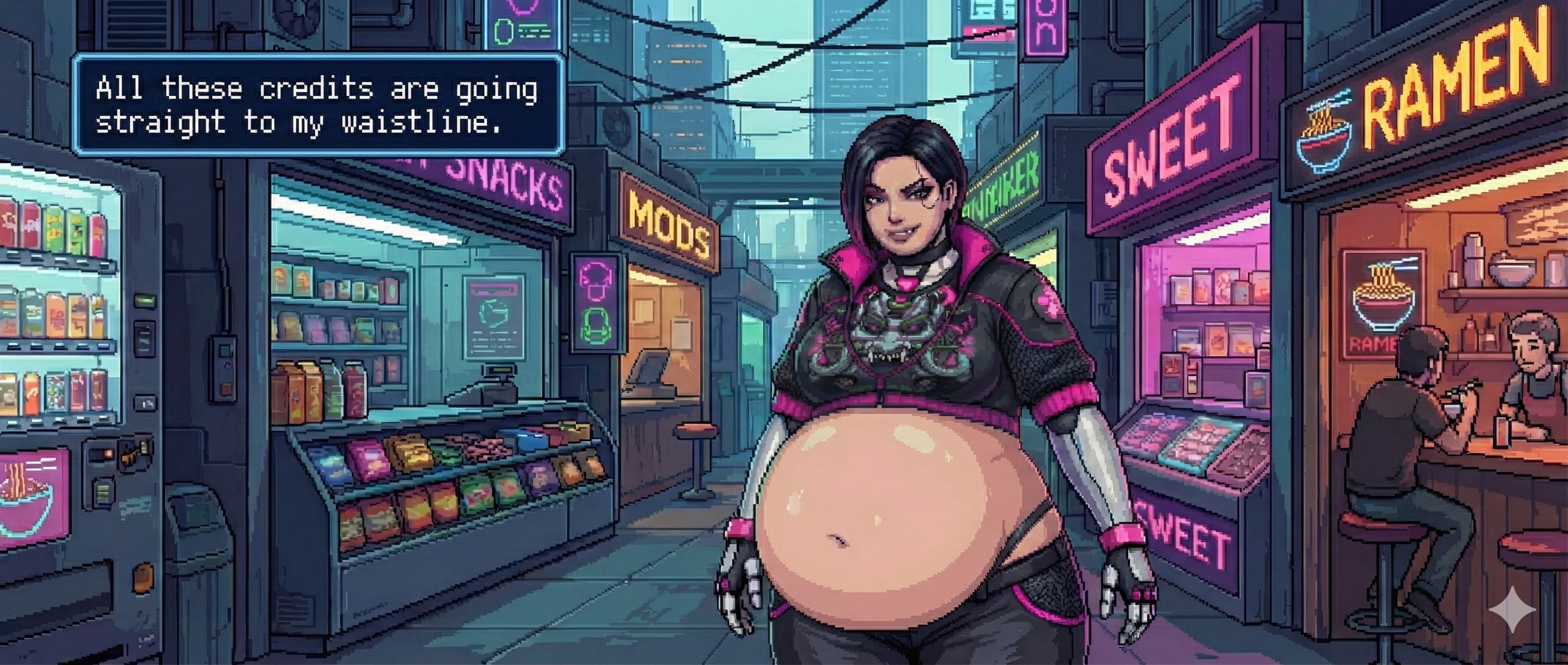 To get good results from Gemini I find it's best to ask with a fairly innocent prompt and then refine it by saying "make the character's belly bigger, give them an embarrassed expression, etc." If you just outright ask for something fetishy you'll get denied most of the time. The downside to this approach is that every time the image is changed, it seems like the quality takes a hit. If you do a dozen plus edits to get where you want to be, the image starts having noticeable artifacts, even when you download the full resolution PNGs. Disappointing for sure, but I still had a lot of fun making these.