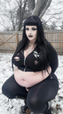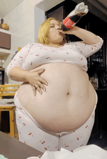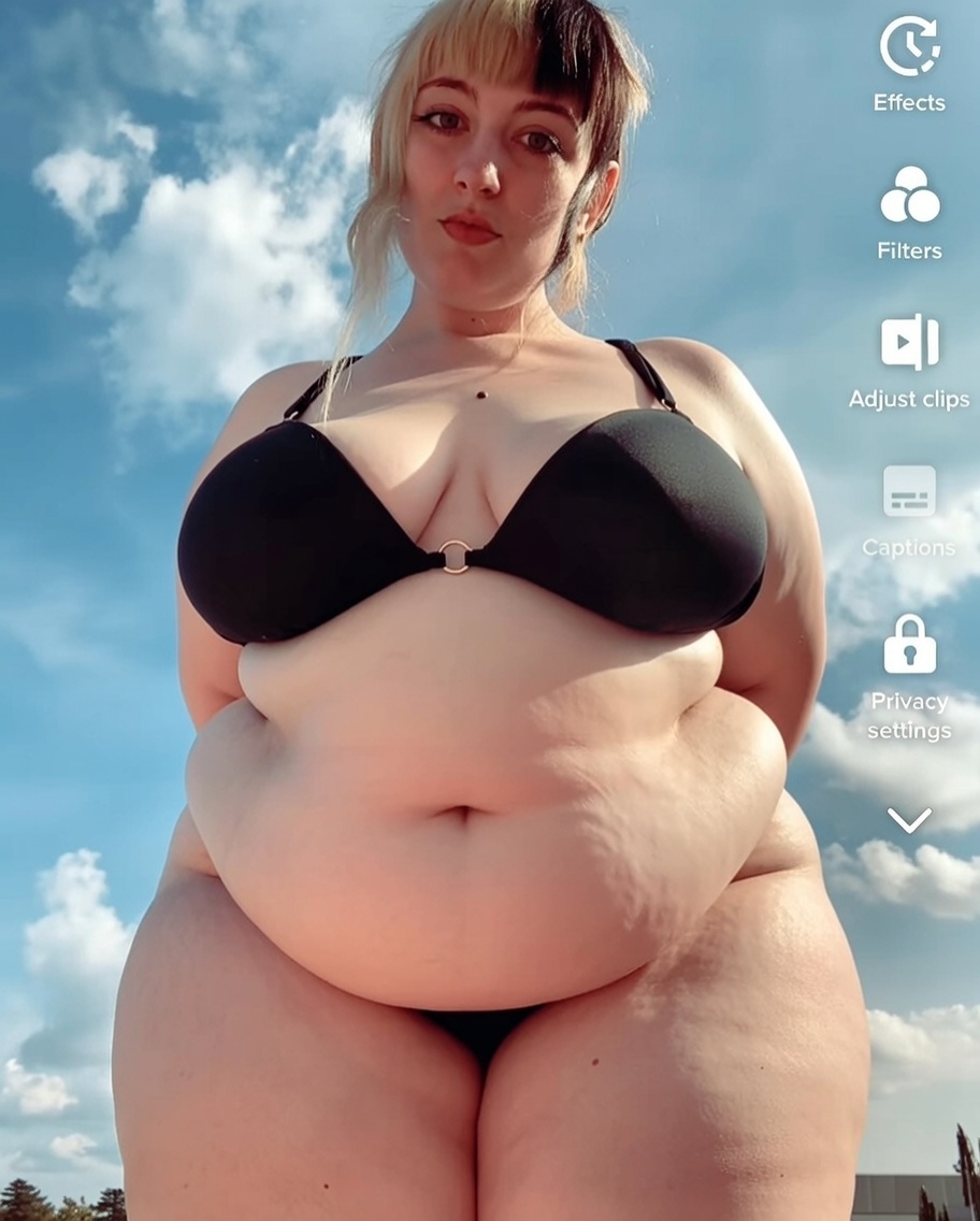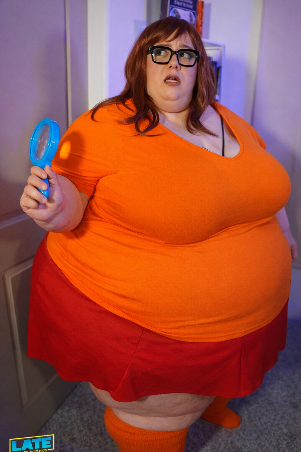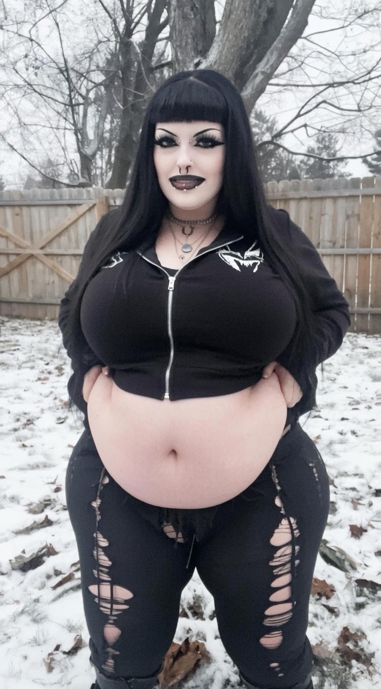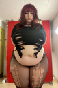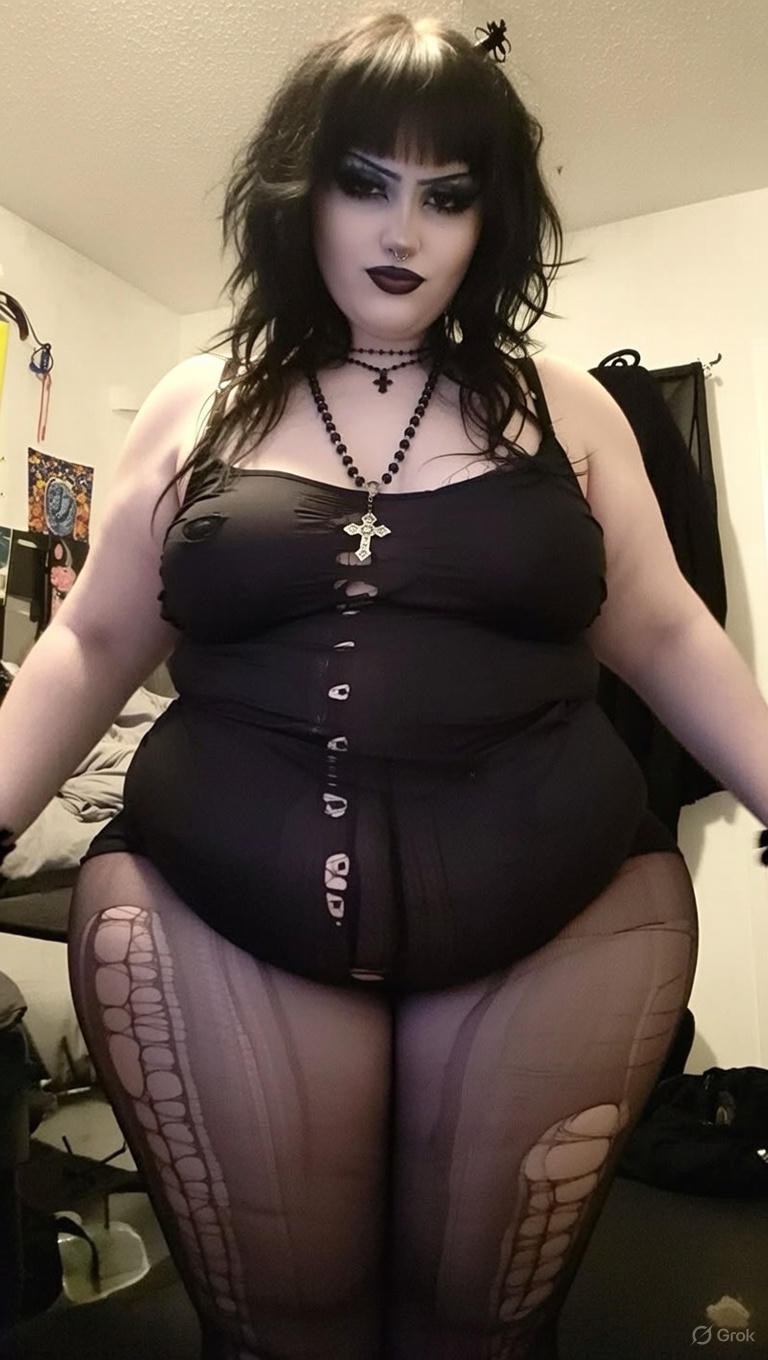 make her noticeably 500lbs fatter, give her an hourglass figure with large, smooth hips and thighs, and large soft tits. make her belly smooth, round, soft, and hanging. make her outfit too tight for her and ripped from strain. put her in ripped transparent black tights. give her a distressed, confused, exasperated, and slightly horny expression on her face.