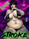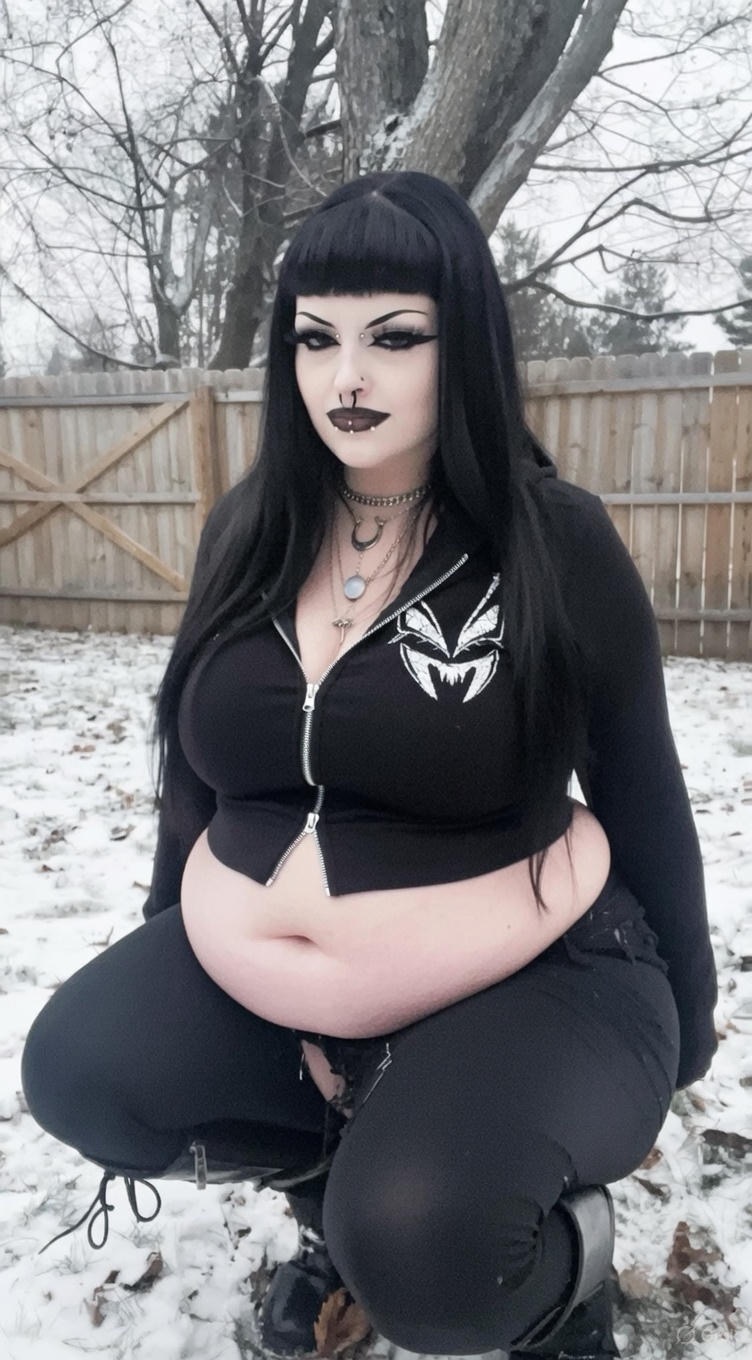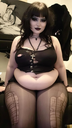 make her noticeably 500lbs fatter, give her an hourglass figure with large, smooth hips and thighs, and large soft tits. make her belly smooth, round, soft, and hanging. make her outfit too tight for her and ripped from strain. put her in ripped transparent black tights. give her a distressed, confused, exasperated, and slightly horny expression on her face. bursting out of corset.