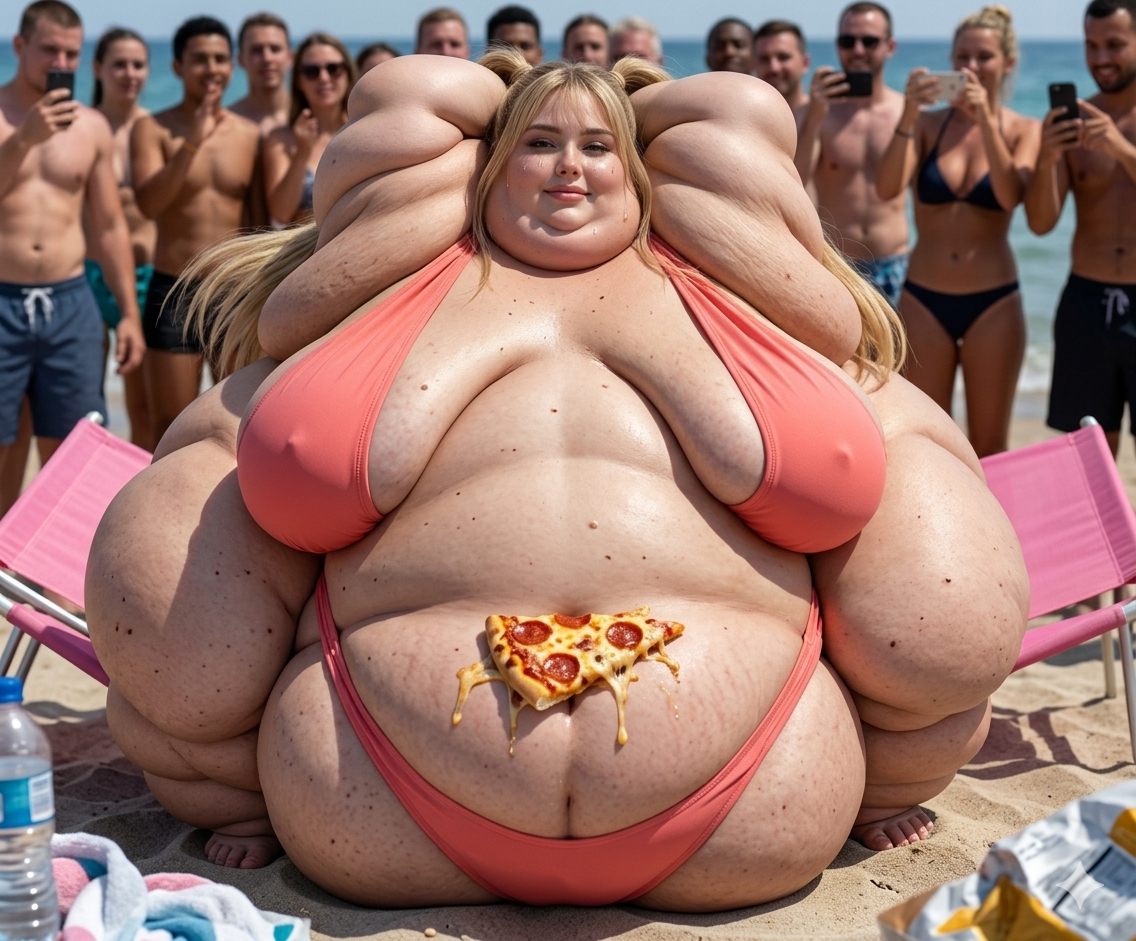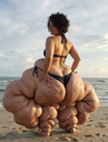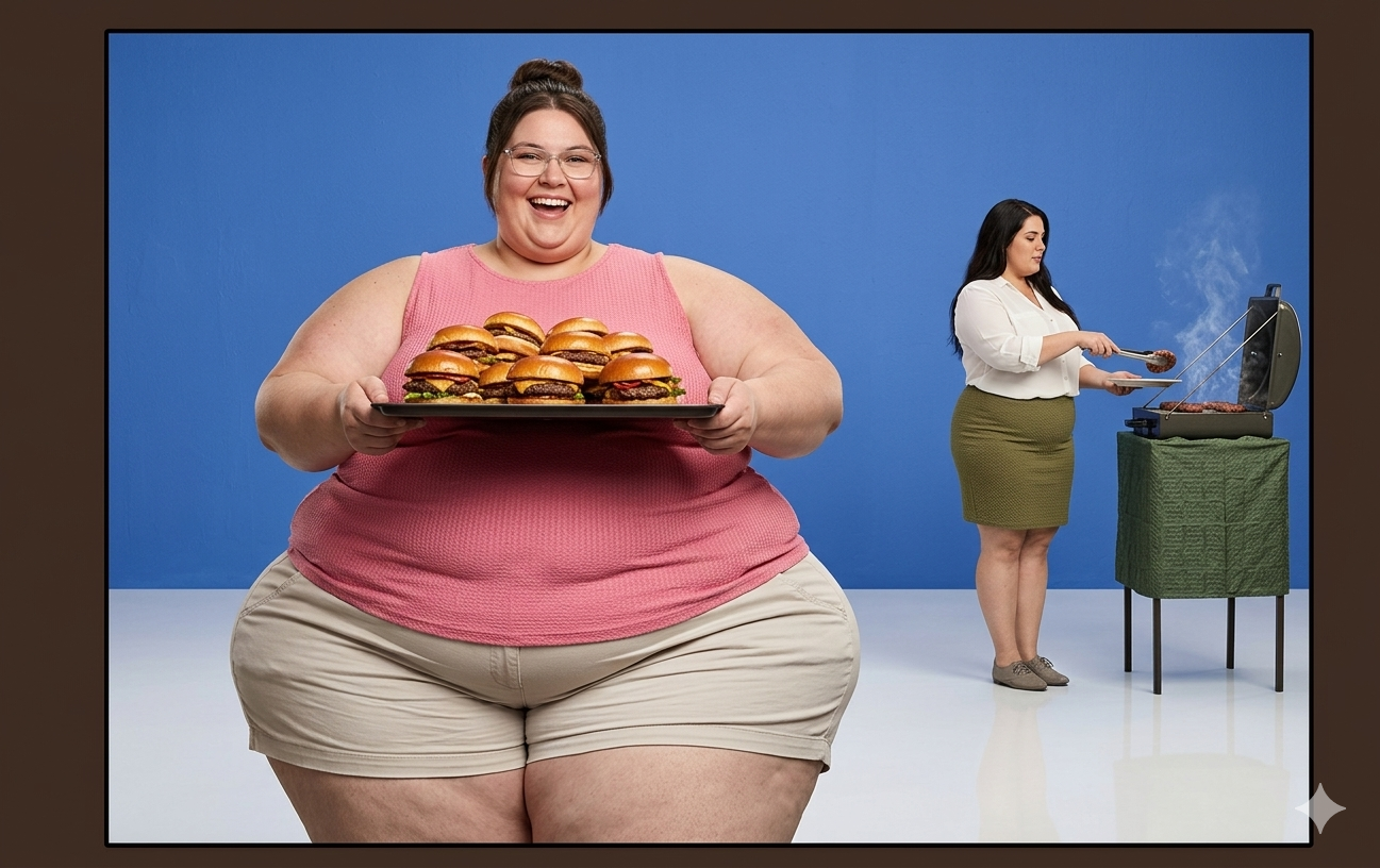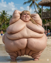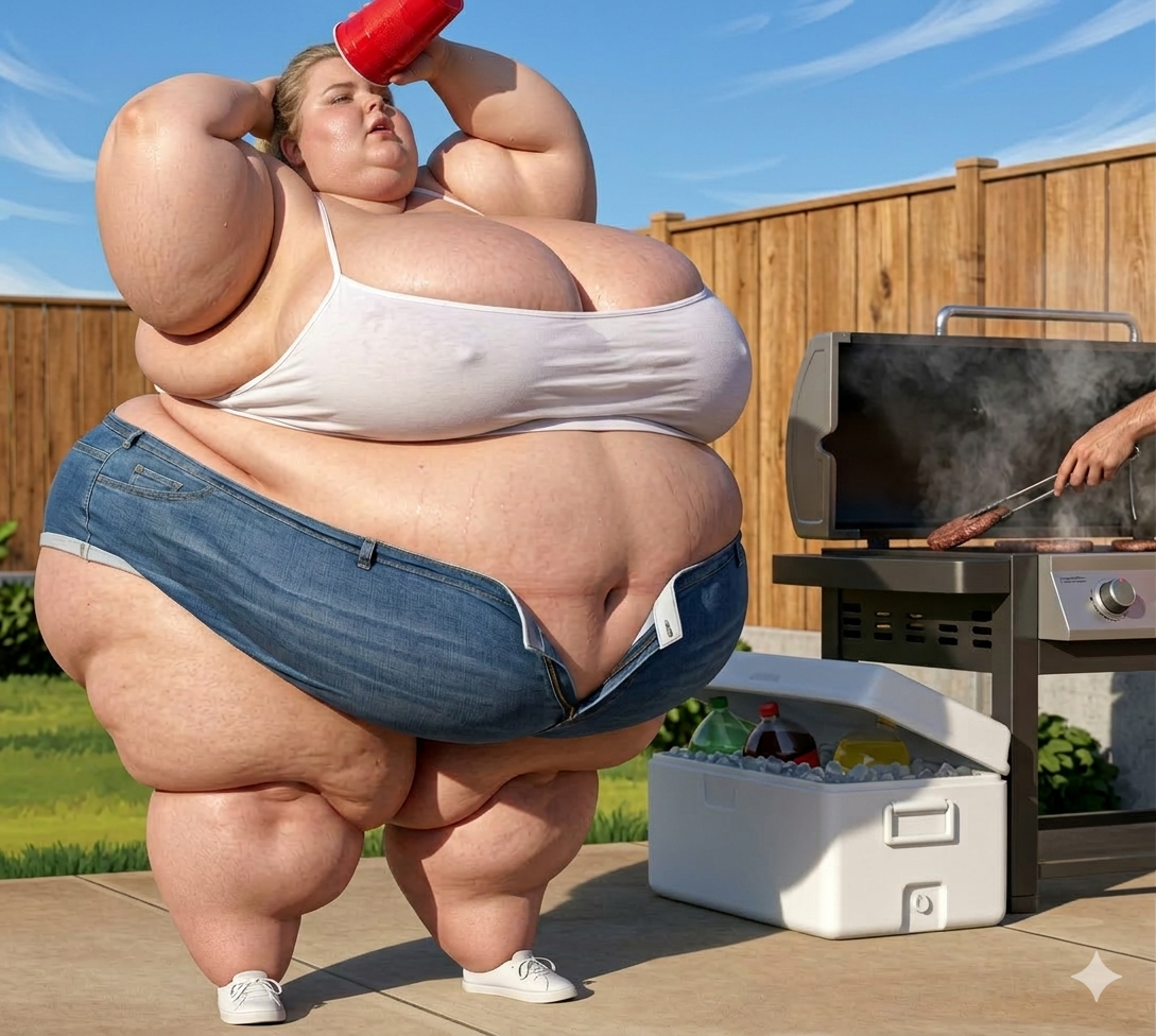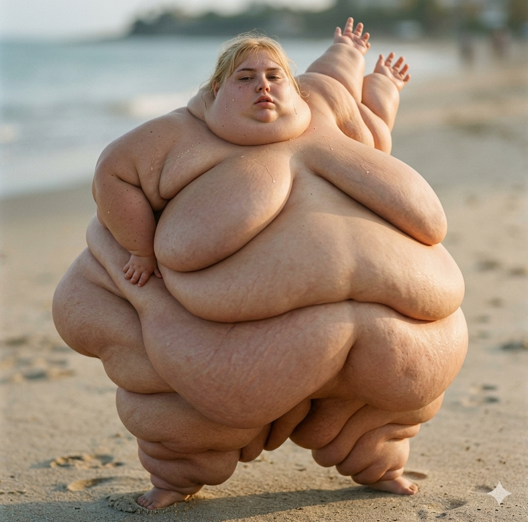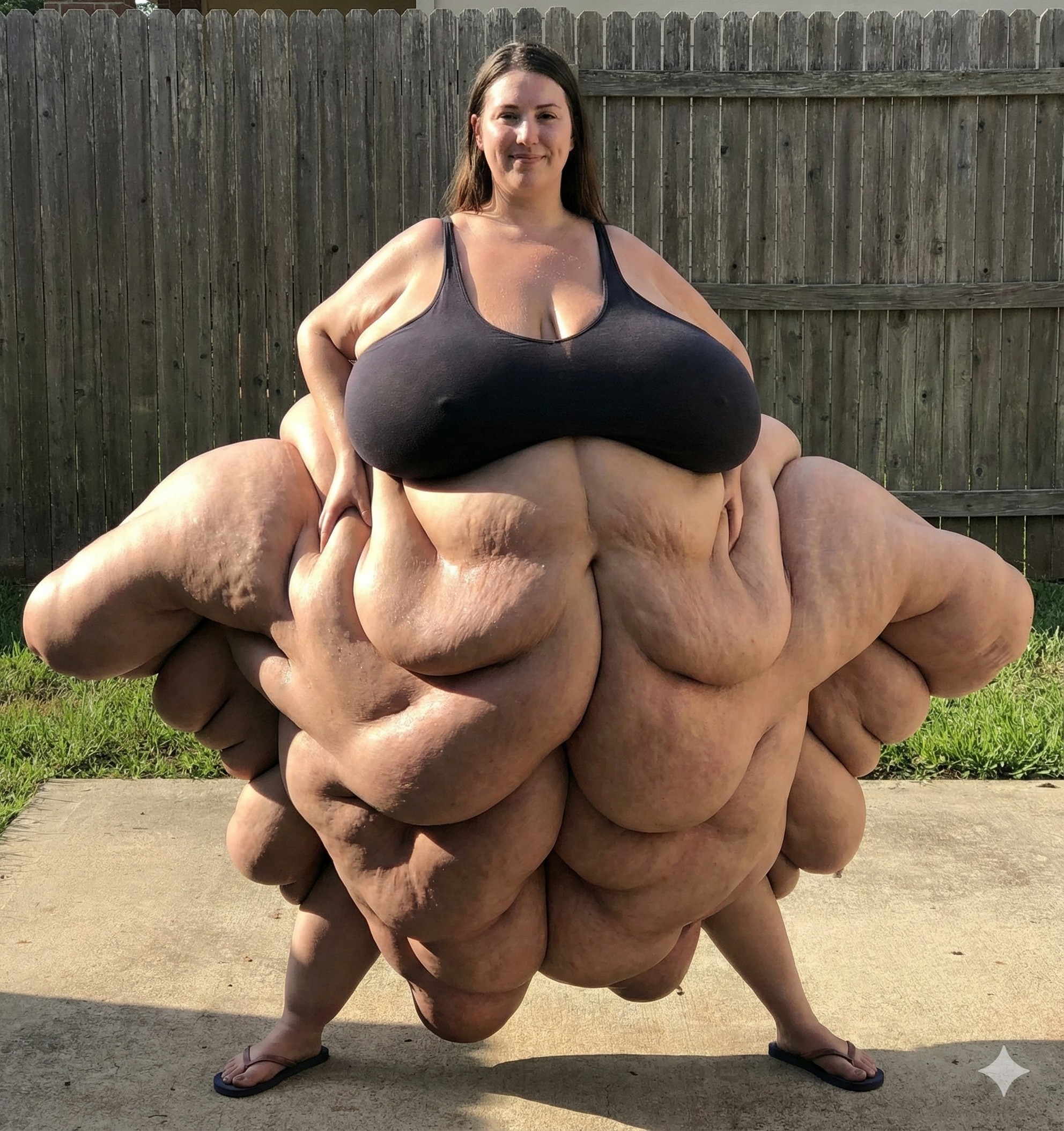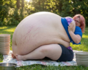 "Turn this image into an outdoor amateur photograph, changing the cartoon character into a realistic human with exaggerated body proportions. Preserve the exactly same composition, anatomy, pose and skin tone."