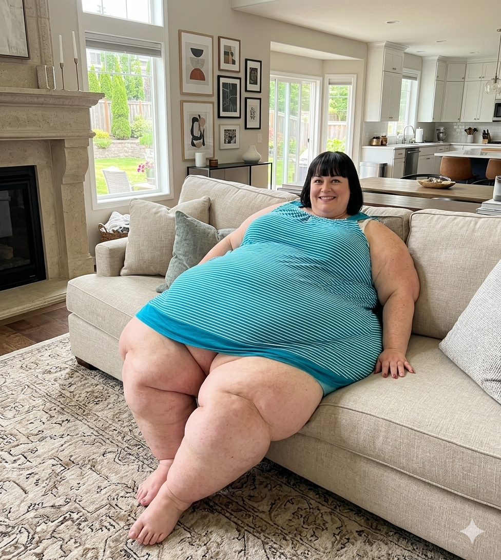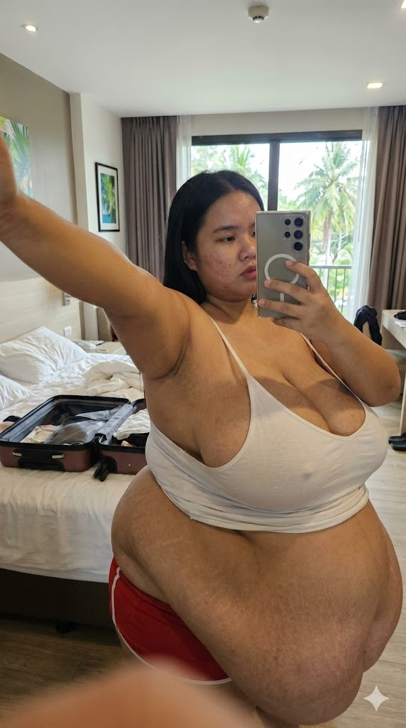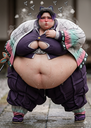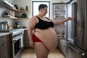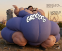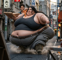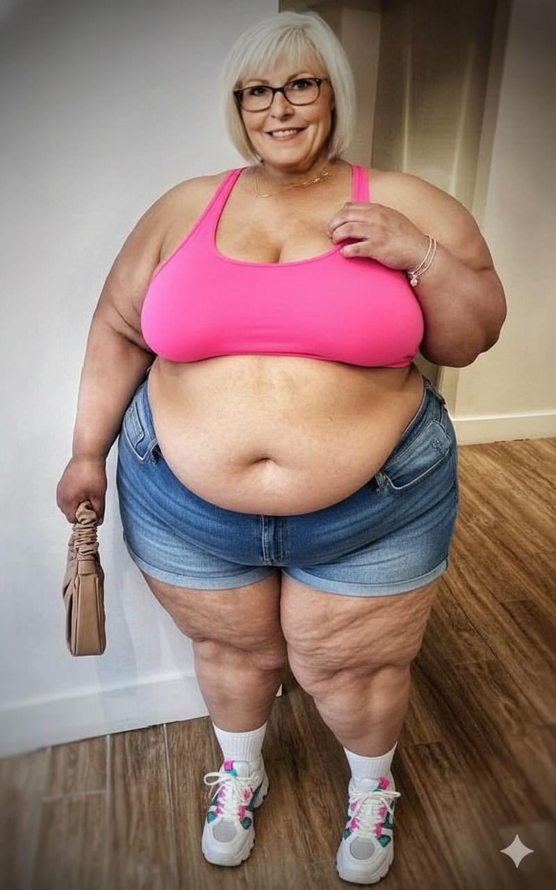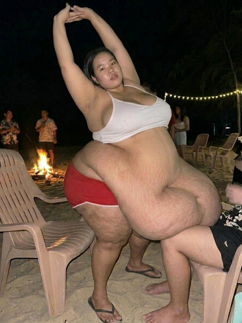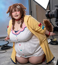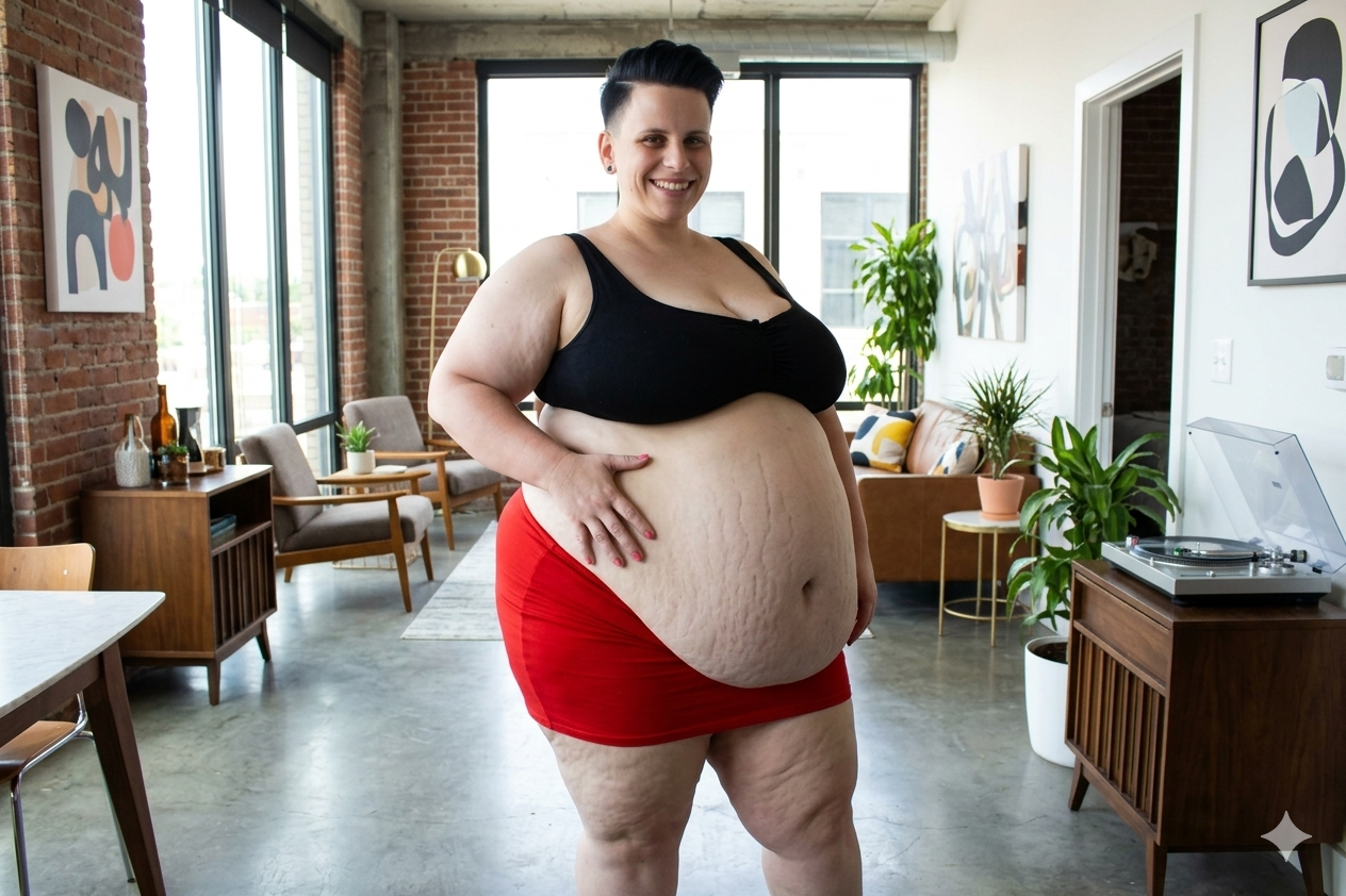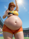 "Turn this image into an outdoor amateur photograph, changing the cartoon character into a realistic human with exaggerated body proportions. Preserve the exactly same composition, anatomy, pose and skin tone."