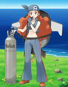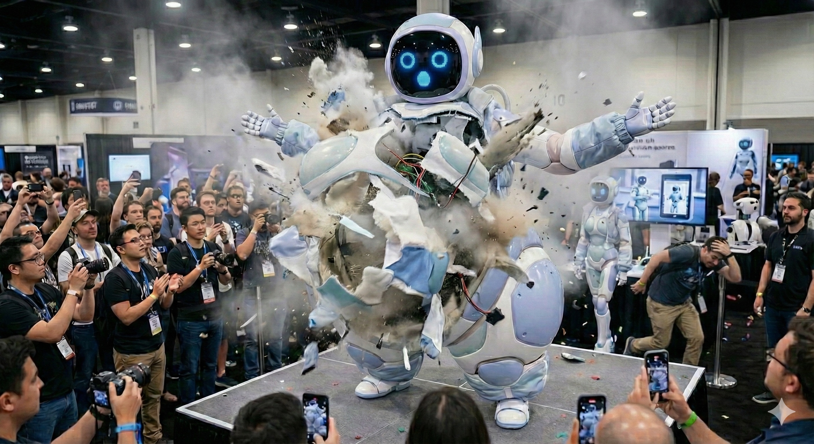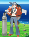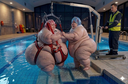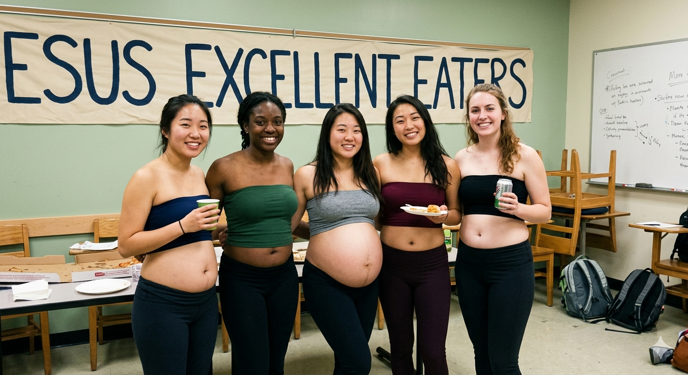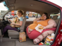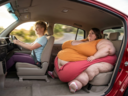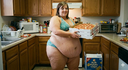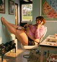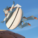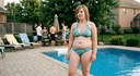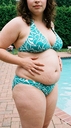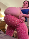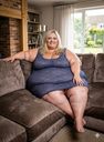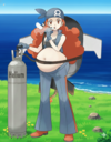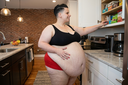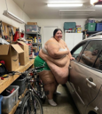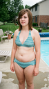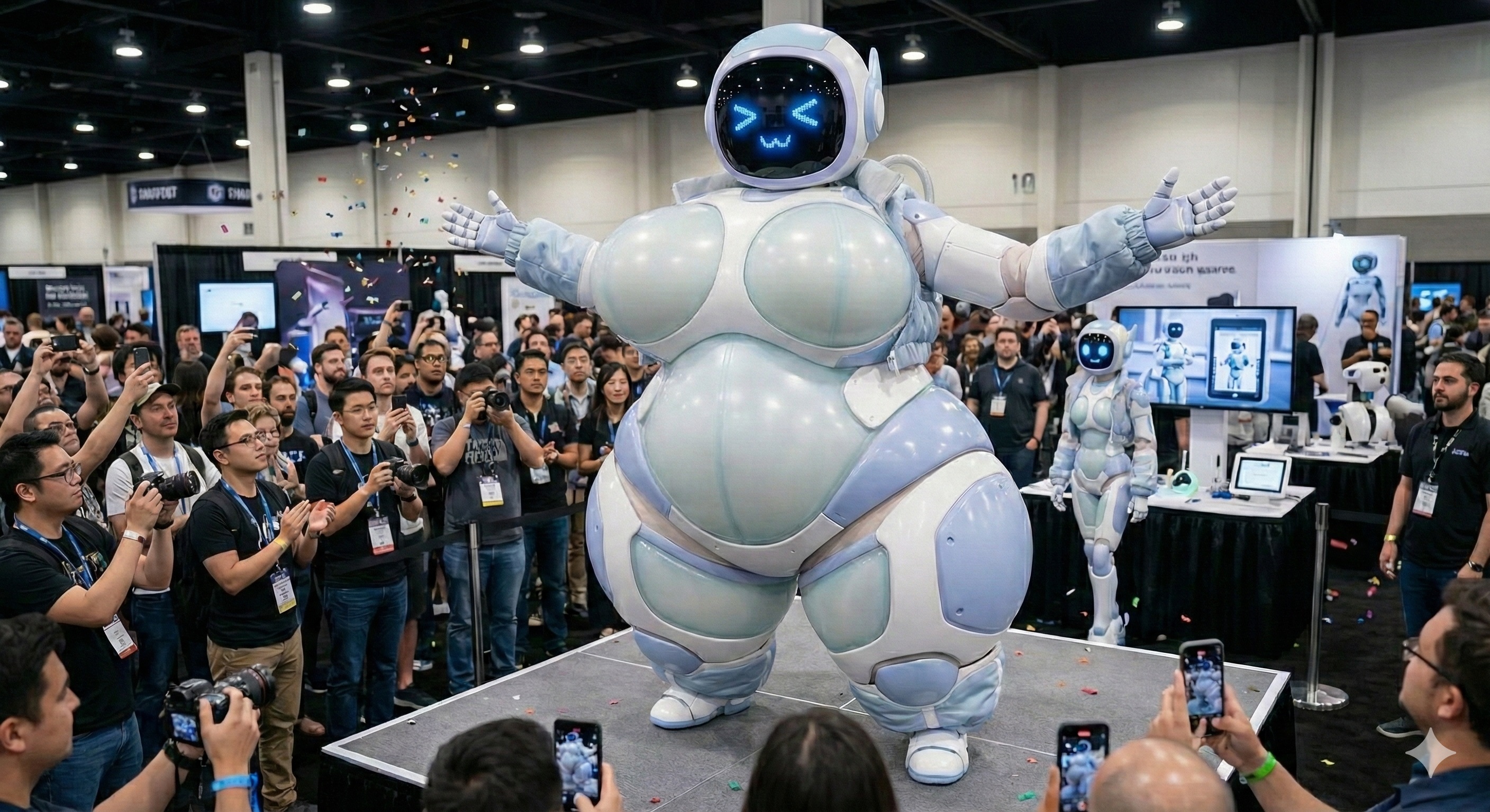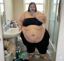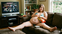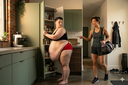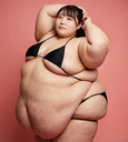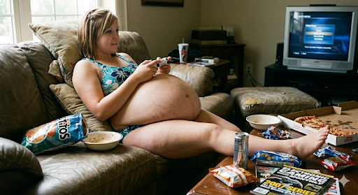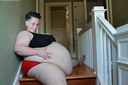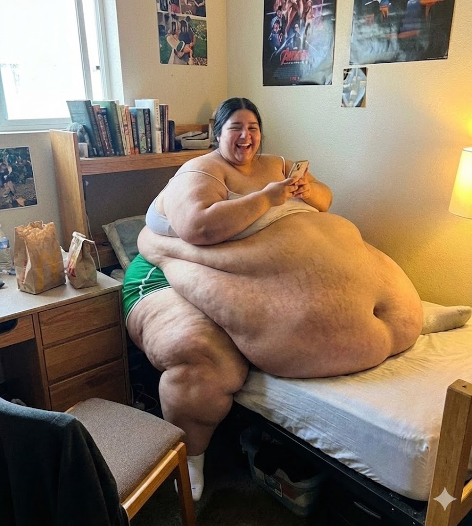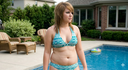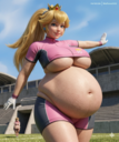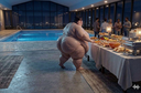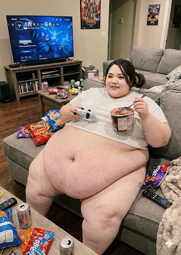 "Turn this image into an outdoor amateur photograph, changing the cartoon character into a realistic human with exaggerated body proportions. Preserve the exactly same composition, anatomy, pose and skin tone."