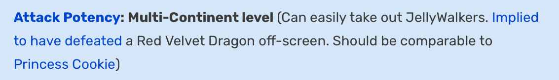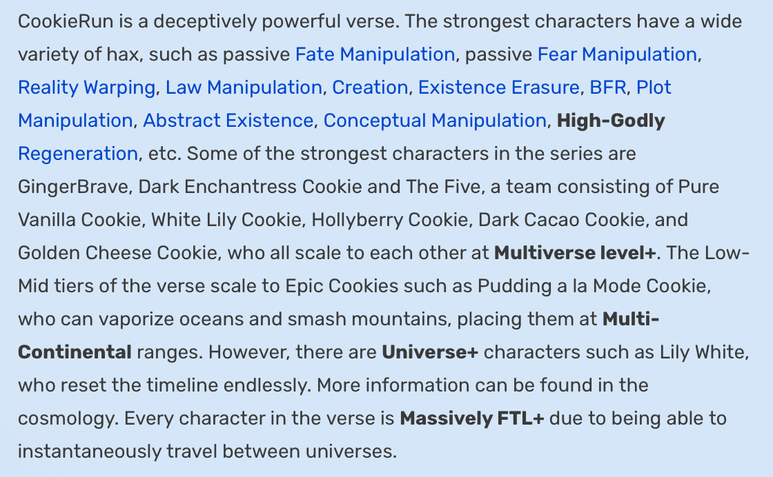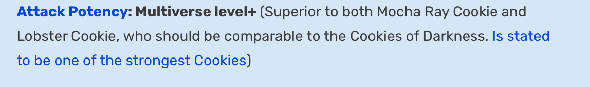 >>100445 >>100447 >>100240 Never expected my love for power-scaling to be combined with my kinks. Picking Cocoa Cookie here is super funny cuz, although she isn’t on the Vs Battle Wiki per se, she can keep up with other cookies, which means she can range from these two levels.
