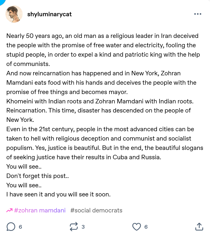 >>98327 Calling Mamdani the reincarnation of Ayatollah Khomeini is reaching John Birch Society-levels of right-wing delusion and hysteria. It's just embarrassing.