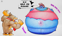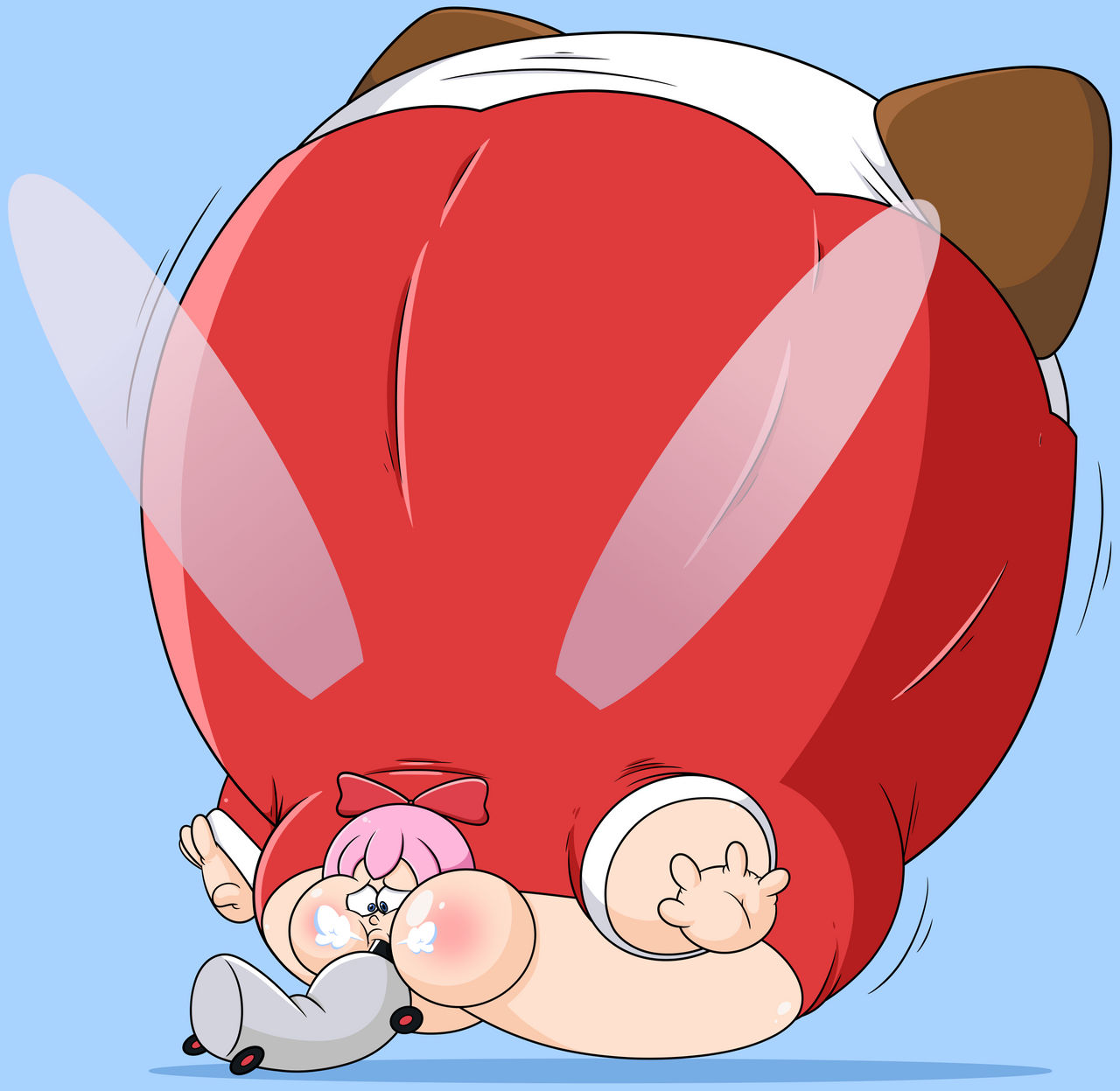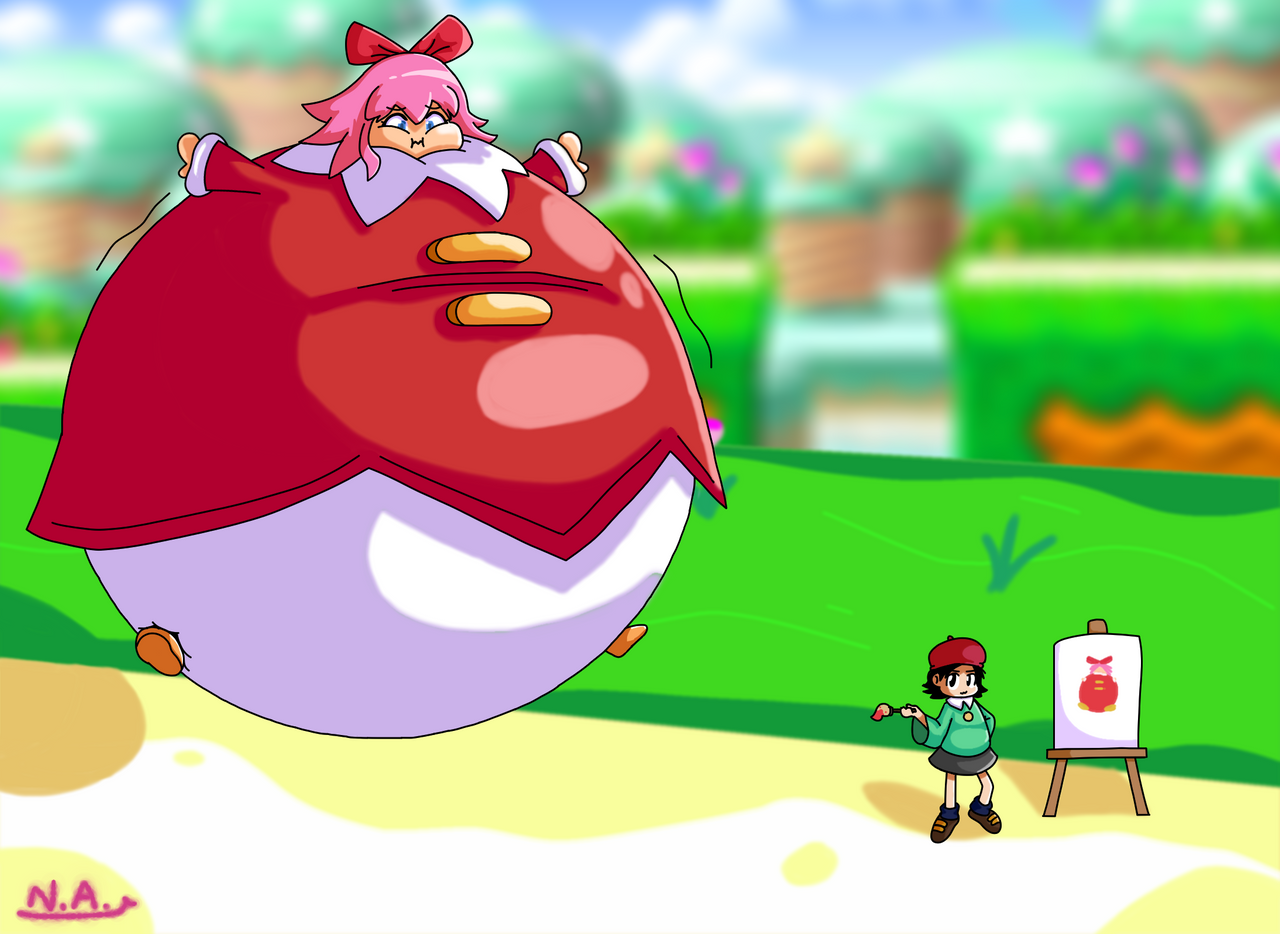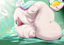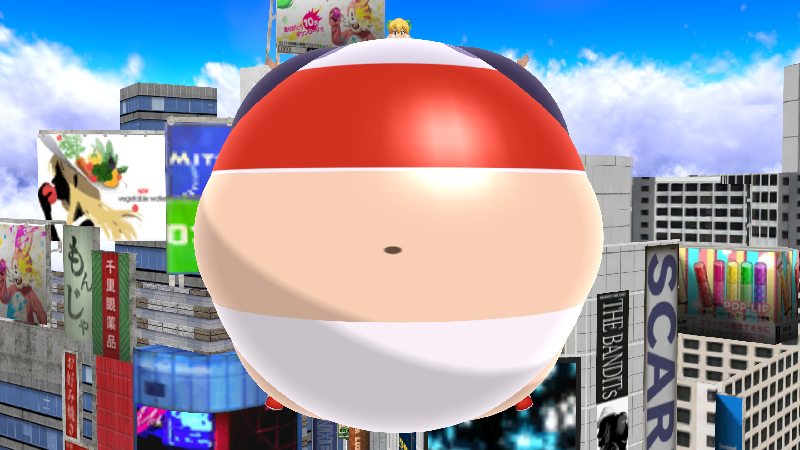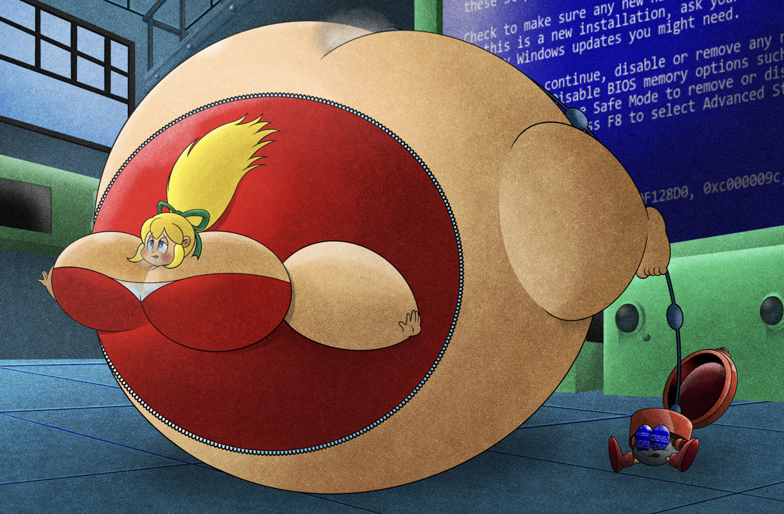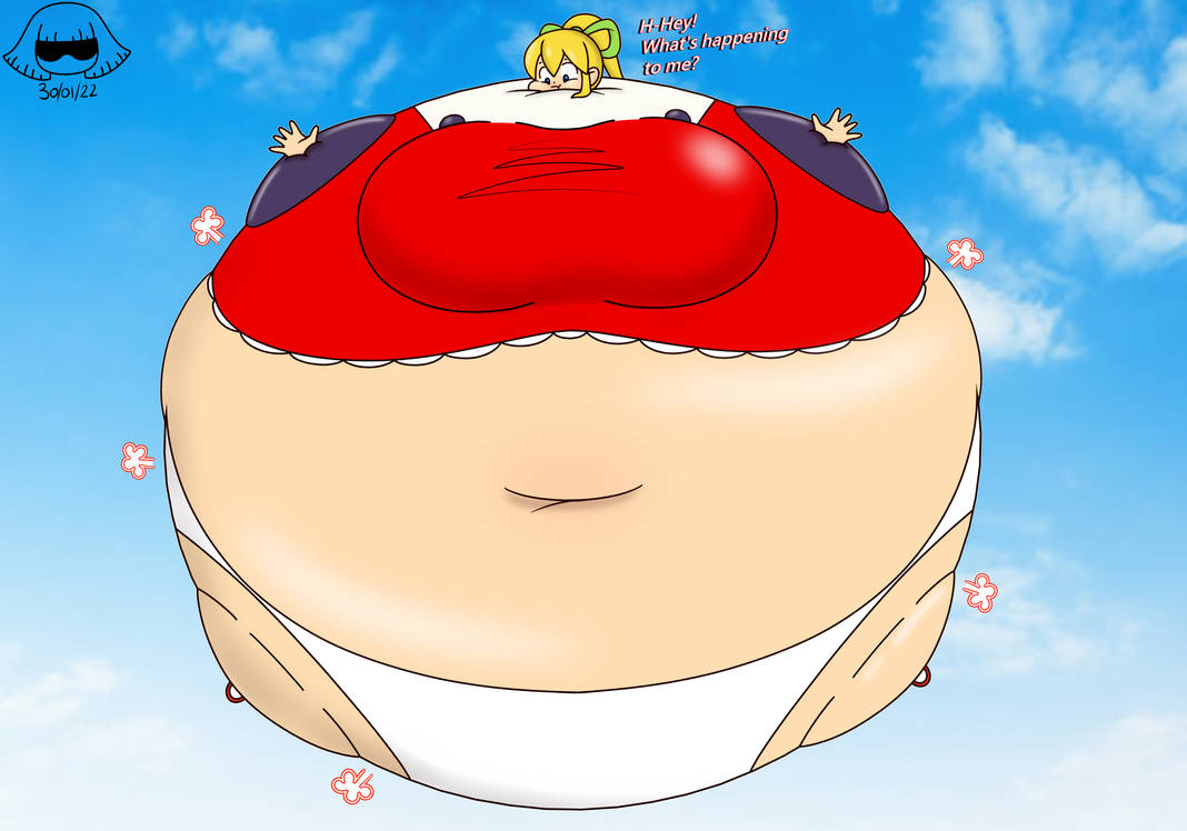 >she uselessly flails her hands and feet while her arms sink into her humongous body,whimpering in embarrassment all the while