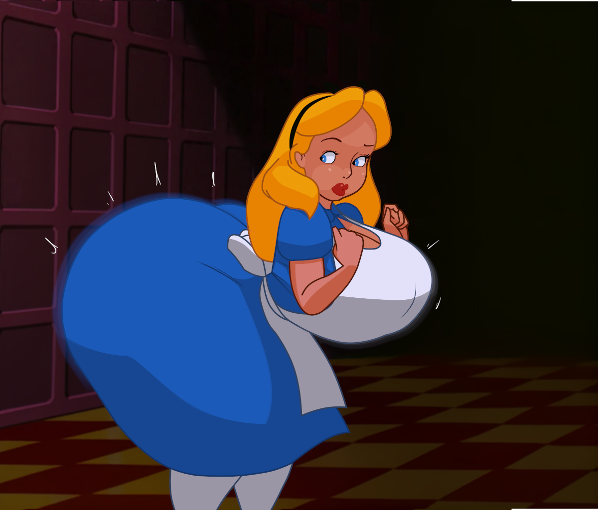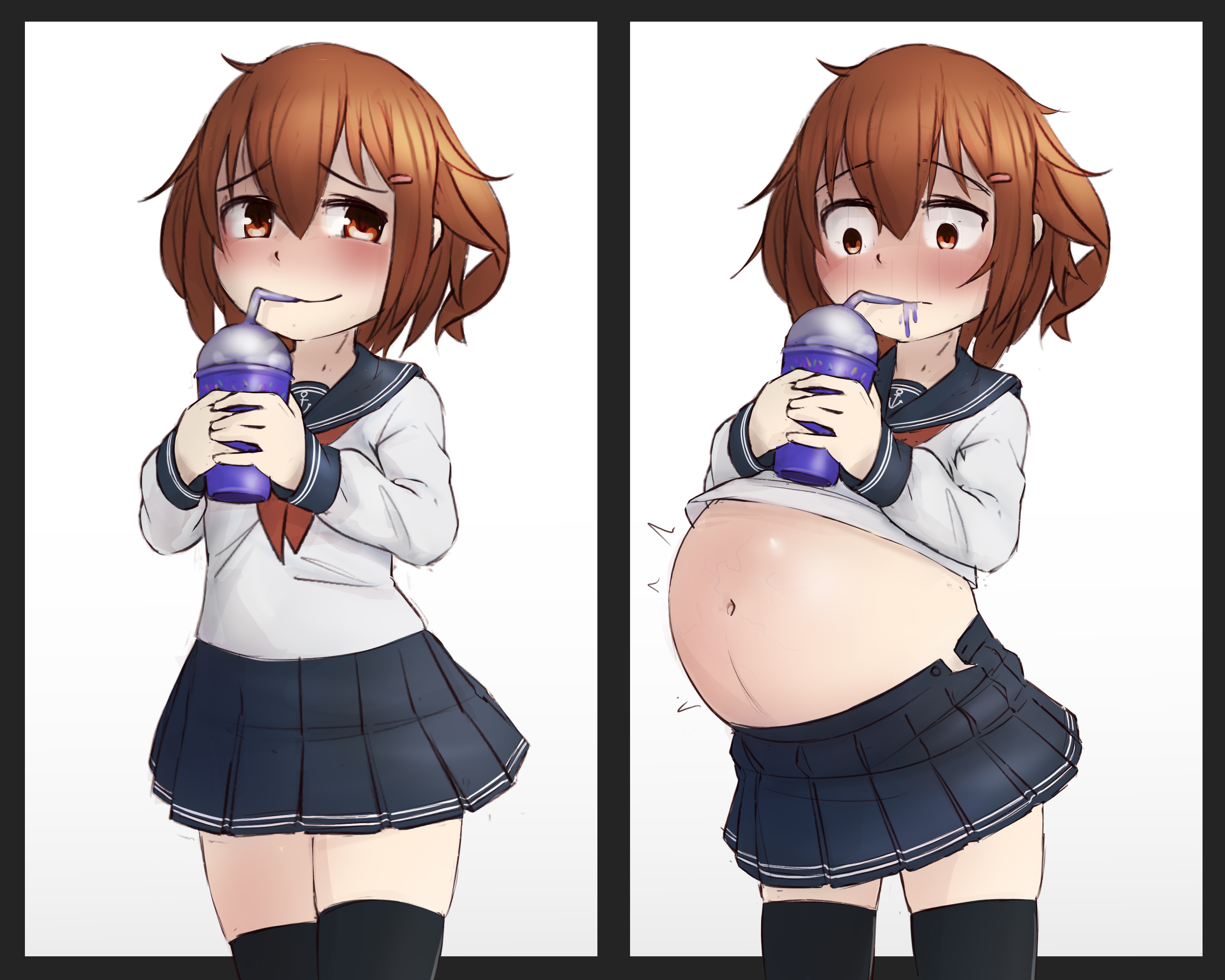 >her belly literally begins inflating as her small hands nervously hold onto it,almost like she's trying to hide it or keep it from expanding