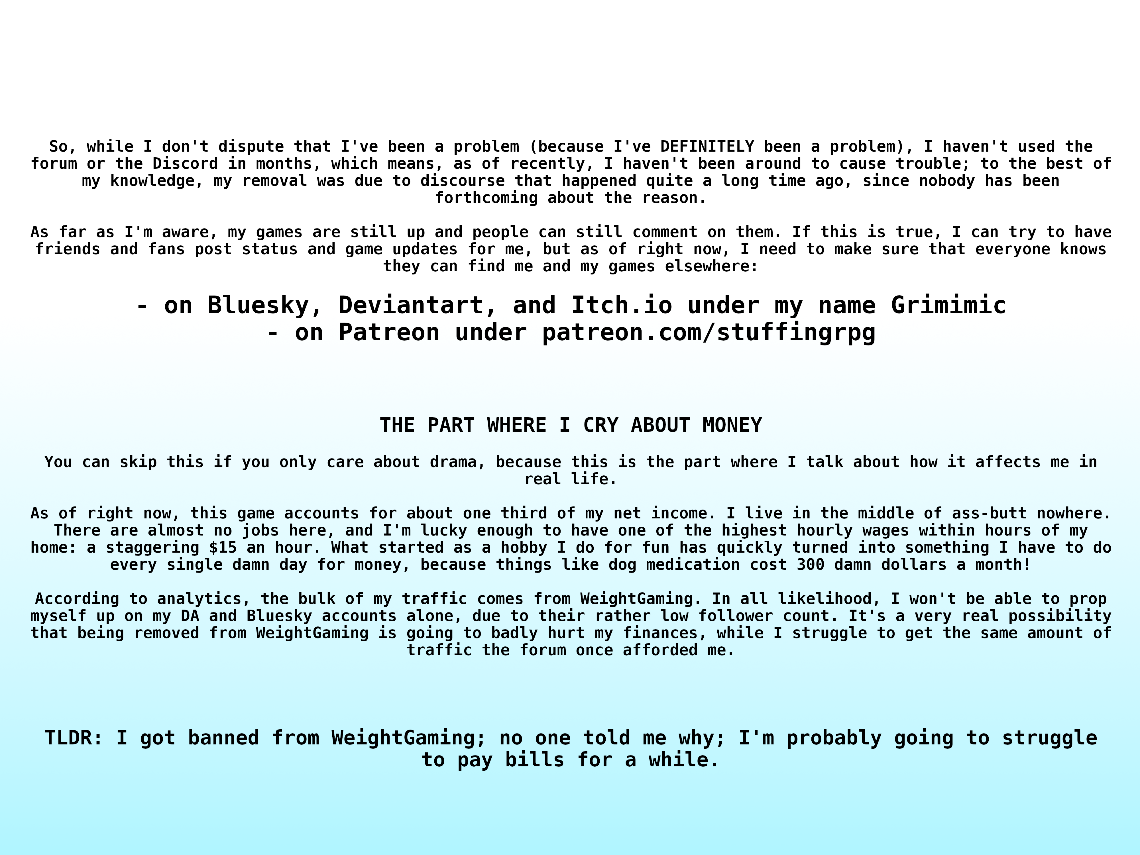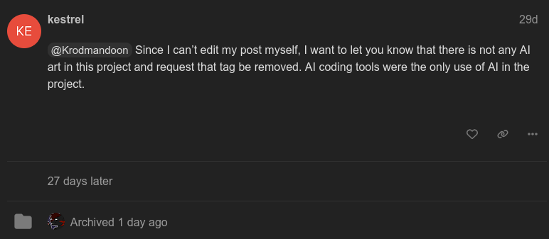 On paper, I get this. The tagging system isn't quite robust enough, this isn't ArchiveOfOurOwn. Probably why a big reason he wants to phase out the forums for a shop system. I think the big issue comes here comes down to is how much genAI is too much? Again, these are games, not art pieces. Does a game that uses genAI for a few placeholders must be toss in that section? What if they are removed, can they get out? What about music or code, does that get you put in Gay Baby Not-A-Real-Artist-Jail? And if it's about copyright and ripped assets, are fangames and the like kosher, or do they need their own section too?