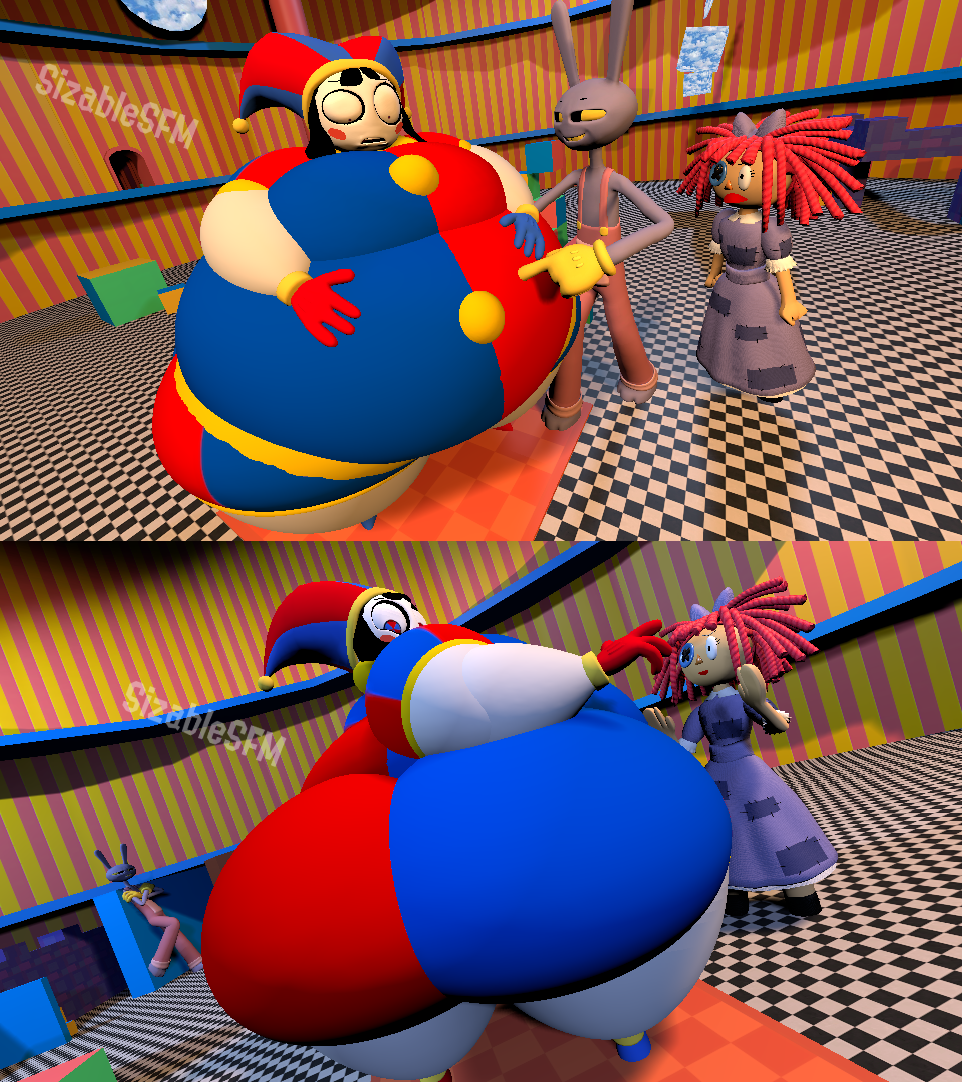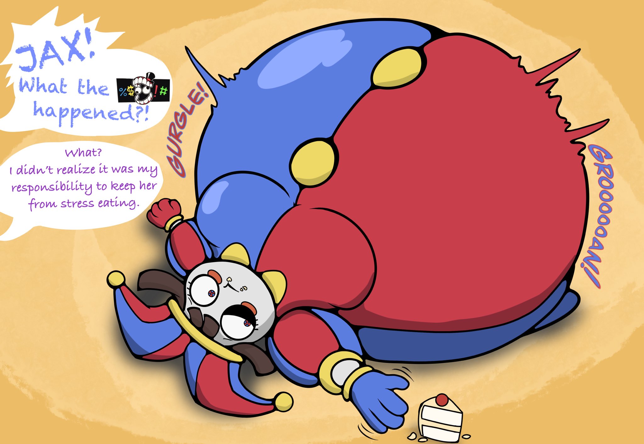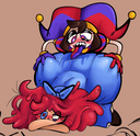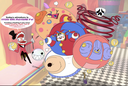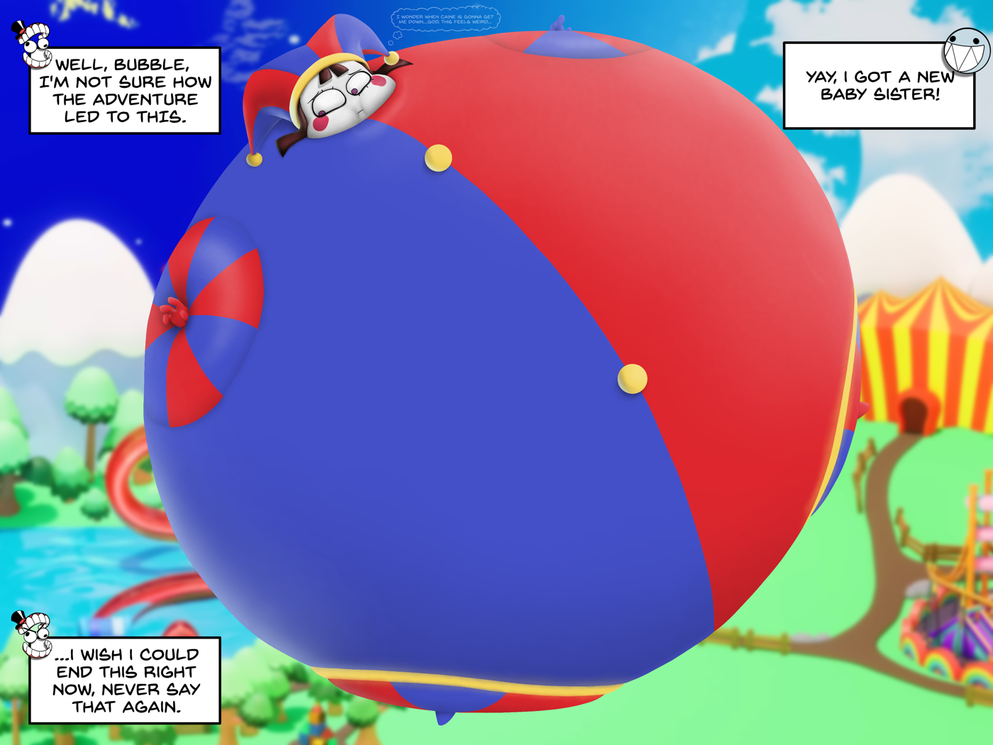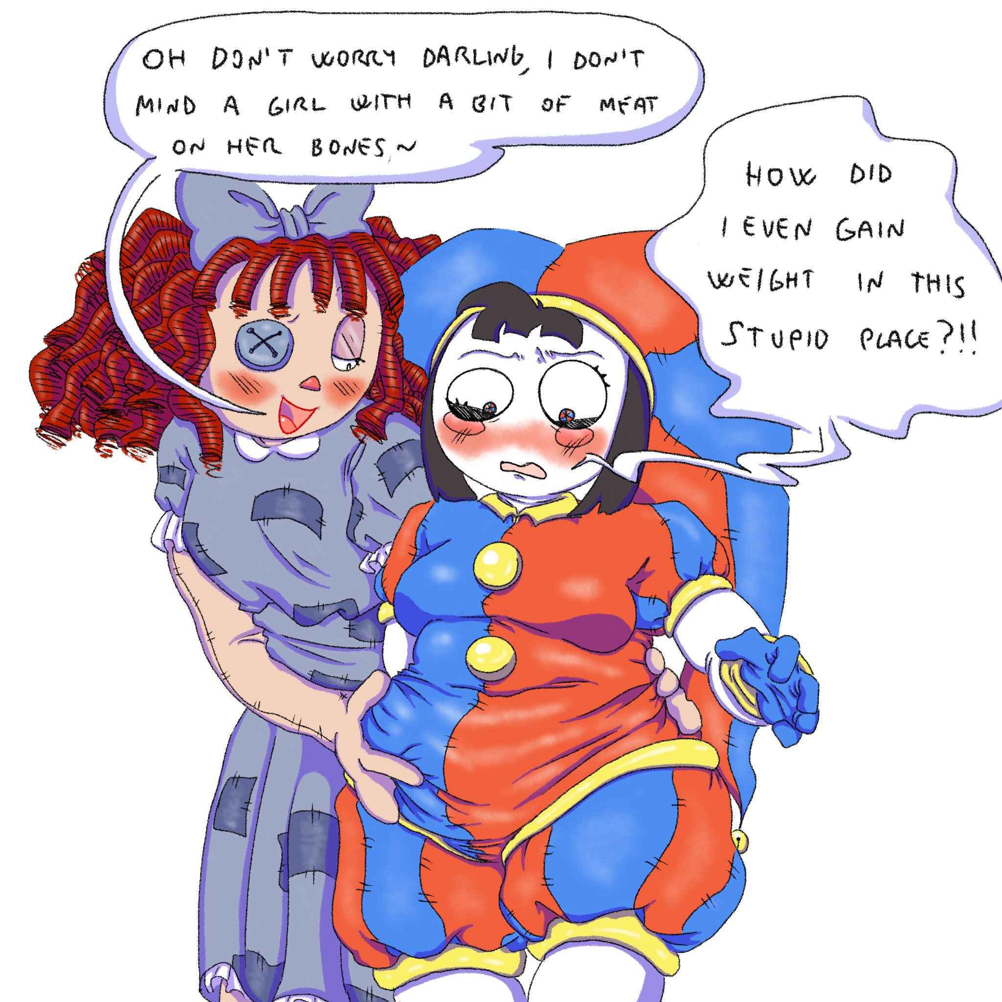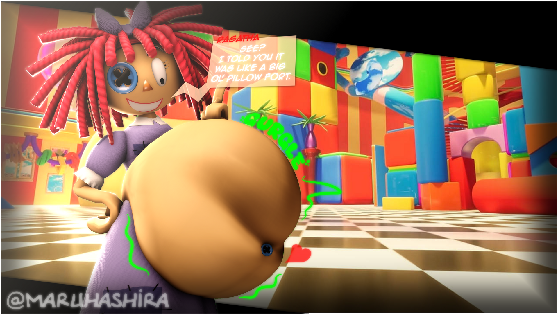 Jax seems to be enjoying what is happening, with Ragatha and Zooble swelling all over the chocolate puddle below and where they fell in. Inside, ragatha is wondering what's going on amidst the laughter of Jax, who seems to be enjoying the moment as the doll swells more and more. Zooble, on the other hand, simply disregards everything that's going on wondering various things, with Gangle watching her in a bit of surprise.