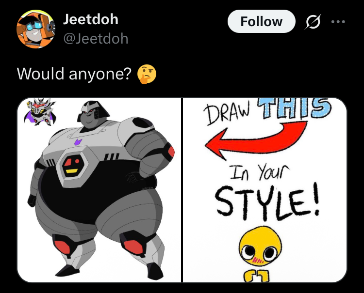 >this pizza bots thing mostly comes off as Jeet trying to shamelessly pedestal his own ocs in the hopes that if it gets popular Hasbro will graciously add them to a show or make toys of them