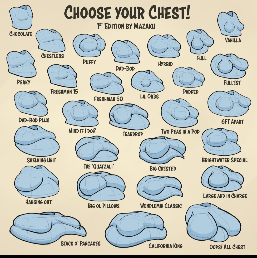 >>93198 I'd say start from vanilla, to padded, to mind if I do, to big chested, big ol pillows and end at california king and belly for whatever feels right, I reckon tbh for all of this to leave it up to the artist to decide :)