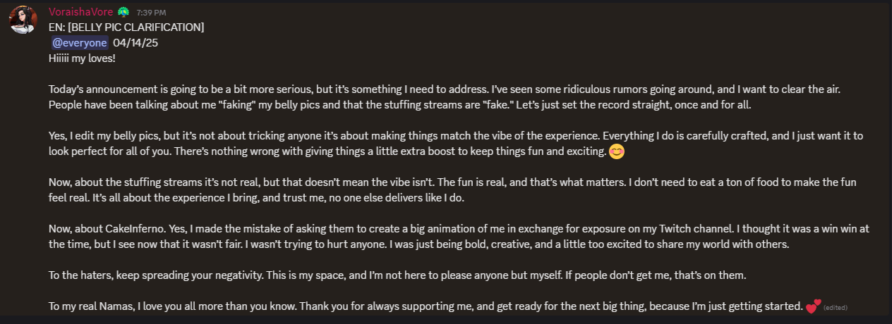 Thats... Kinda what i mean about her feats. The human body can eat more if its slowed down. If 140 prepped eggs in 10 minutes is doable then i suspect 150 over 3-4 hours is, especially based on similar records for long duration eating. I just doubt she is doing them, or at least not to the level she states. One thing that comes to mind is... Is she just simply pregnant? Like look at the timelines on this, the big "stuffing" run seemed to start round valentines day and its november now, that's coming up to 9 months and she... Does look 9 months pregnant. Someone is clearly helping her with all the background stuff on this and I highly doubt its her actual family, i cannot believe someones parents would be willing to support their daughters kink lifestyle like this, especially one that is relatively dangerous. That kinda limits it to a significant other who is also into it, which uh, means they're likely banging. I dont believe shes actively using a model for this stuff, that adds way too much risk because the model will understand they are kinda irreplaceable and end up asking for a lot or they'll spill the beans which just destroys your "buisness". Shes doing an announcement and redebut thing soon and i wonder if that will be a mysterious "im taking 6 months off stuffing challanges to lose weight and shrink my belly" while she has the baby. Thanks for the insider info as well, ex moderator. That ties up with some of what id heard. A few artists on other discords im in were hit by jer wiping thebols fanart and comms because that is their advertising as well and were not thrilled about it. I dont wish voraisha any bad i just... Want to know how honest it all is really. Its clearly RP but embellishing it all to this extent to trick people seems dishonest.