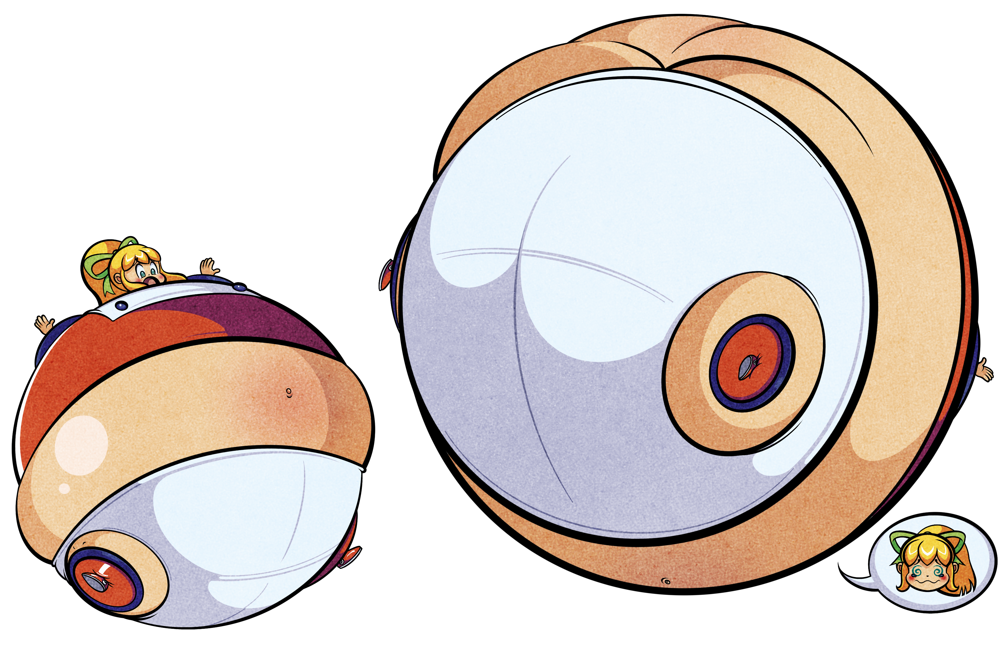 >her bashful cheeks puff up as her overalls and t-shirt start stretching to accommodate her growth