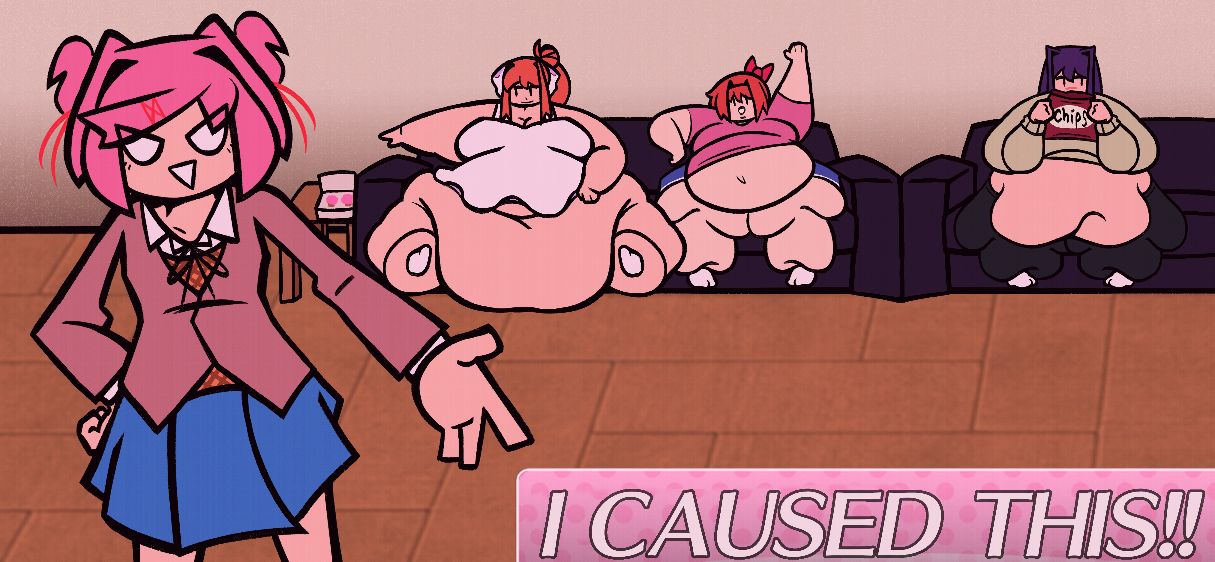 I kind of wish there was a fan game where you could have all four of them in a harem and date all of them. Sort of like Monika After Story but its all four girls and they can gain weight and have more interactions beyond just playing simple games like Pong and Chess.