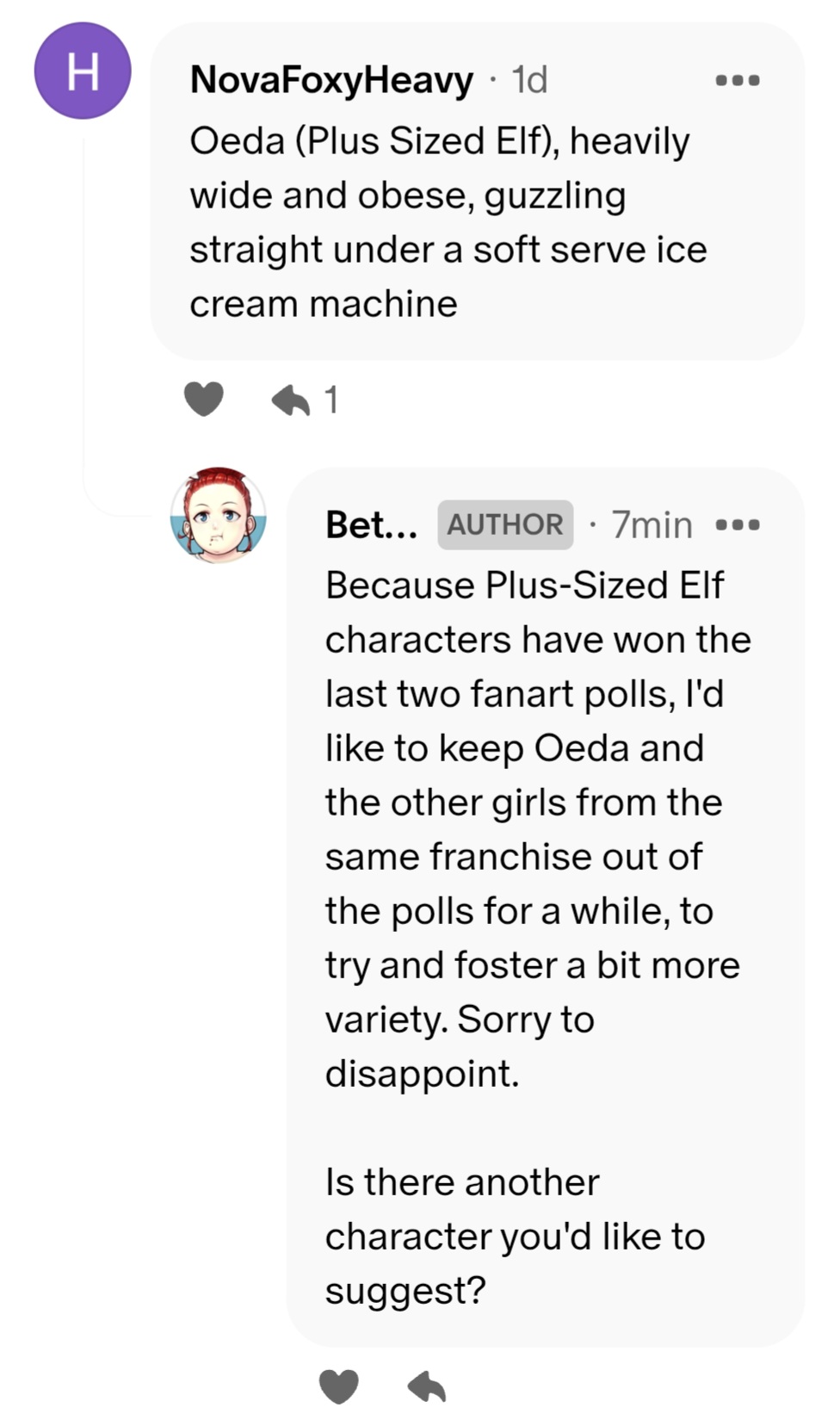 >>297423 I've only been subscribed to two patreons in my life so I'm probably not the target audience for this, but I do feel secondhand disappointment reading the no responses from bws. When I started getting commissions there were a couple of times where I'd present message an artist saying "these are the scenarios I have in mind, which would you like to draw?" thinking that I wouldn't mind which they picked, and that if I liked their art I wouldn't mind which they went with. But I quickly realised that I felt disappointed regardless, and that "something I came up with" isn't as satisfying as "something I really want." If I'm paying for art, I'm not willing to compromise anymore on the big picture. This has made me more selective with who I work with, but I've found that I haven't been disappointed since. It might be a little bit different for people who are willing to pay for a monthly serving of salt whether he draws what they want or not, but I'm not a fan of how he does business, which is why I'm here in the peanut gallery with the rest of the pirates instead of his patreon.