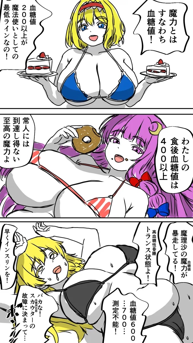 Wonder if anyone has this pic. It was a pic of Patchouli where she has alot of junk fast food floating around her. She looks bloated. Think her dress was ripped at the seams too. I also remember seeing Koakuma looking at her surprised. There were also sketches done by the same artist (i think) where she was fatter too.