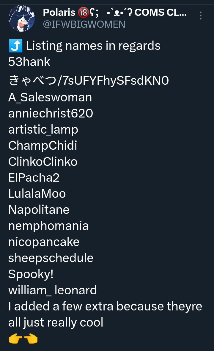 https://x.com/ShibiNSFW/status/1856538834961391983?s=20 Shibi's NSFW replying to the comm https://x.com/ImmyBisouNSFW/status/1825371673274528221?s=20 Immy responding to her own. https://x.com/ModisteNSFW/status/1880525883246801197?s=20 Mercy responding to her own- unfortunately her stream reaction is a membas only so sorry folks. Looking specifically but if you scroll Azura's NSFW retweet's you'll hers as well. https://x.com/StronnyNSFW/status/1846283603258581326?s=20 And just to ensure, Stronny's response from her livestream. Icey's reaction is from a deleted stream, but it was from the fashion game, Infinity Nikki. Can't help there unfortunately. I did not record them though, and for that, I can only apologize fellow kings and queens.