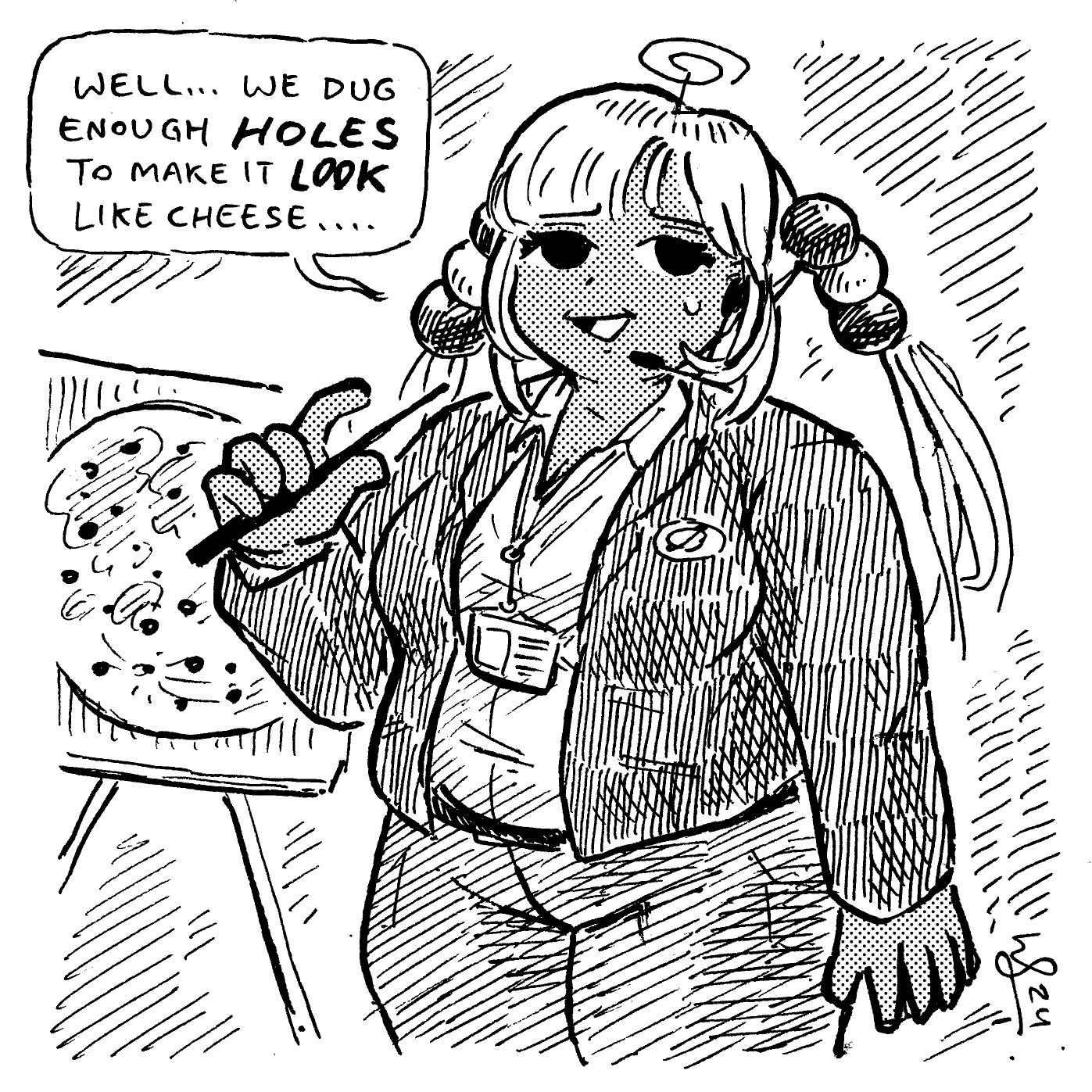 Originally pregnant but removed any implication to make it look like she's just stuffed.