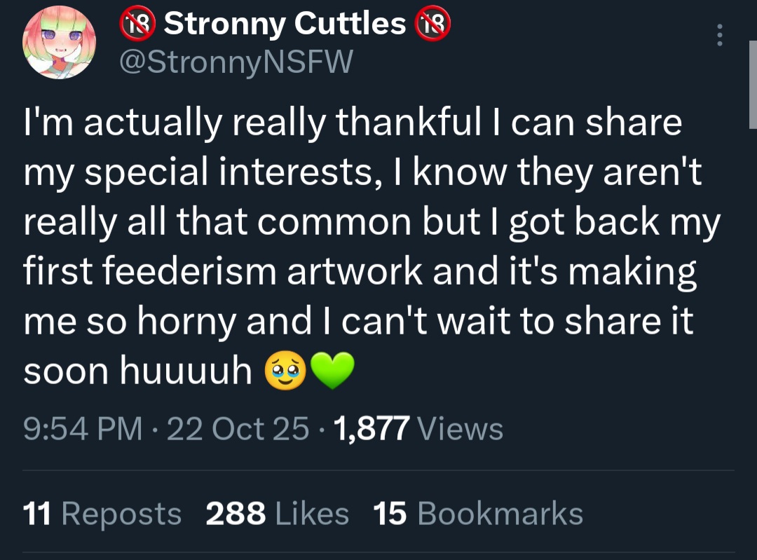 >>262358 It's funny how her alt acct has more followers than her main acct. She's been taking up comms recently, if anyone is interested. X Handle is @IFWBIGWOMEN