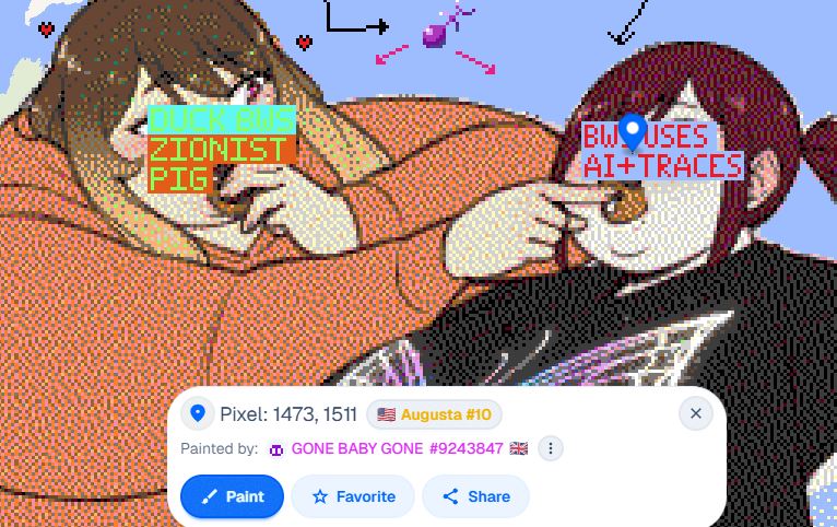 Someone is deleting my Kim Pine art, if you want you can help. https://wplace.live/?lat=43.858043521394286&lng=-69.51506869072266&zoom=13.46302774604209